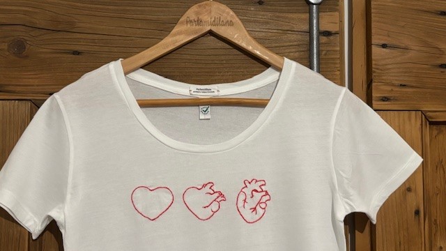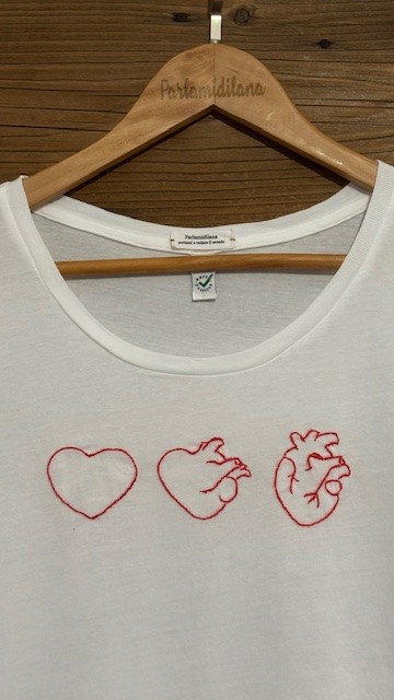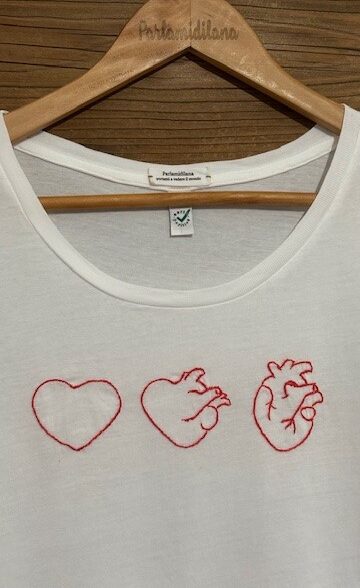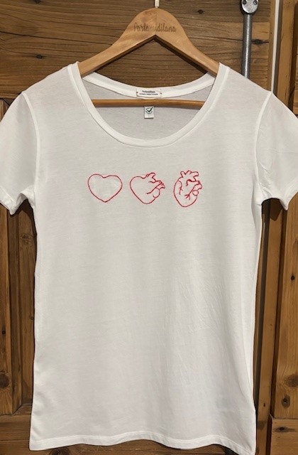 T-shirt “3 CUORI DA NORMALE A ANATOMICO” ricamata a mano. Vedi tabella TAGLIE in galleria foto