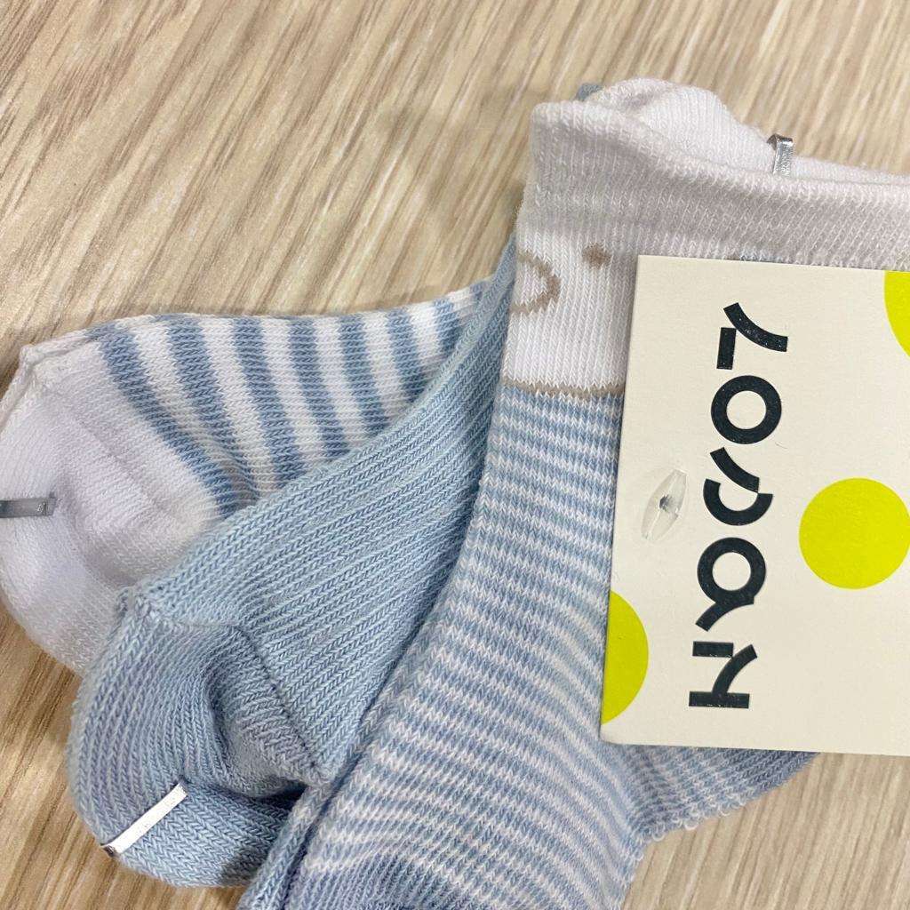 3 pack calzini neonato in caldo cotone di colore azzurro e bianco. 69% Cotone. 28% Poliestere. 3% Elastane.