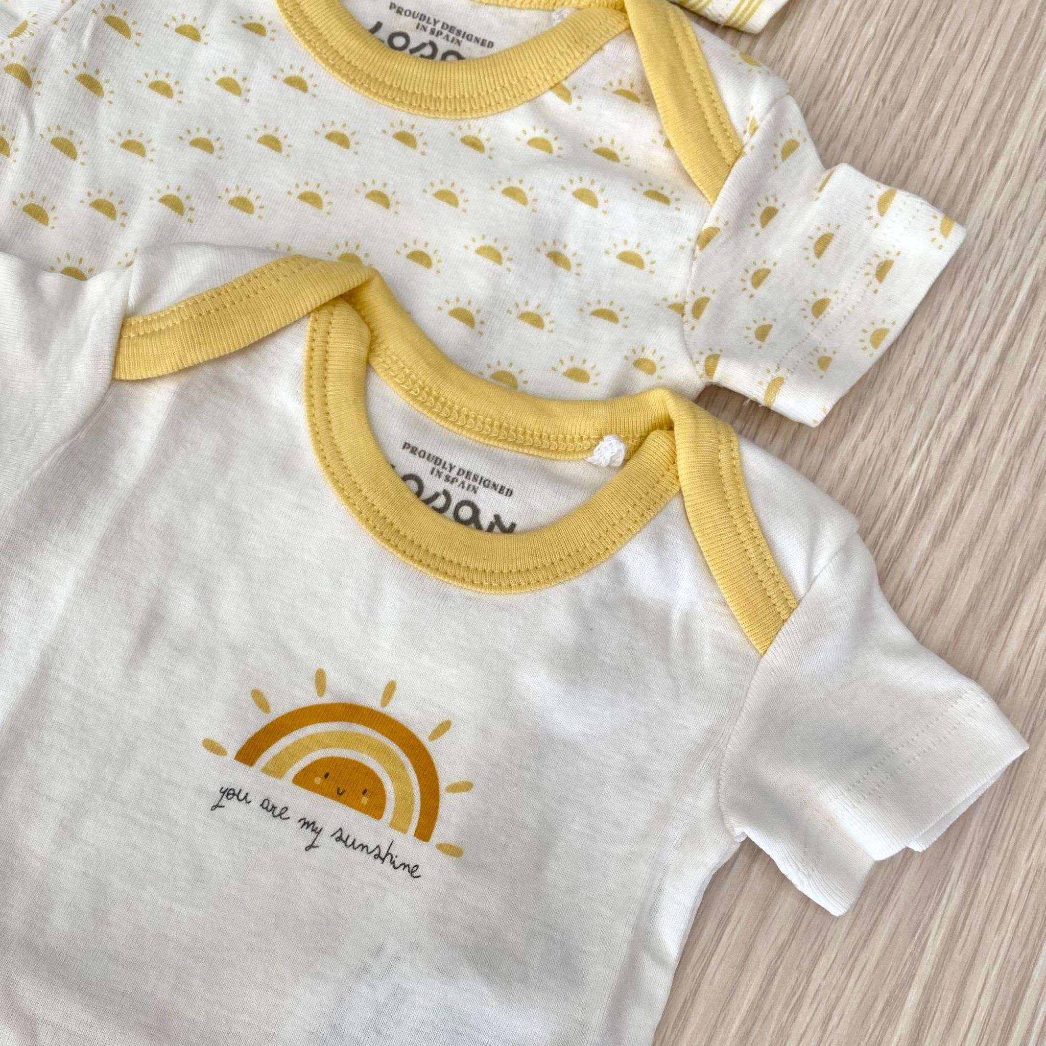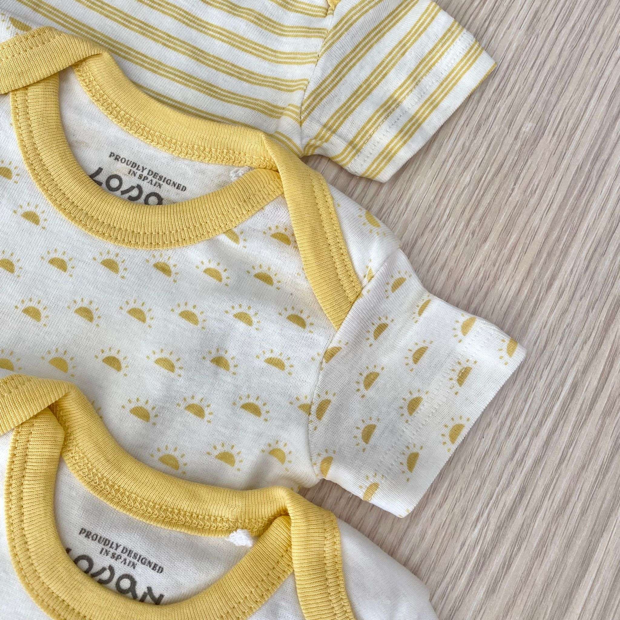 3 pack di body neonato/a/bambino/a in cotone, di colore panna e giallo con disegno di vari colori.