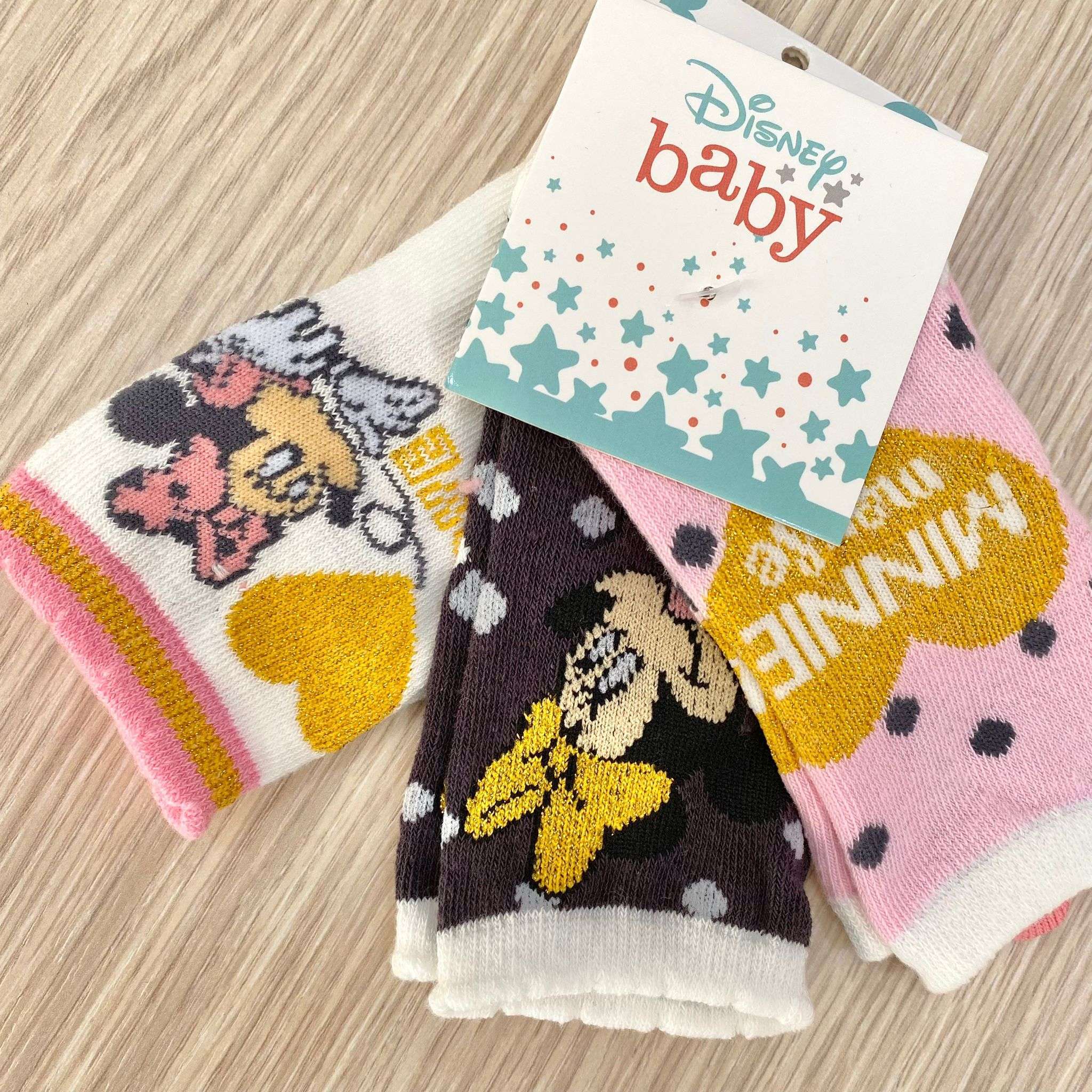 3 Pack di calzini neonata/bambina in caldo cotone, di vari colori, con disegno Minnie e filo glitterato. 70% Cotone. 23% Poliestere. 5% Poliammide. 2% Elastane.