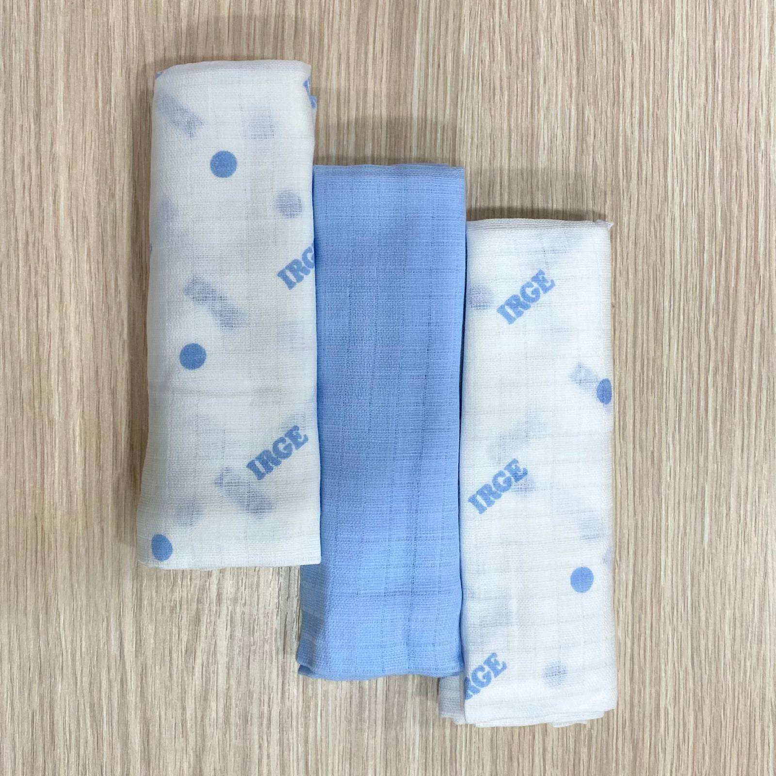 3 pack di quadrati di garza di colore bianco e azzurro. Il quadrato di garza è un asciugamano per il neonato in morbidissimo cotone sanitario. Misure: 75×75 cm. 100% cotone.