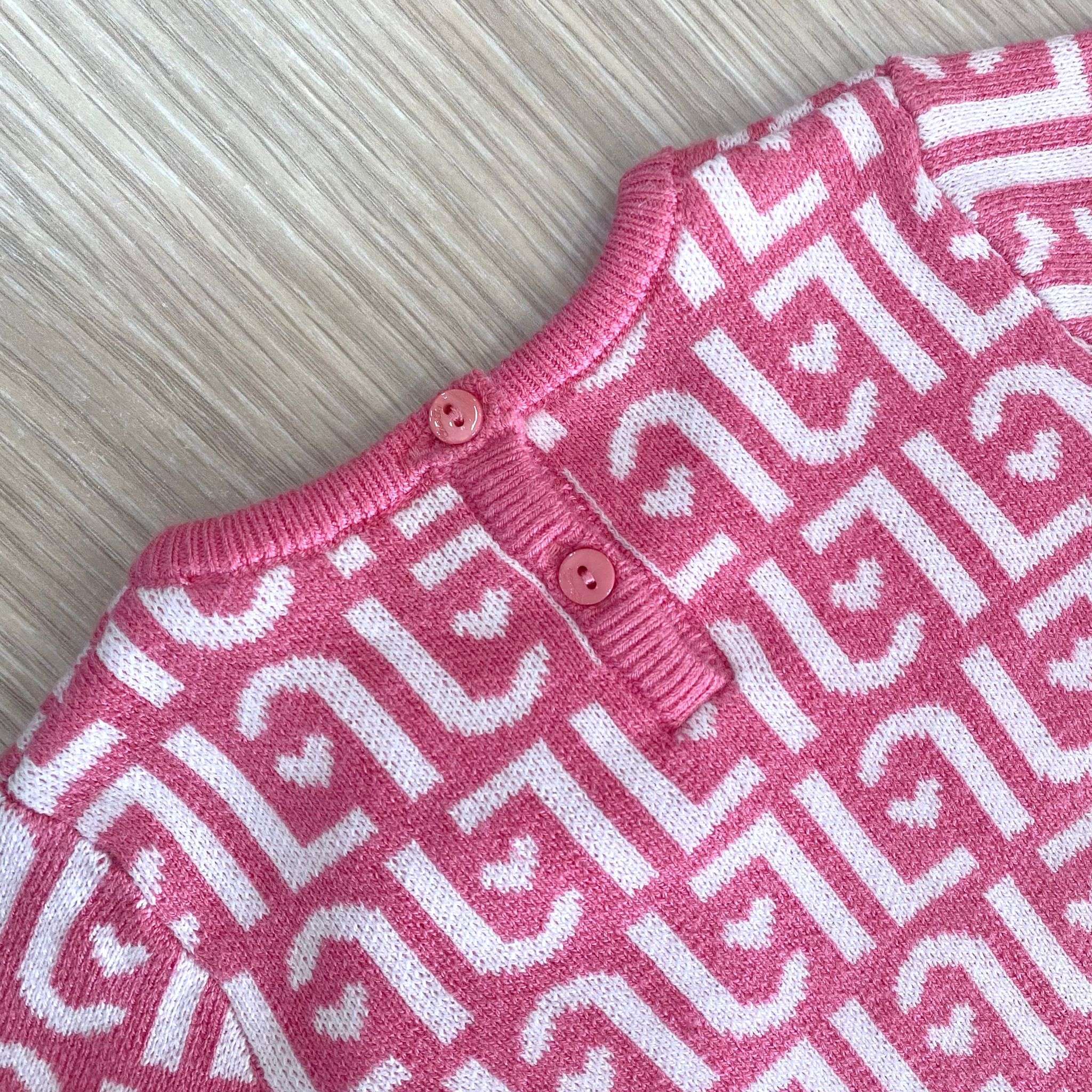 Abitino in maglia neonata/bambina in caldo cotone, di colore rosa e bianco, con dettaglio del fiocchetto sullo scollo e le balze sul fondo aggiungono un tocco romantico. Apertura con bottoncini. 50% Viscosa. 30% Cotone. 20% Poliammide.