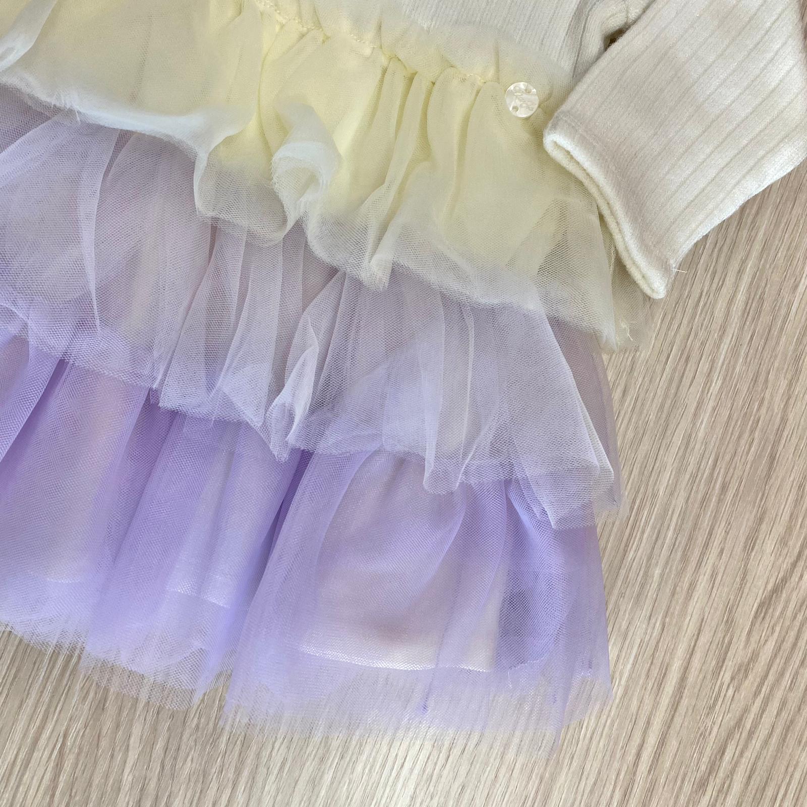 Abitino neonata/bambina in caldo cotone, di colore burro e glicine, con applicazione di tulle, chiusura con cerniera., con applicazione di orsetto in rilievo. Abitino foderato al tulle.