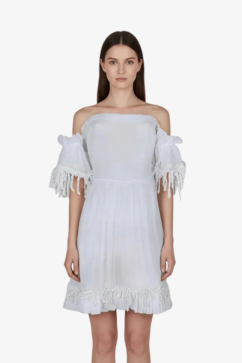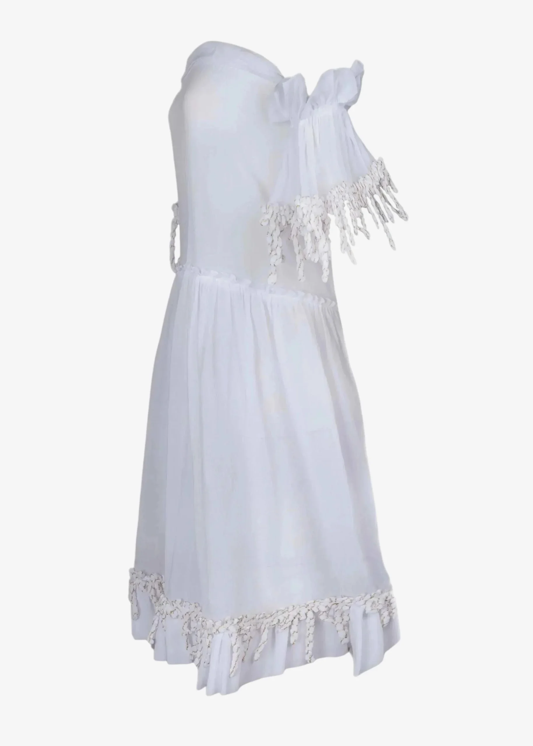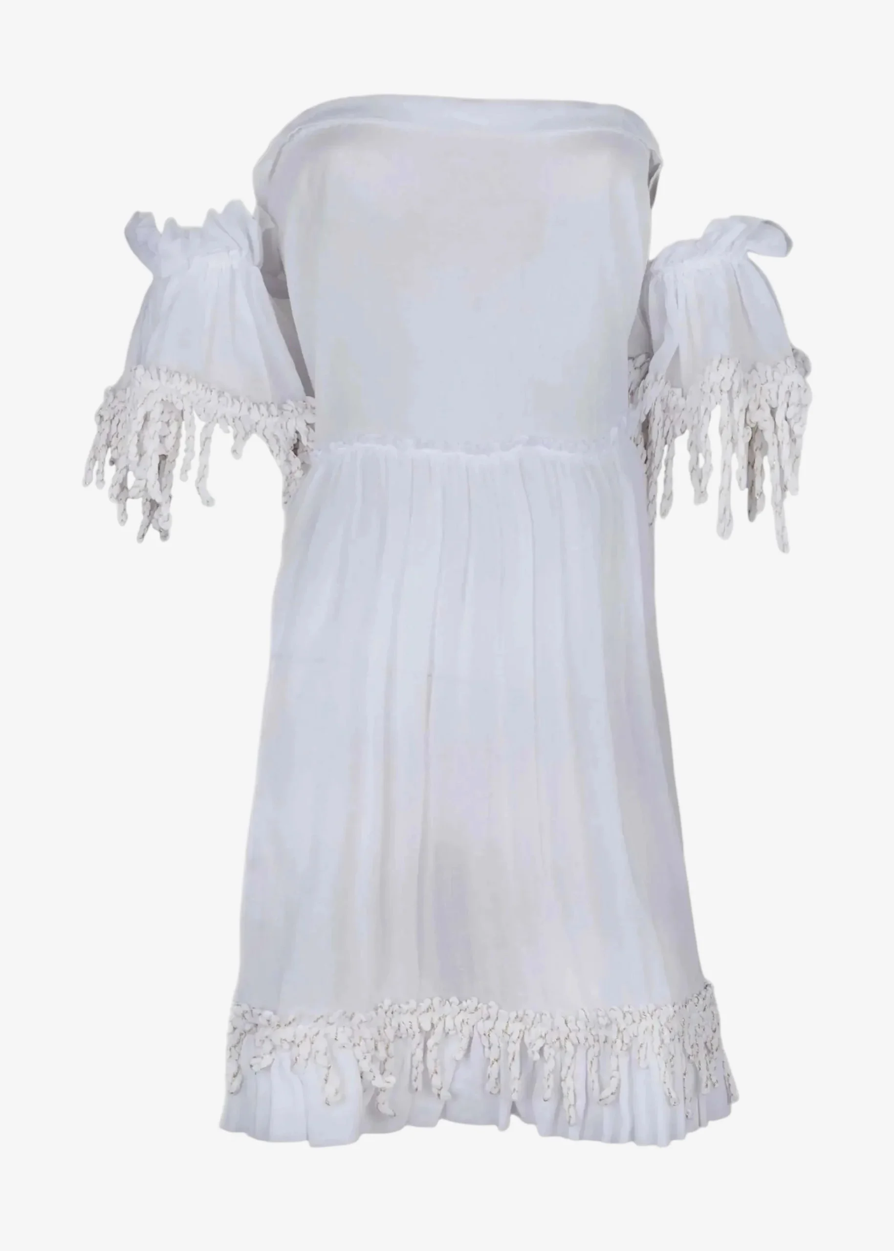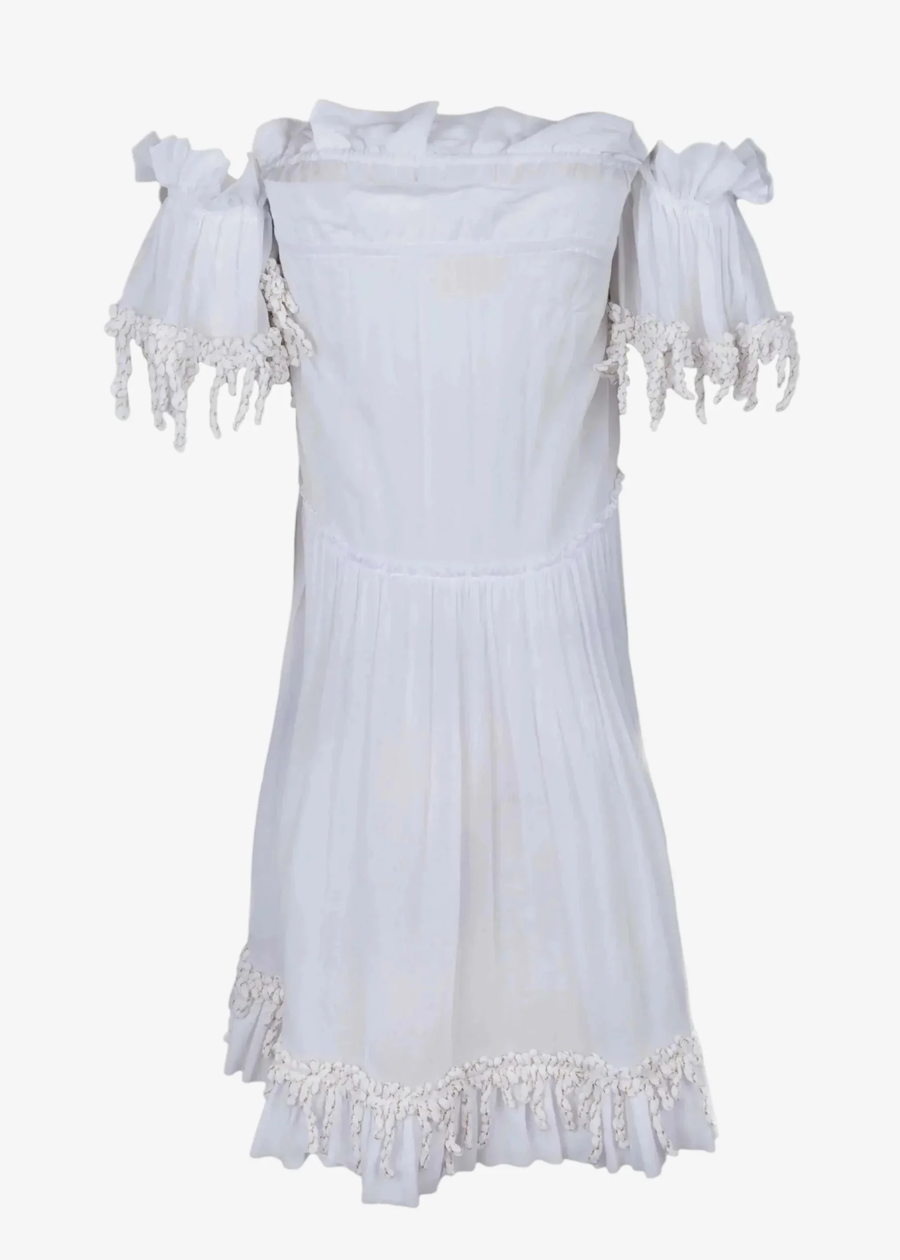 Abito corto Emamò bianco con maniche frou frou impreziosite da applicazioni in lurex oro, perfetto per un look elegante e raffinato.