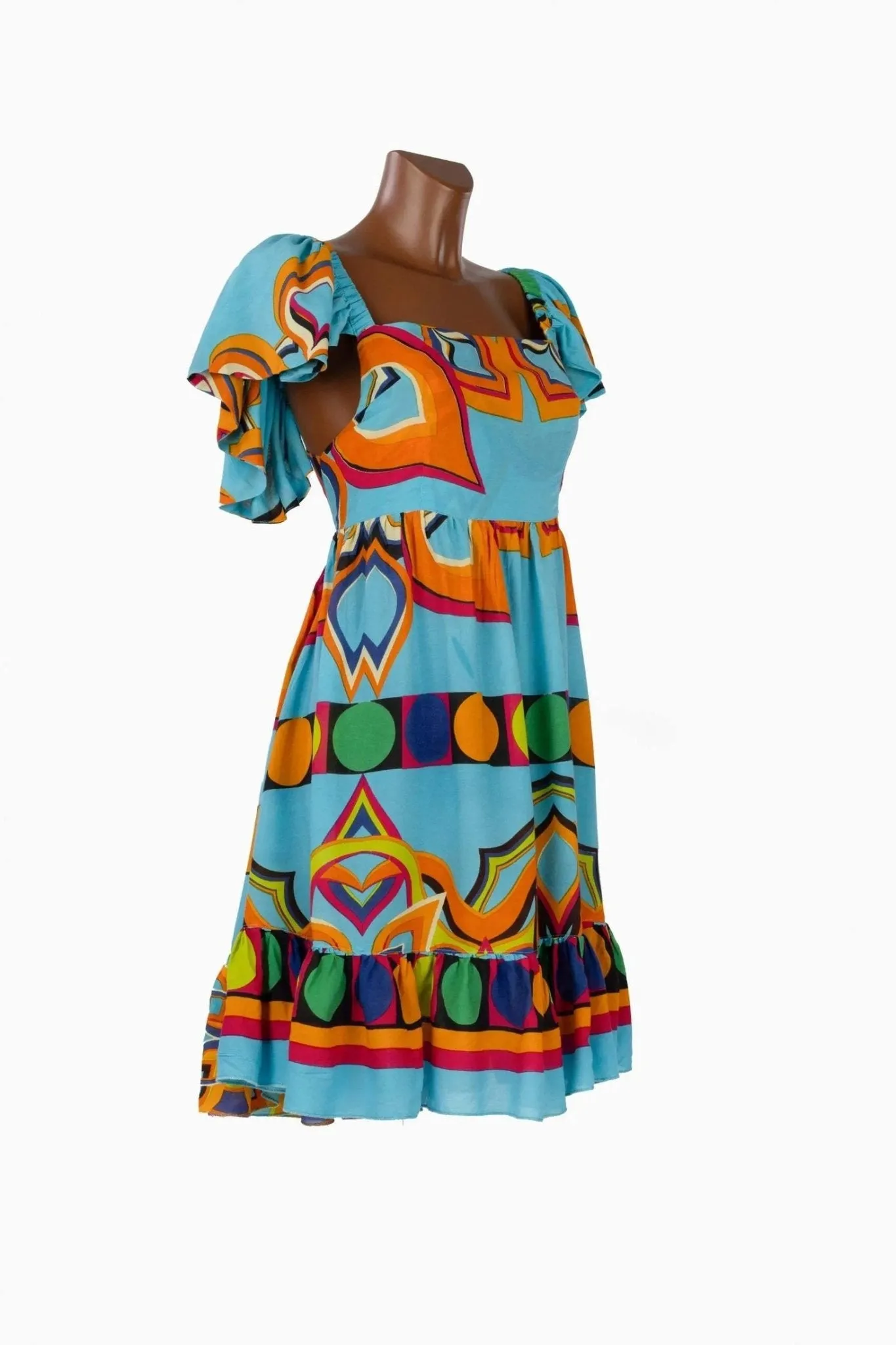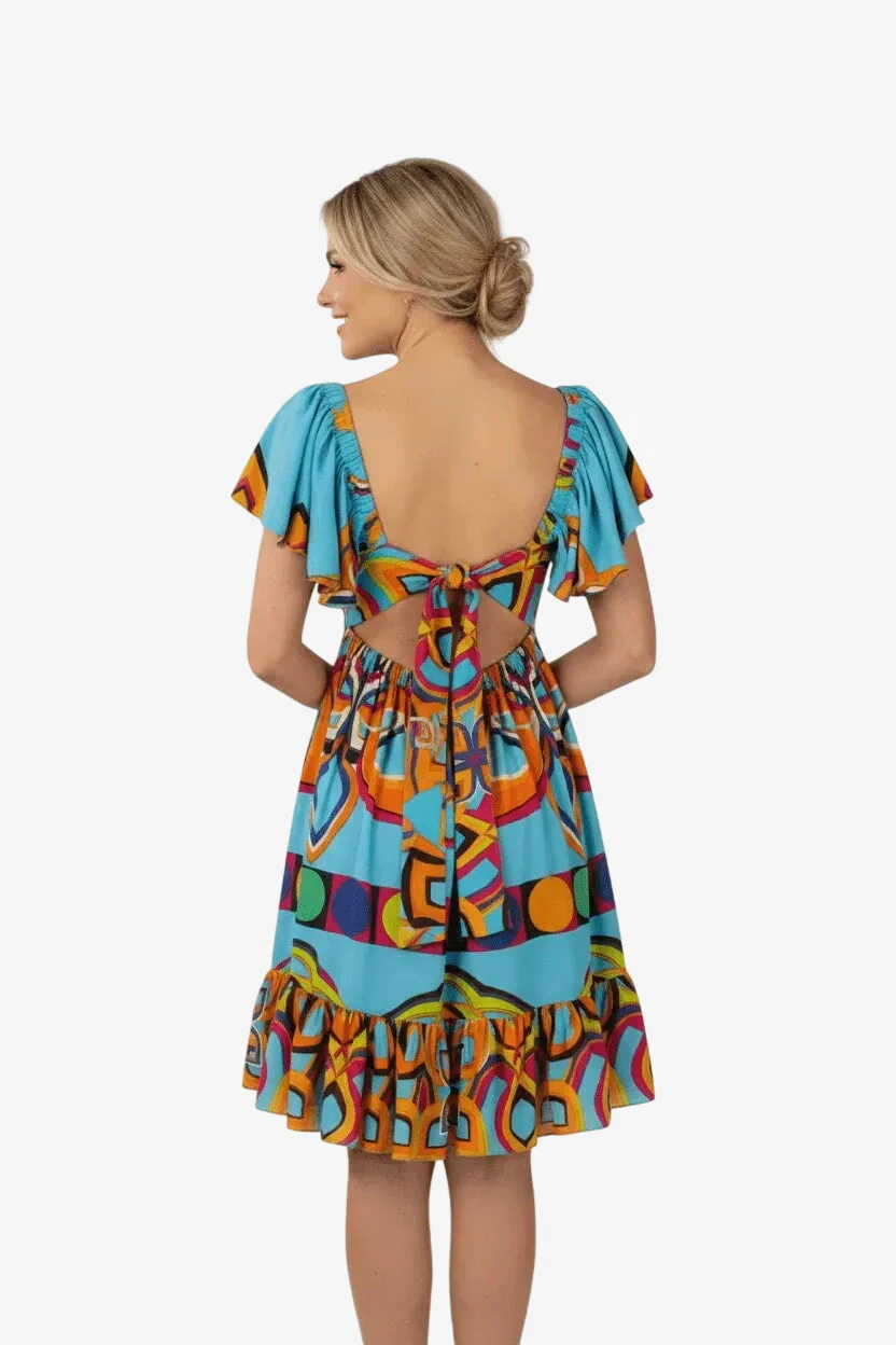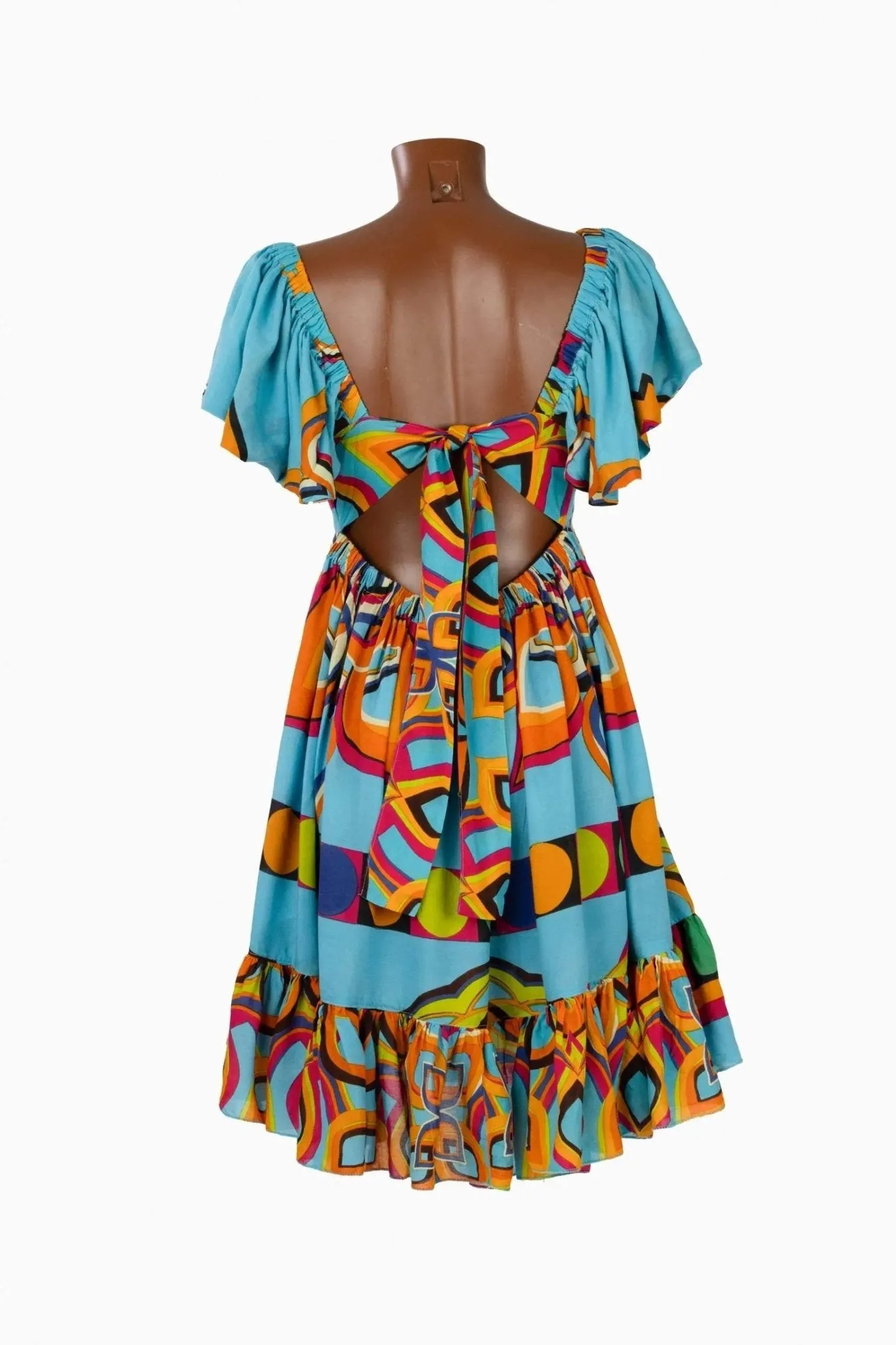 Abito corto Panaji scollato sulla schiena con deliziosi volant sulle spalle, perfetto per un look elegante e femminile.