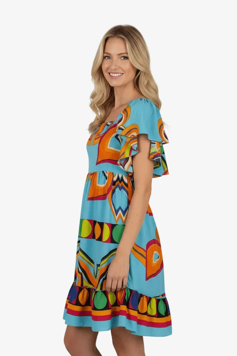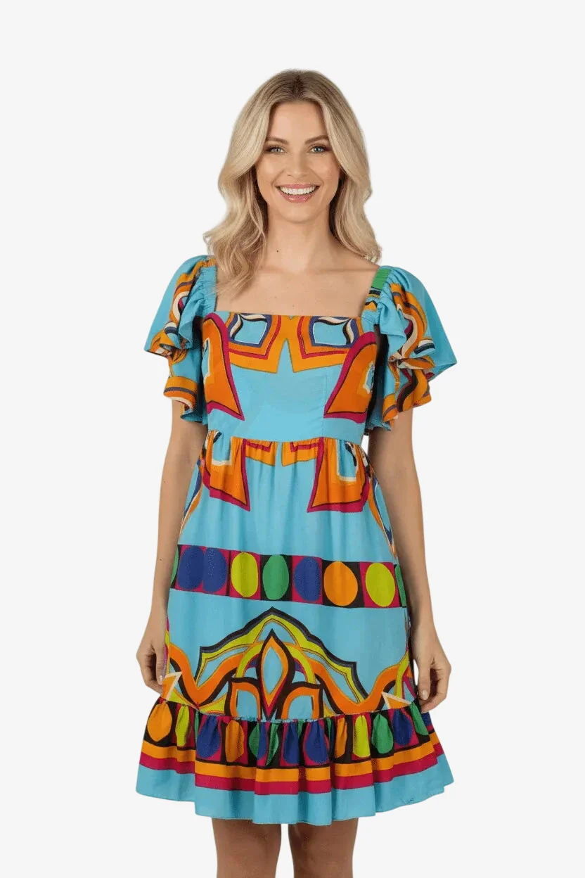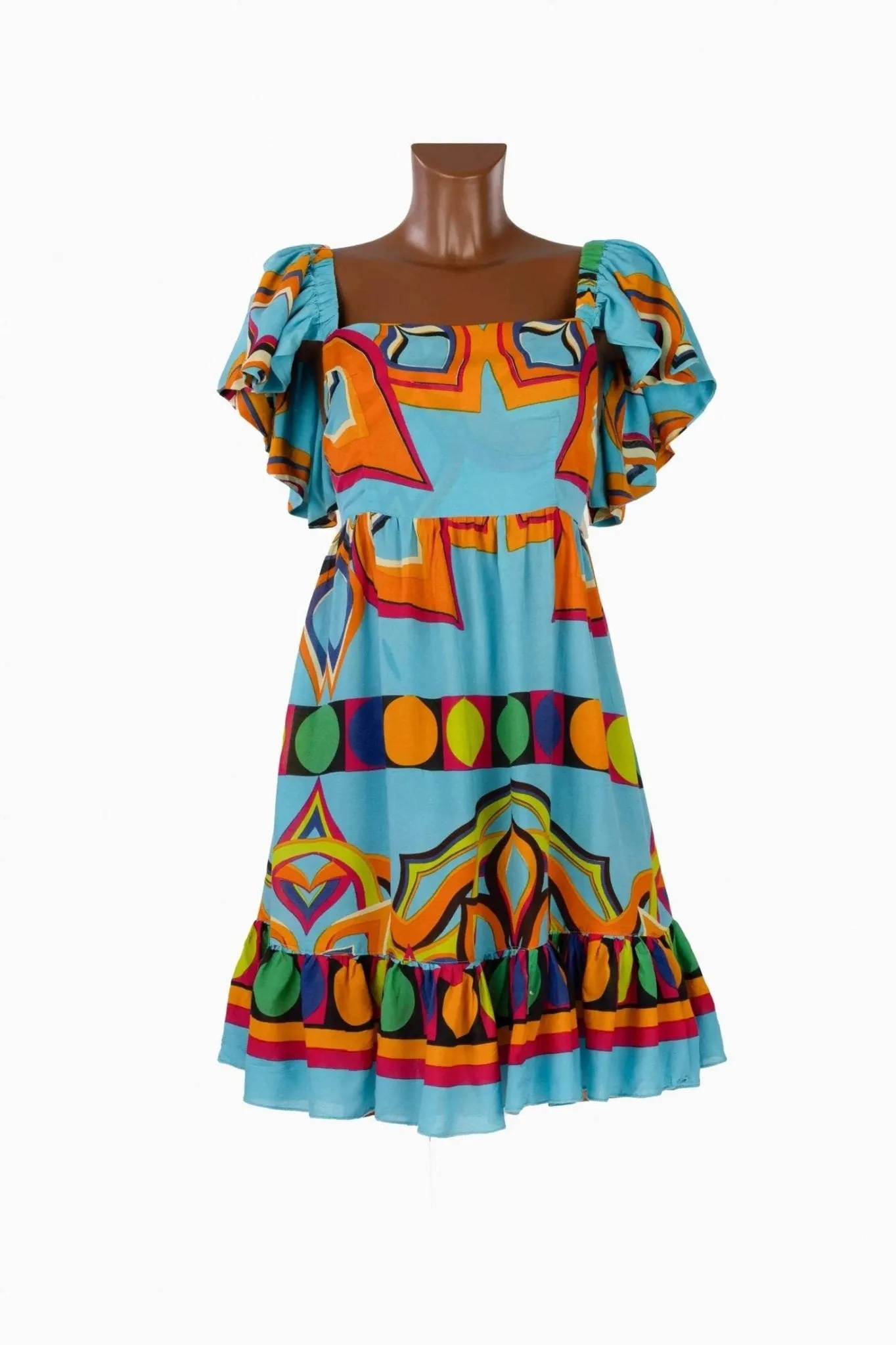 Abito corto Panaji scollato sulla schiena con deliziosi volant sulle spalle, perfetto per un look elegante e femminile.