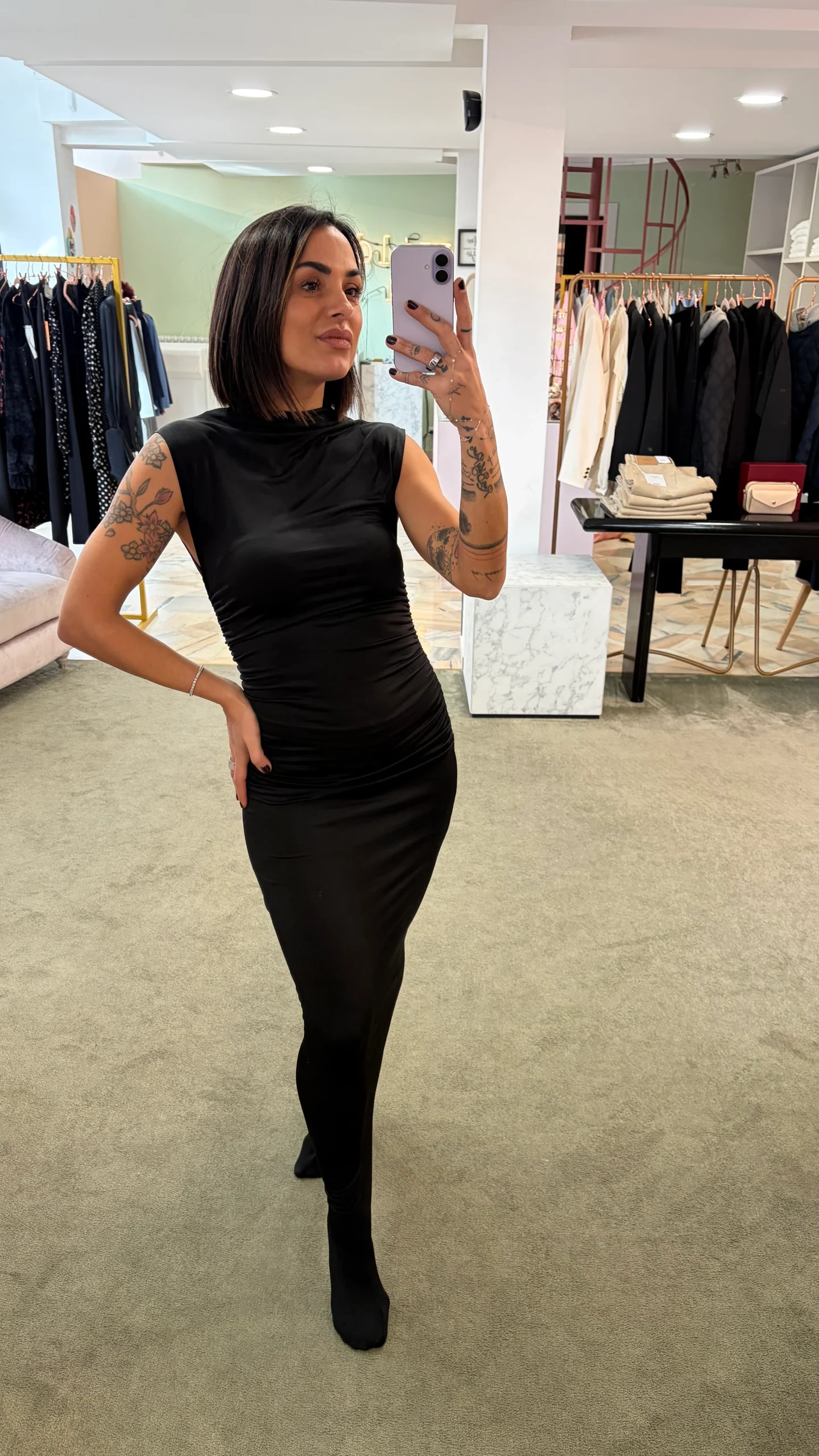 Abito lungo tubino nero smanicato elasticizzato con arricciature gl