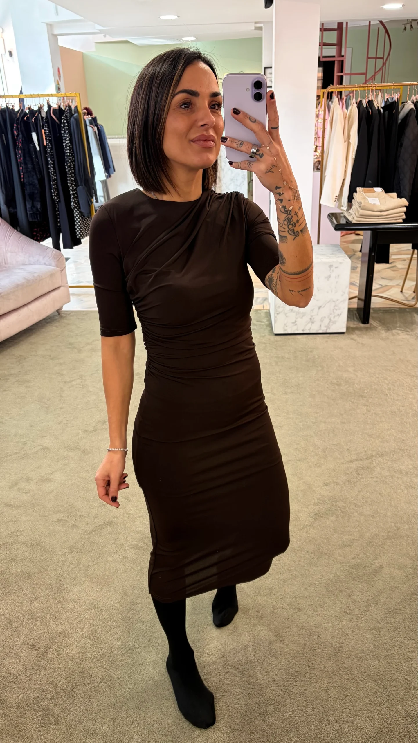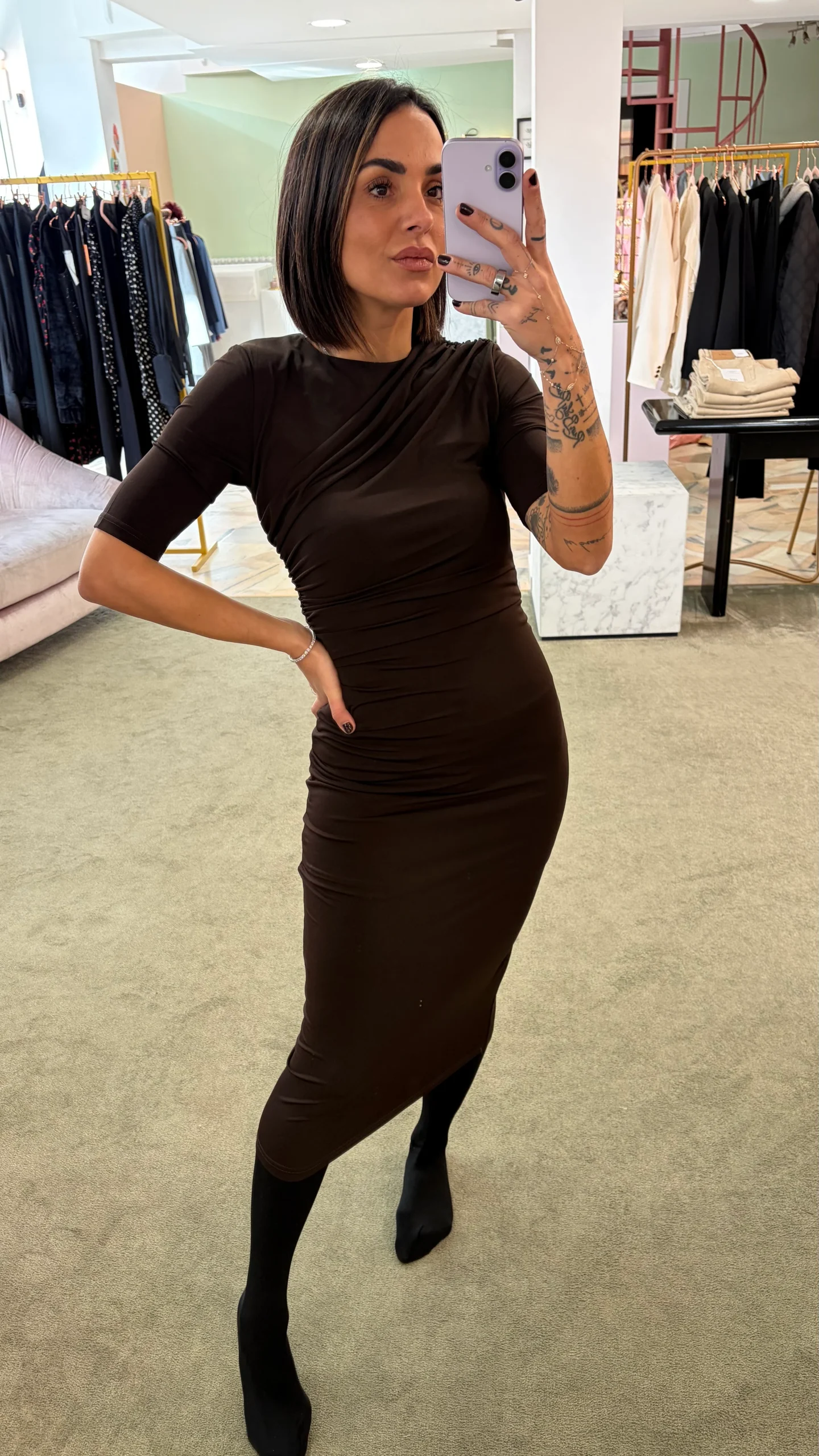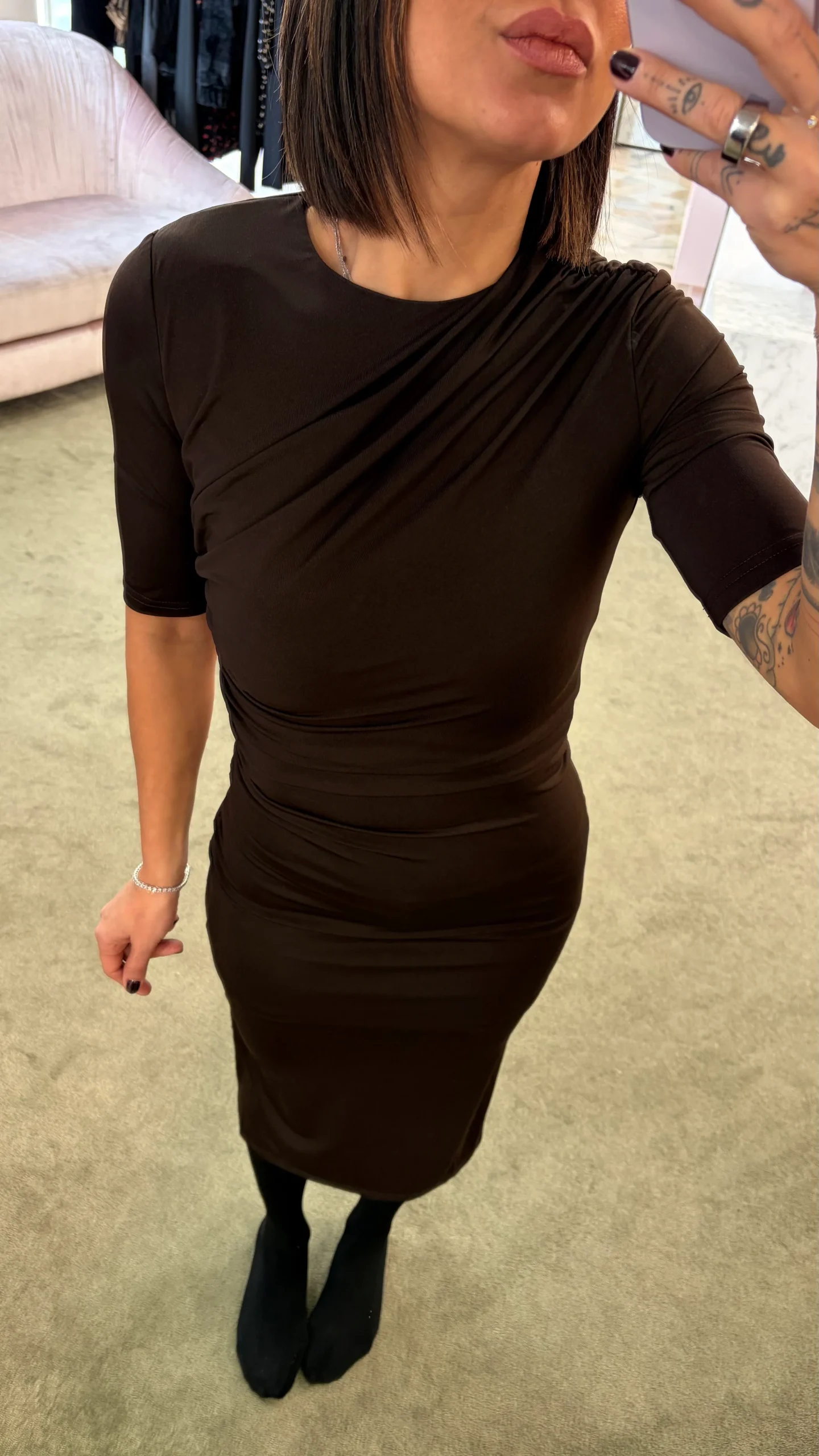 Abito midi cioccolato elasticizzato manica corta con arricciature gl