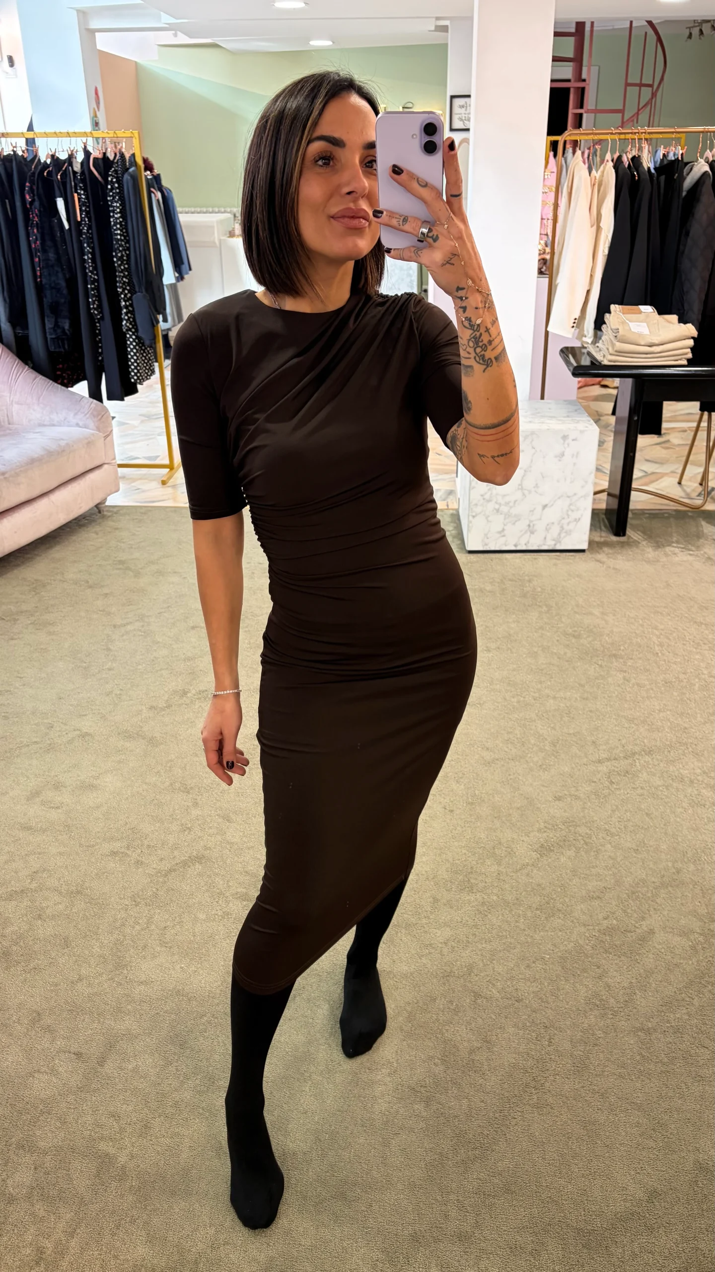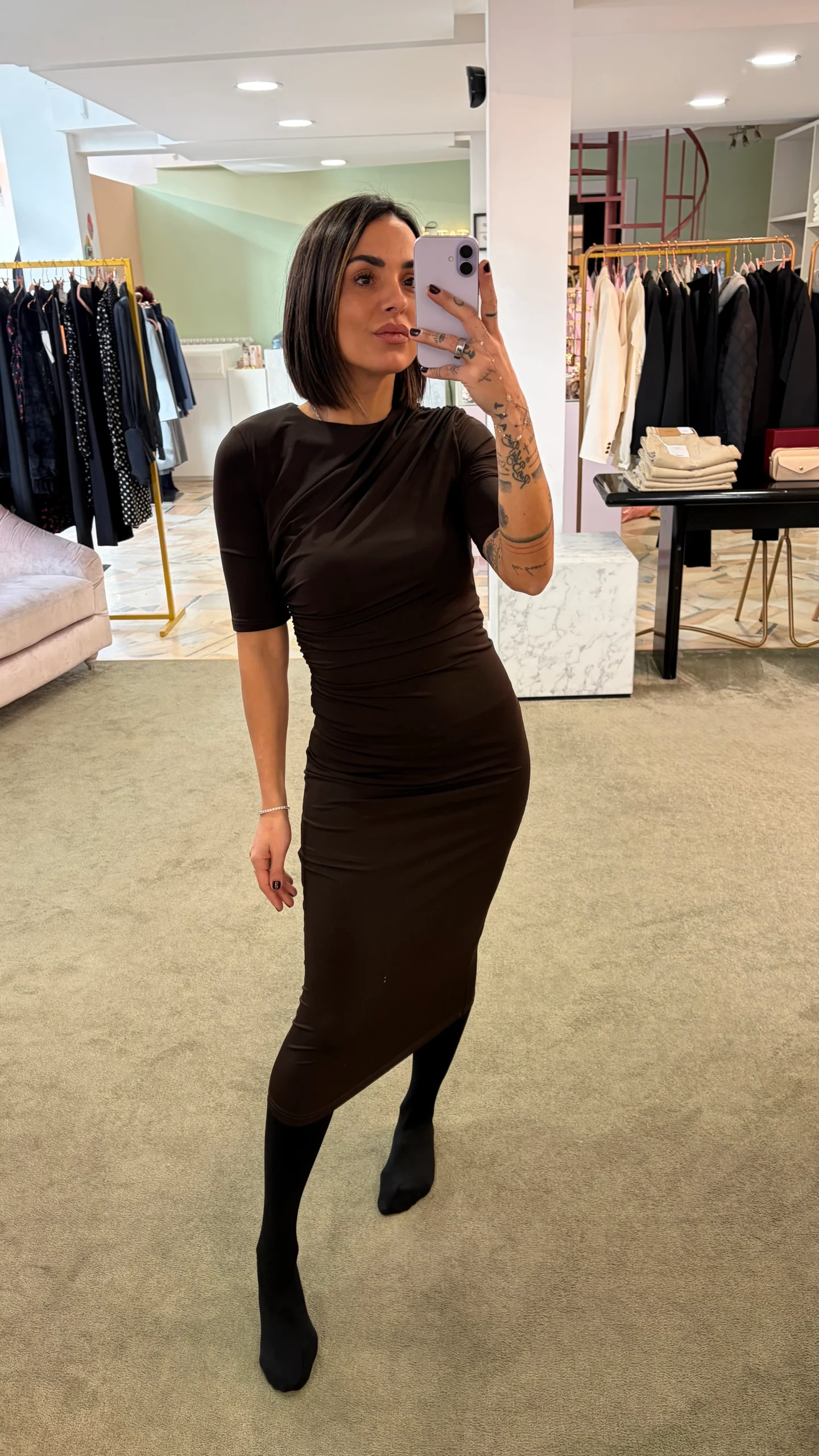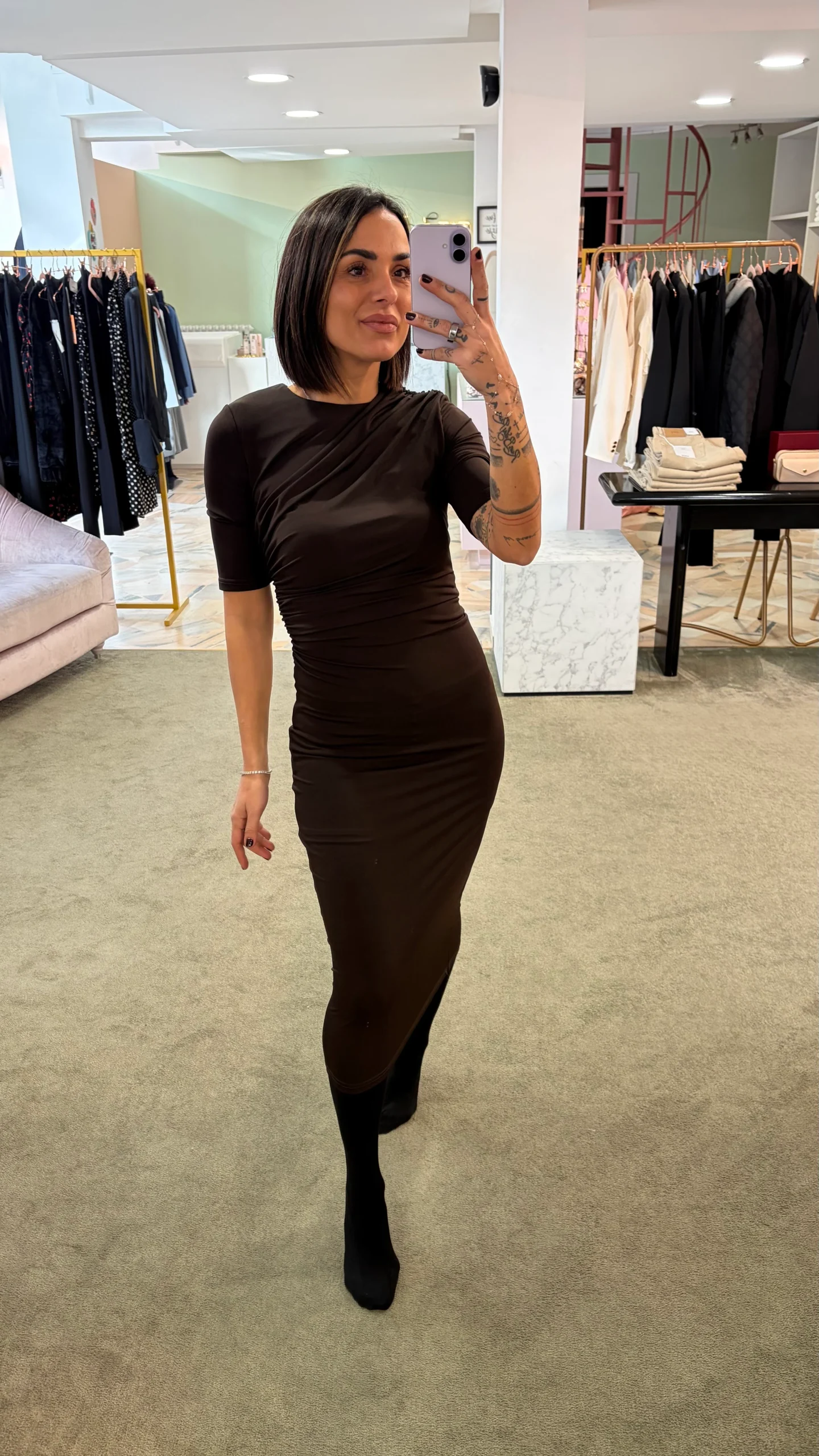 Abito midi cioccolato elasticizzato manica corta con arricciature gl