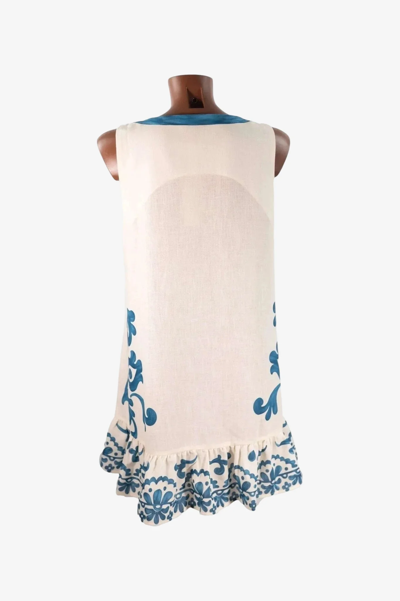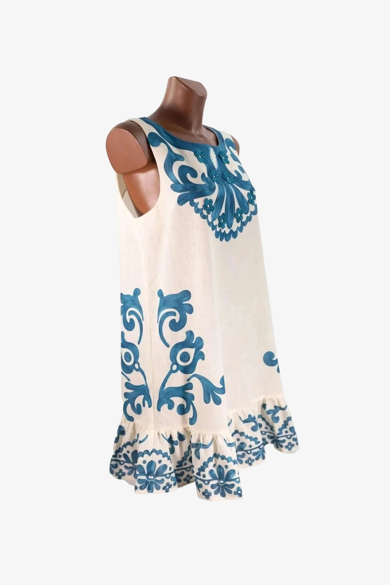 Abito corto smanicato in tessuto riciclato con applicazioni di strass e fiorellini in pizzo. Prodotto Made in Italy