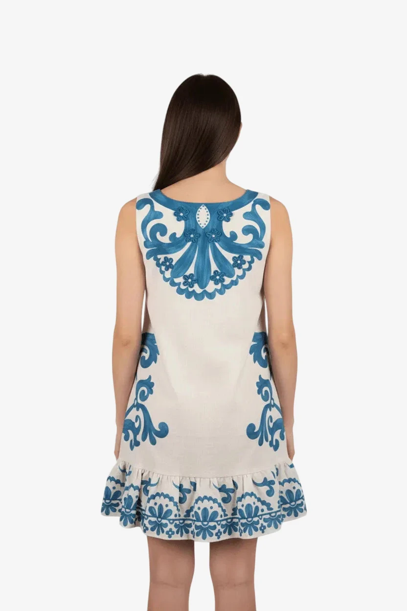 Abito corto smanicato in tessuto riciclato con applicazioni di strass e fiorellini in pizzo.
