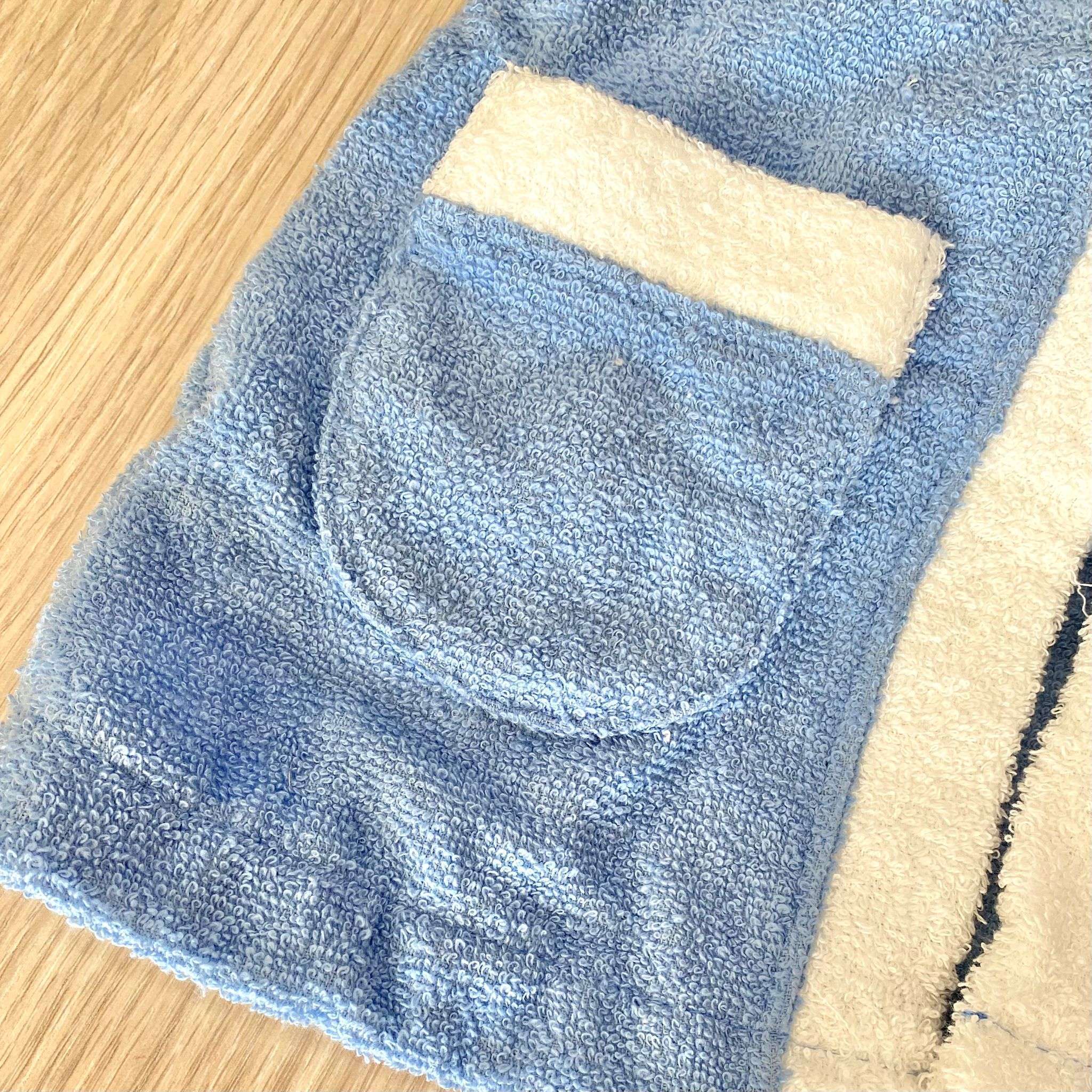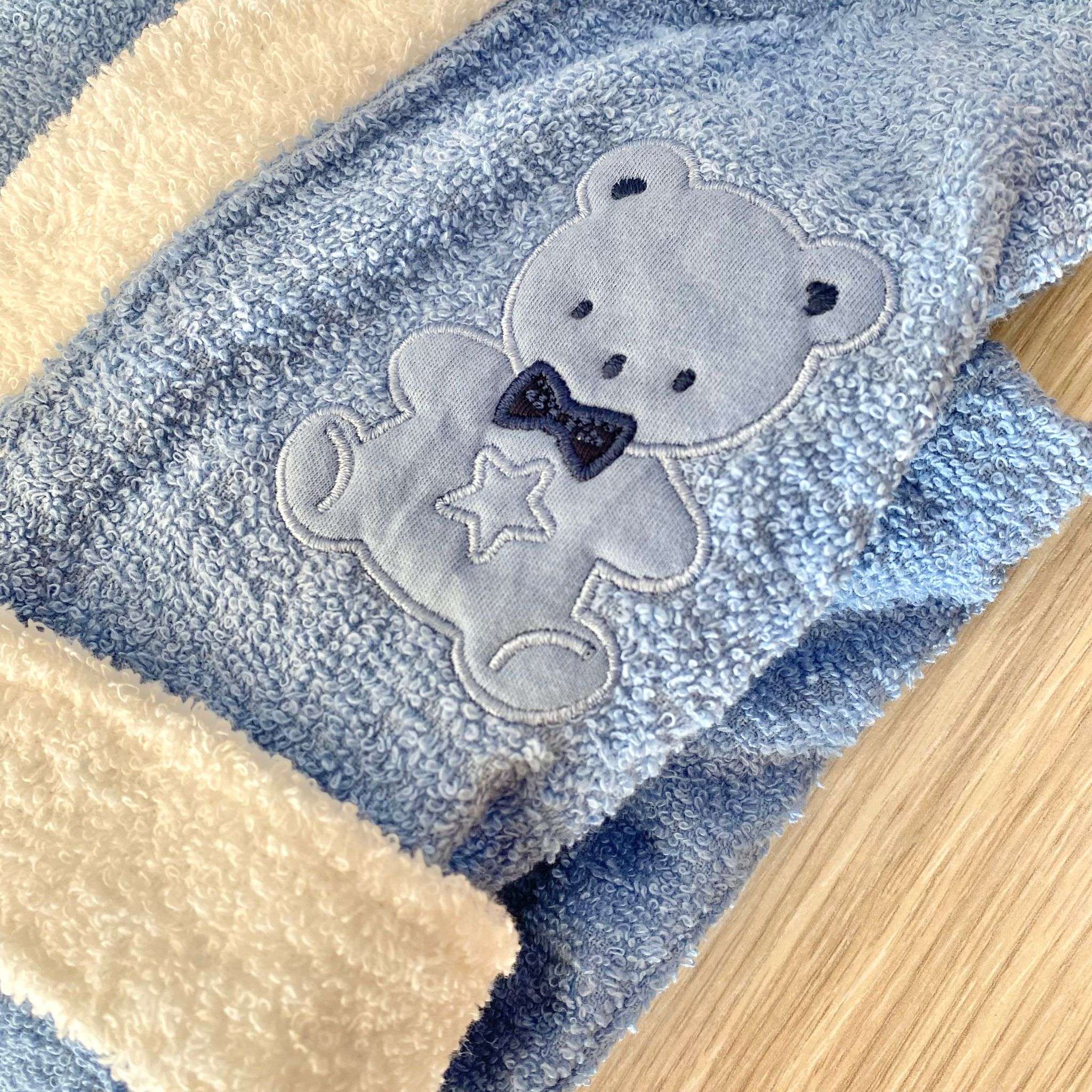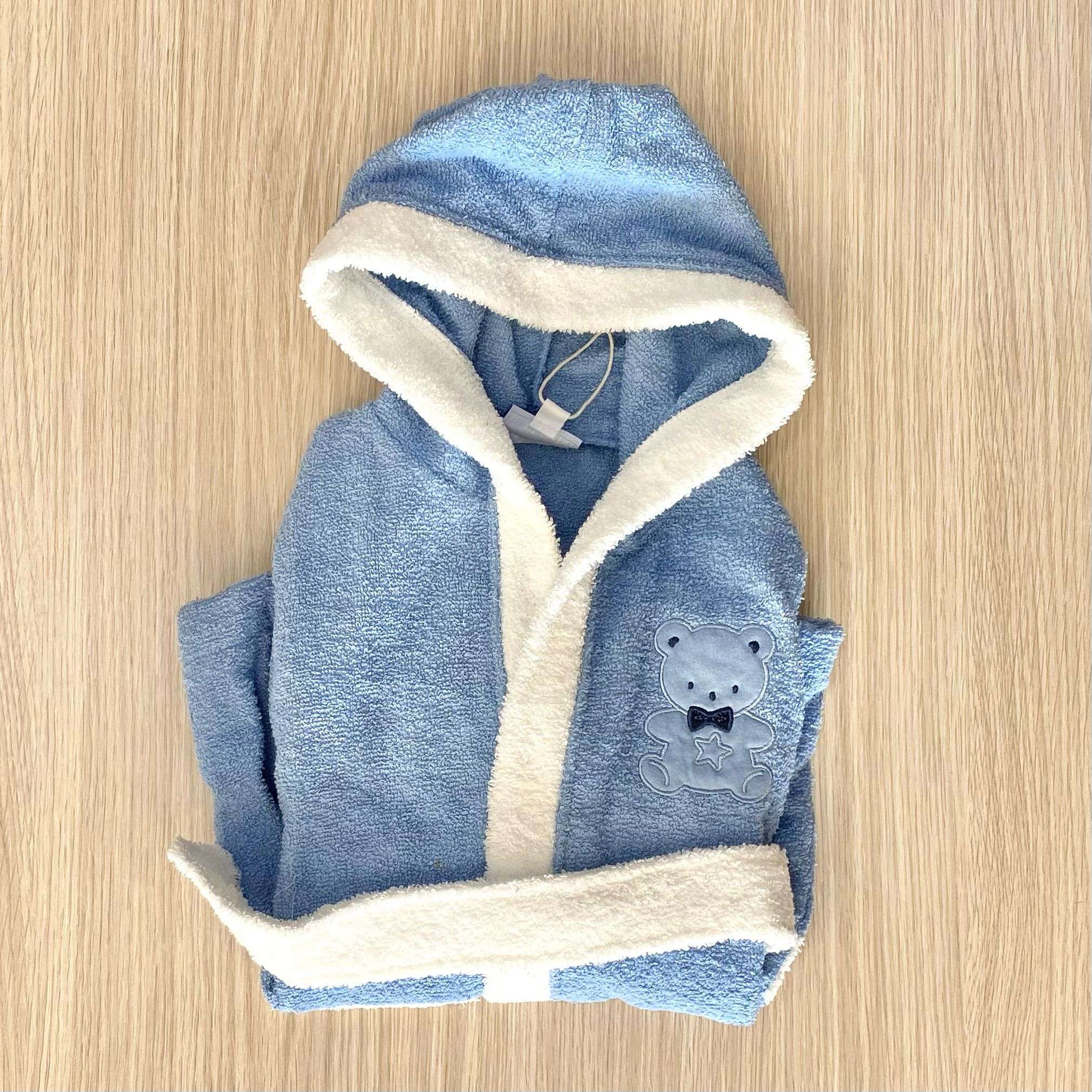 Accappatoio bambino in morbida spugna di cotone di colore azzurro con dettagli in bianco e disegno in rilievo.