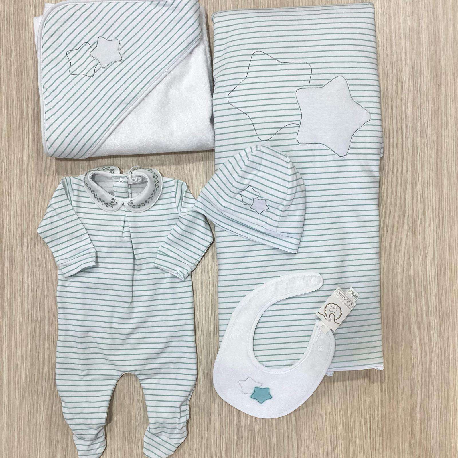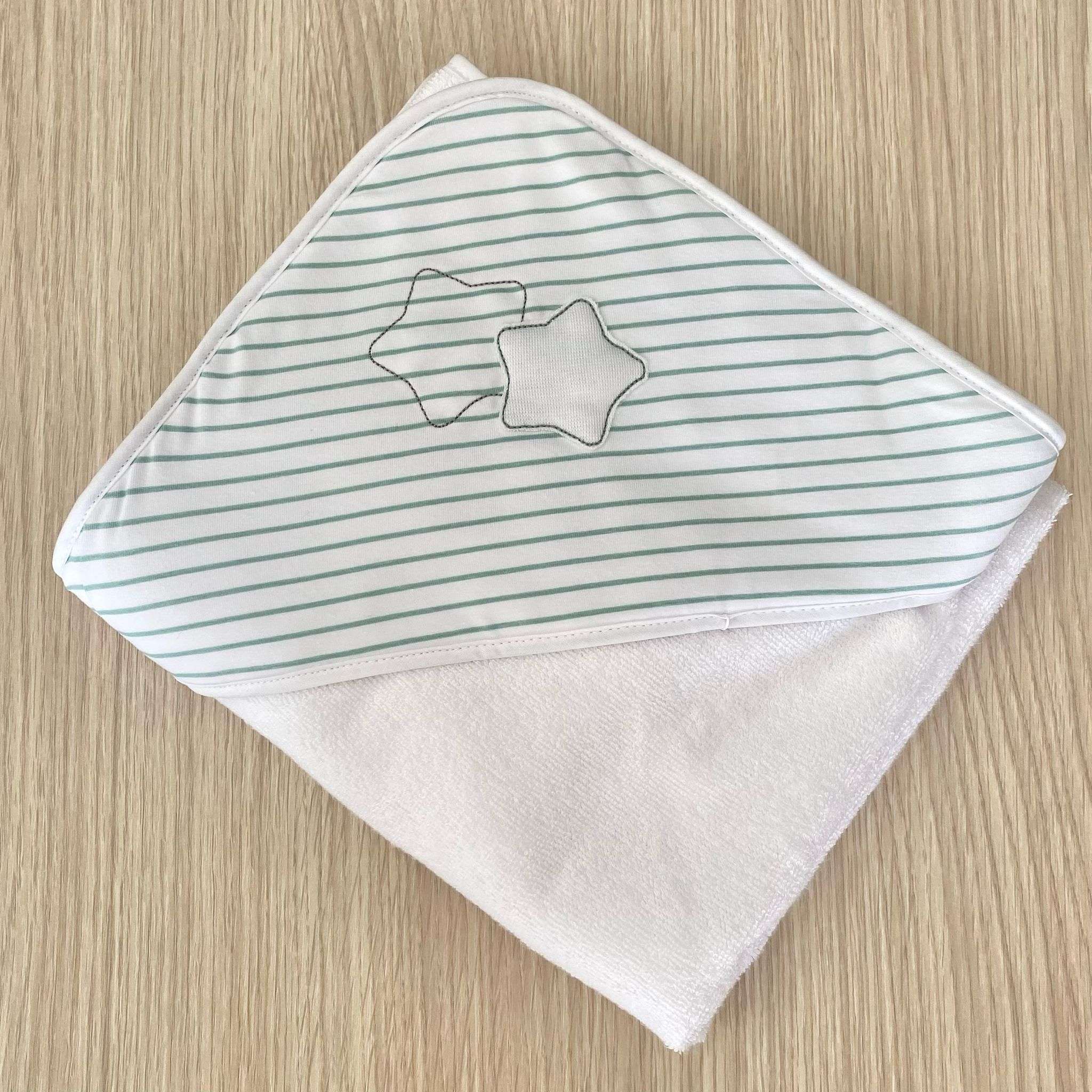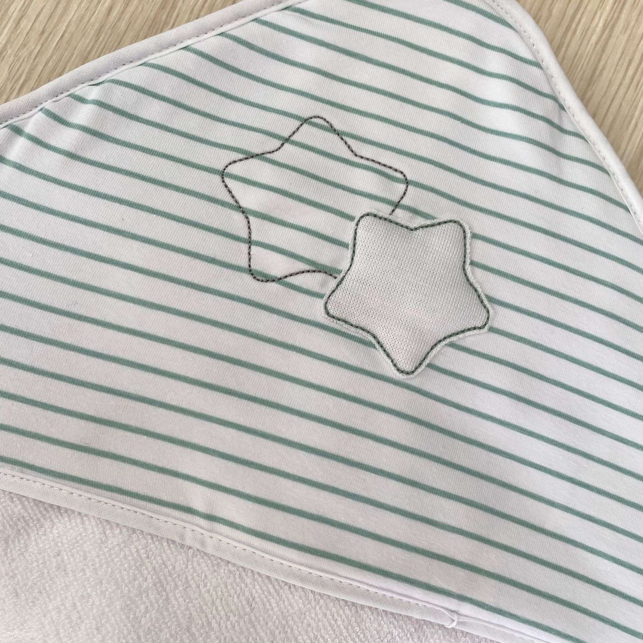 Accappatoio triangolo neonato in spugna di cotone, di colore bianco e verde acqua, con disegno ricamato. Misura: 71×71 cm.