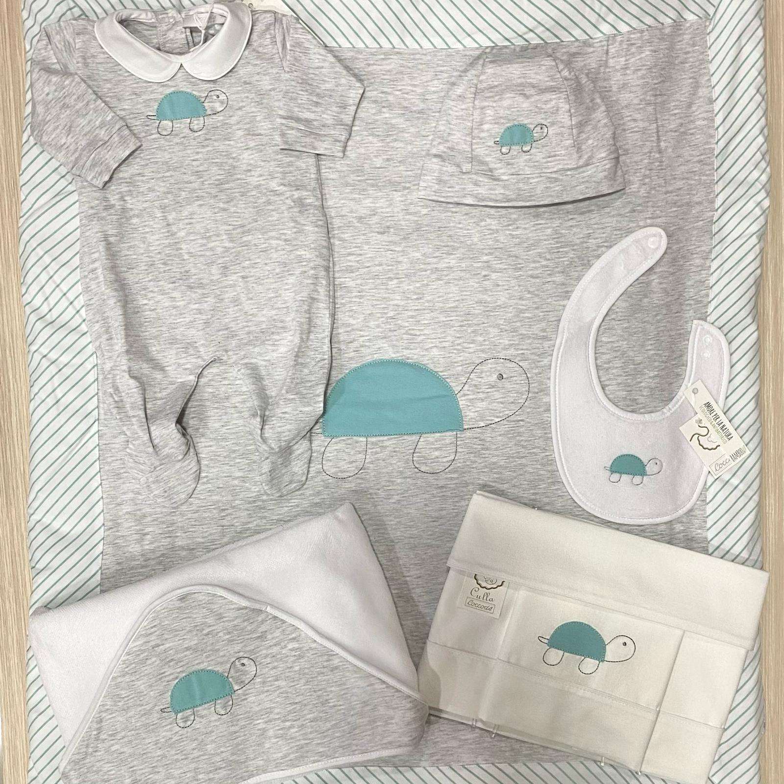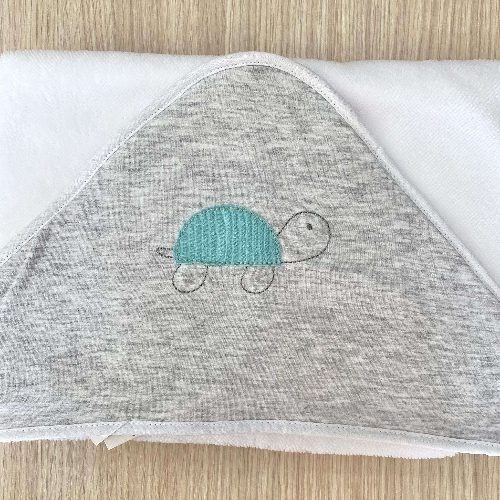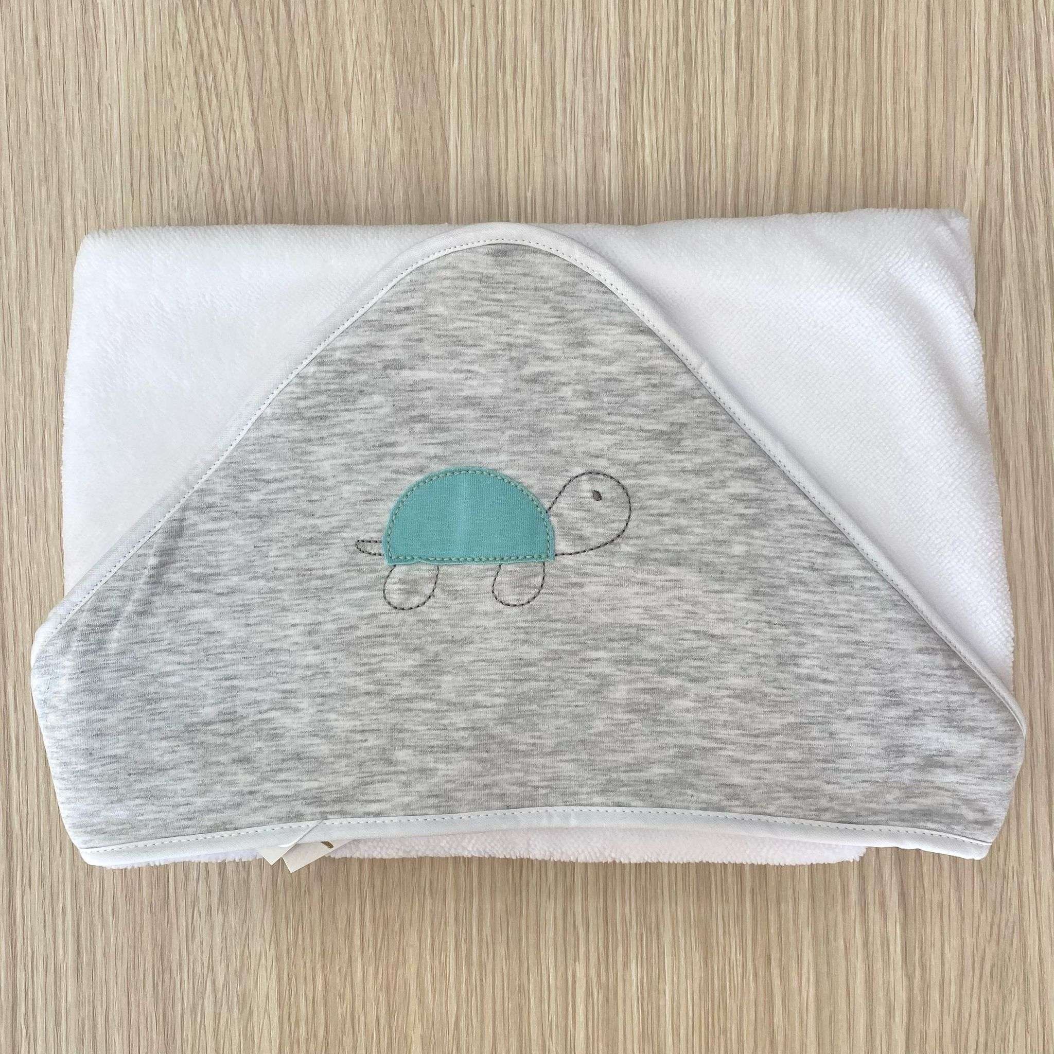 Accappatoio triangolo neonato in spugna di cotone, di colore bianco, grigio e verde acqua, con disegno ricamato. Misura: 71×71 cm.