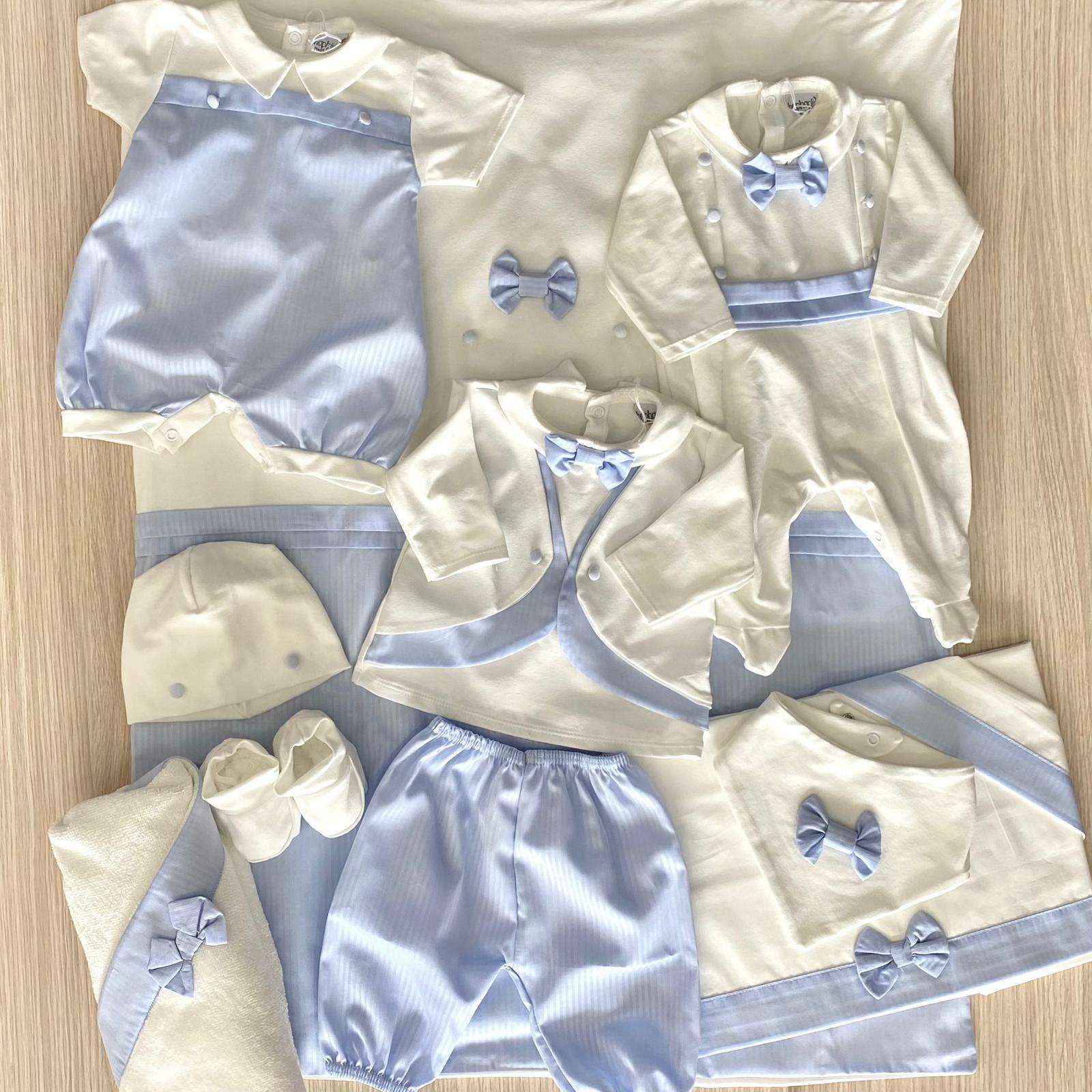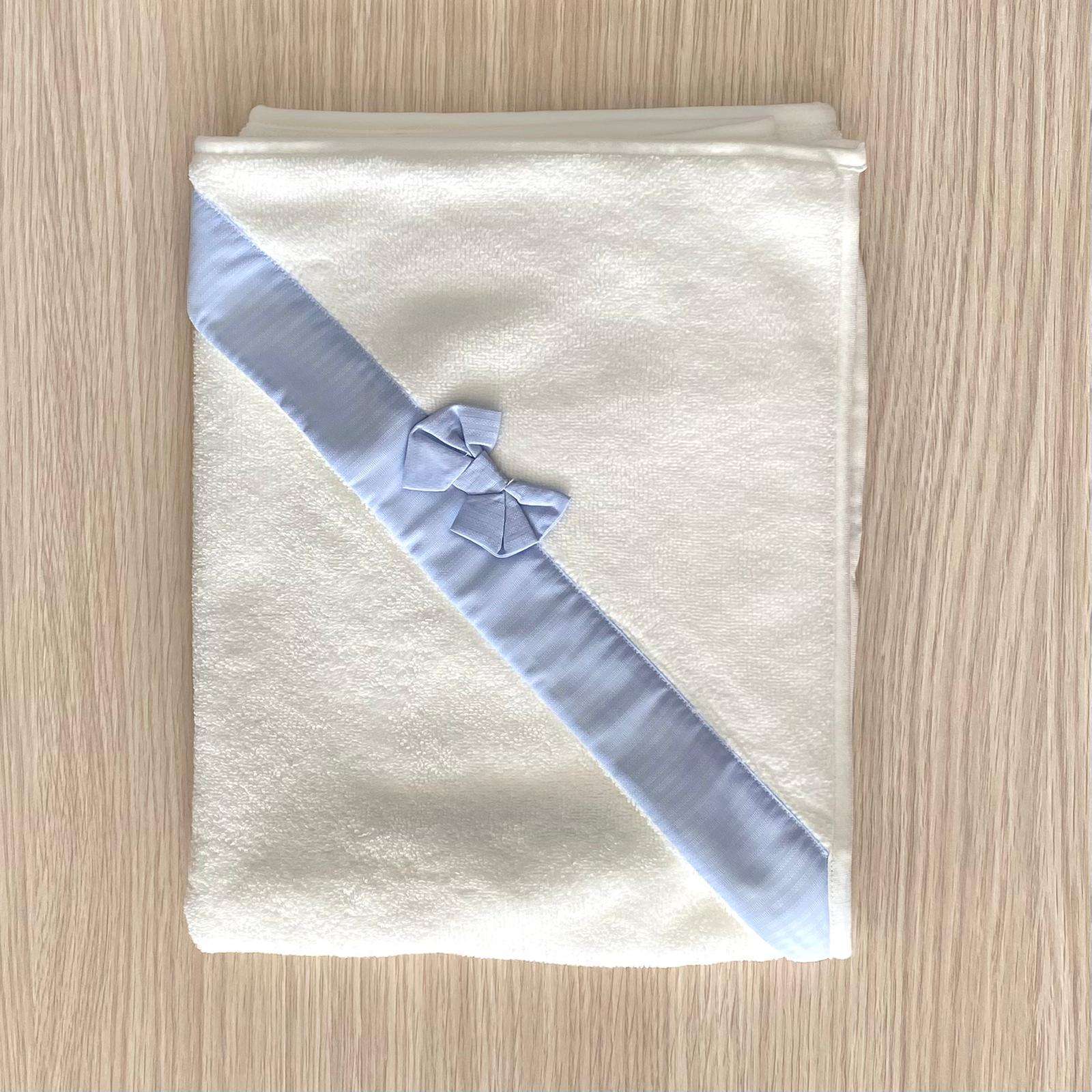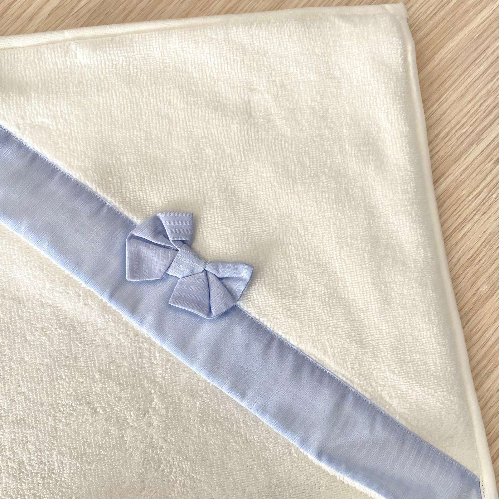 Accappatoio triangolo neonato in spugna di cotone cinigliato, di colore panna e celeste, con applicazione di fiocchetto. Tema: GIANMARCO Articolo: J 23 6640