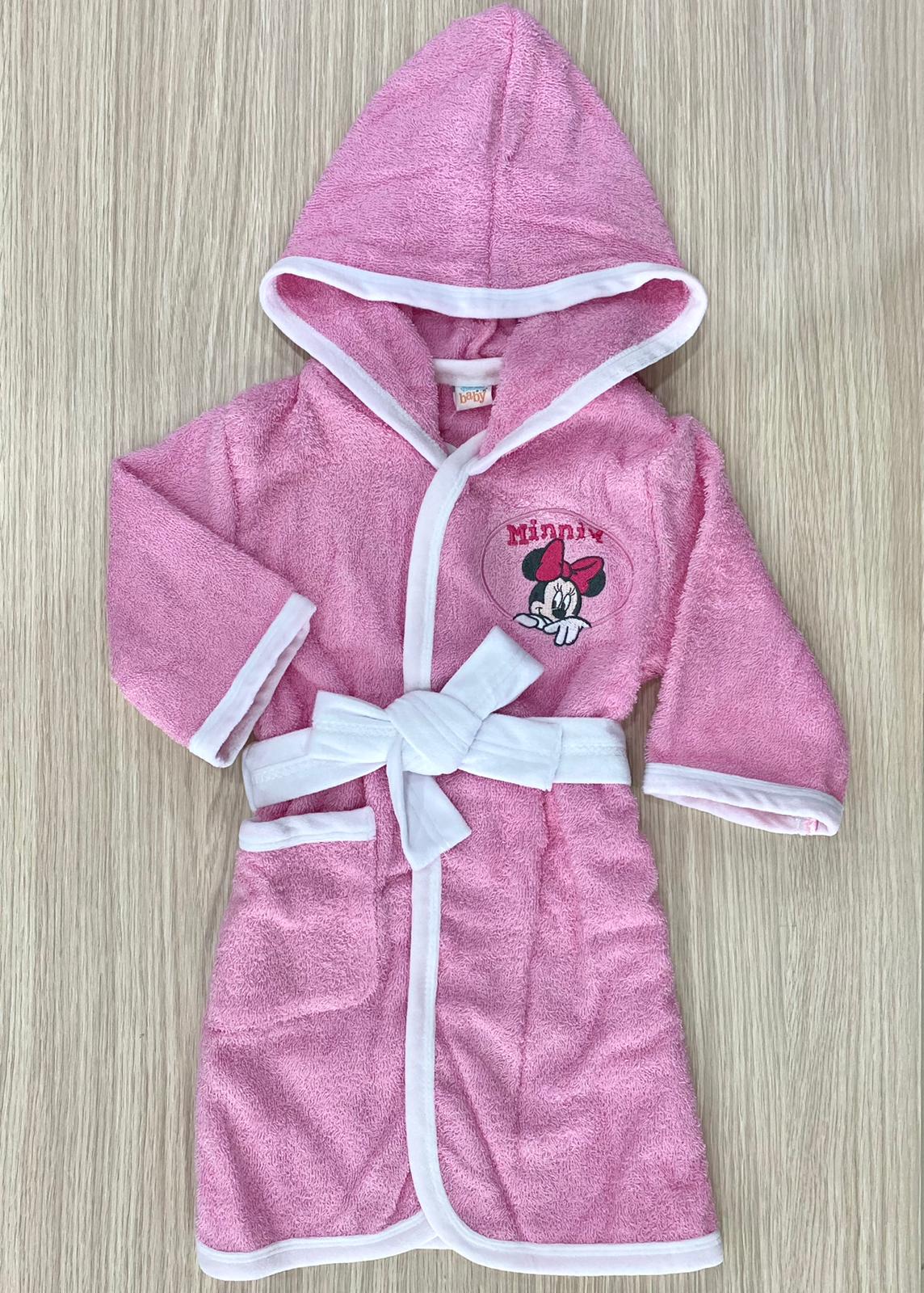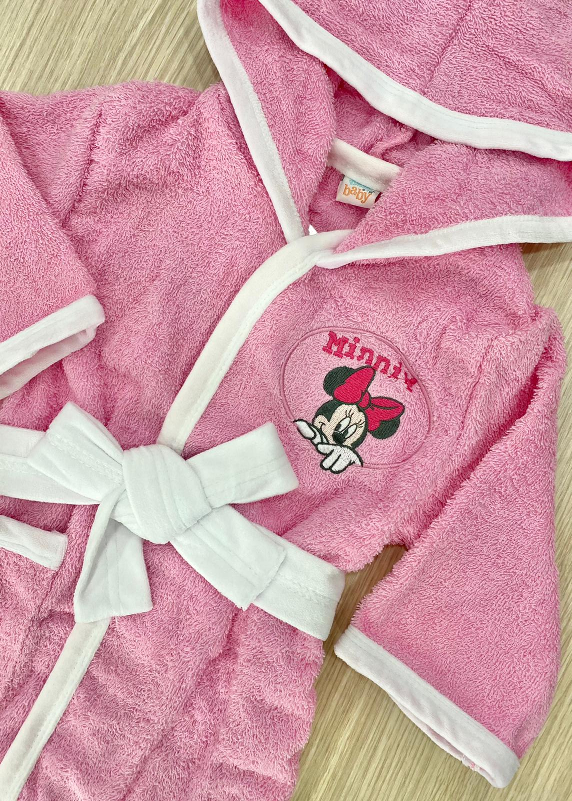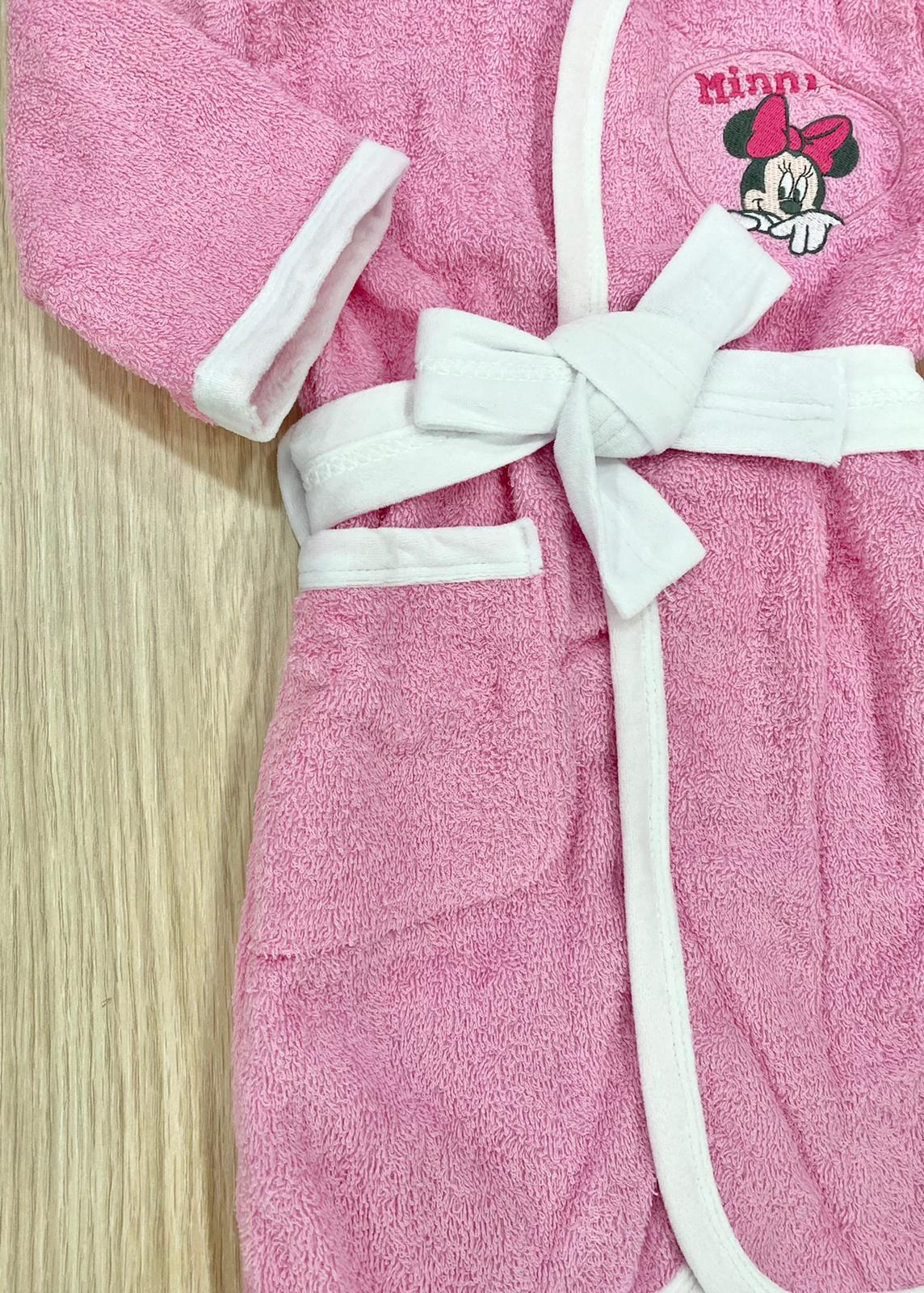 Accappatoio bambina in morbida spugna in cotone di colore rosa e bianco con dettaglio di ricamo Minnie. 12 Mesi: 80 cm. 18 Mesi: 86 cm. 24 Mesi: 92 cm.