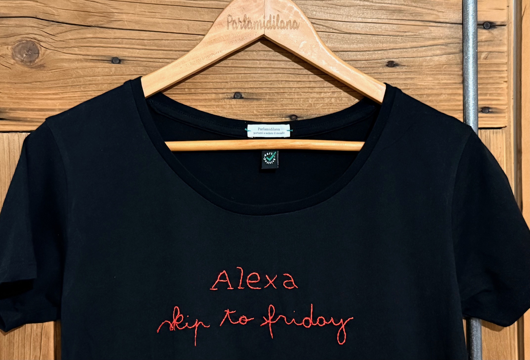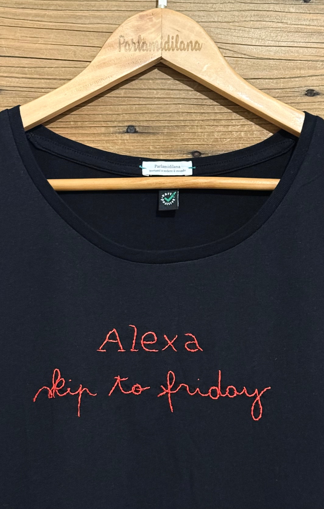 ALEXA SKIP TO FRIDAY – S WOMAN BIO (Nera ricamo rosso) ricamata a mano 100% cotone BIO.
