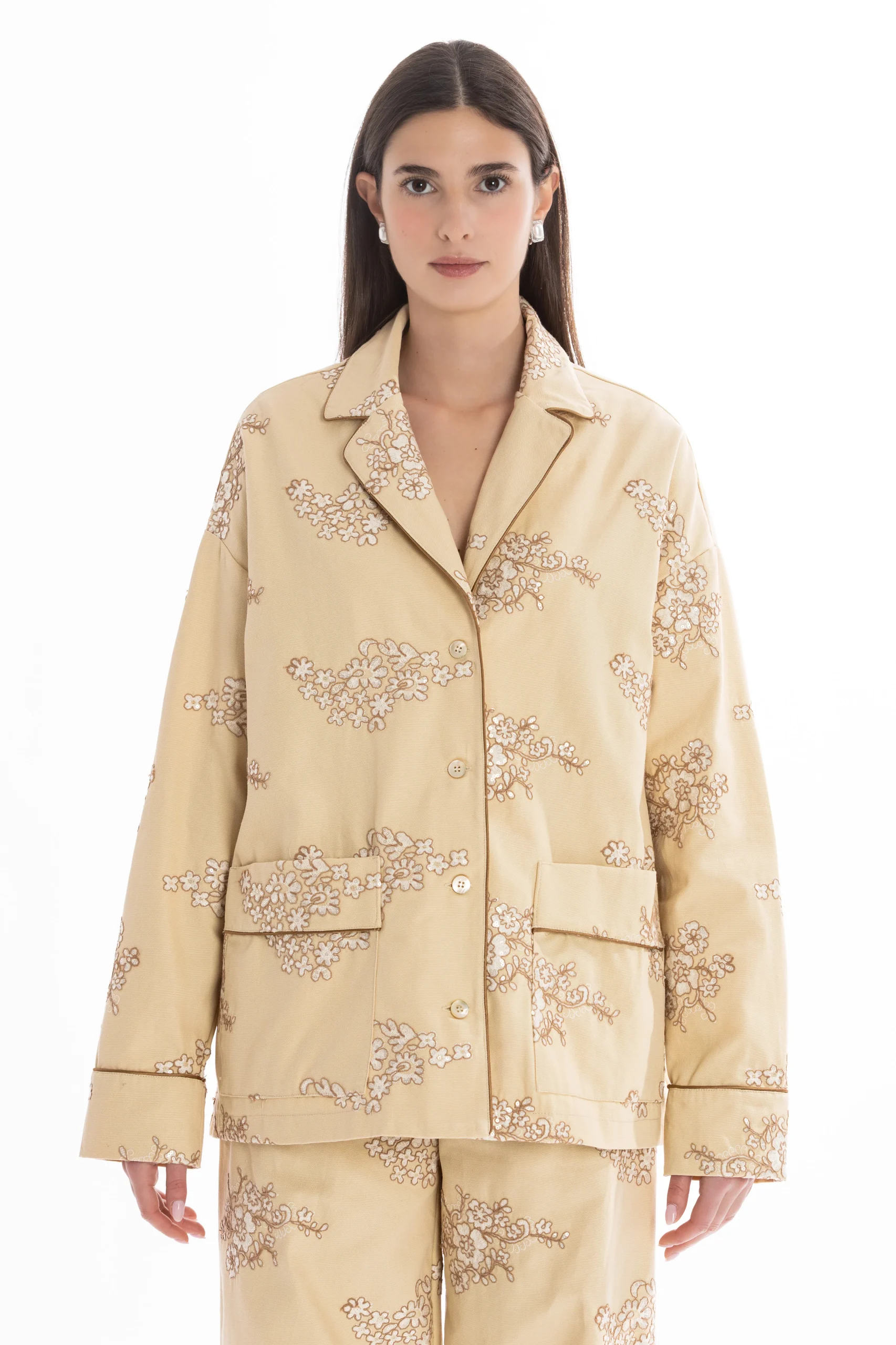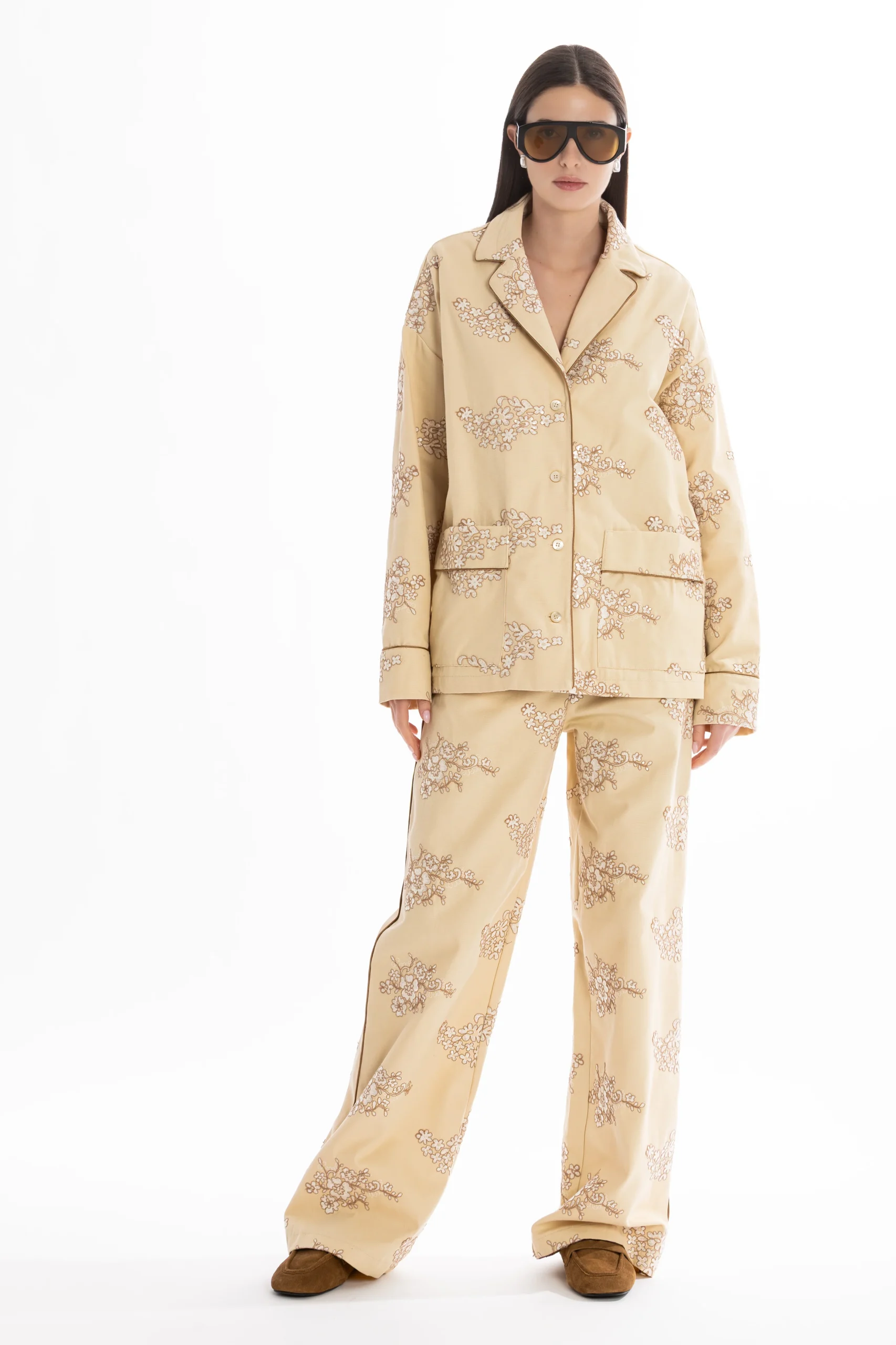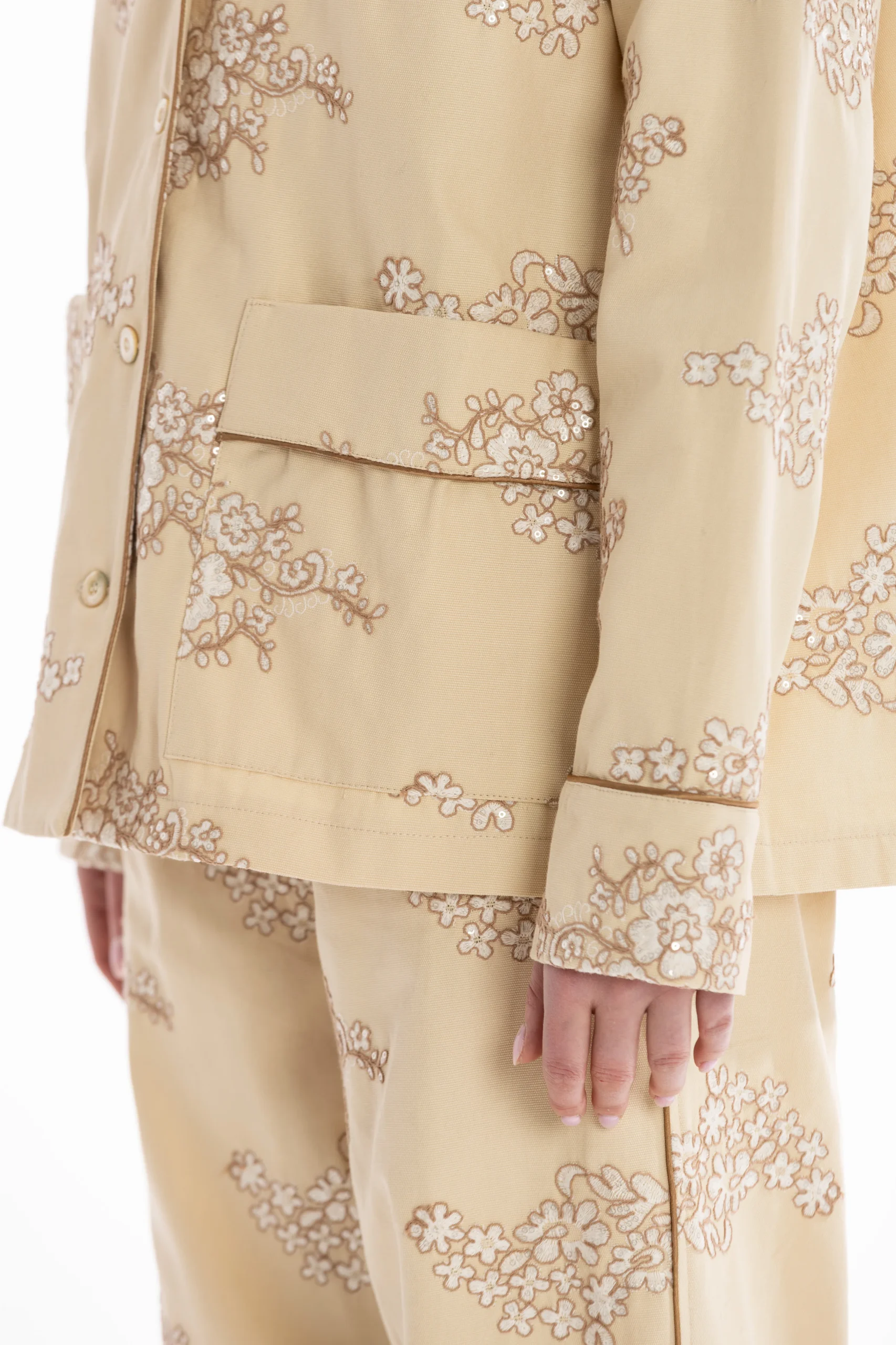 Il set è composto da una camicia stile pigiama, bordata a contrasto lungo i profili per seguire il disegno del ricamo e creare un raffinato gioco di linee. I bottoni in madreperla aggiungono un dettaglio prezioso e naturale, mentre le tasche applicate mantengono l’equilibrio tra eleganza e funzionalità.