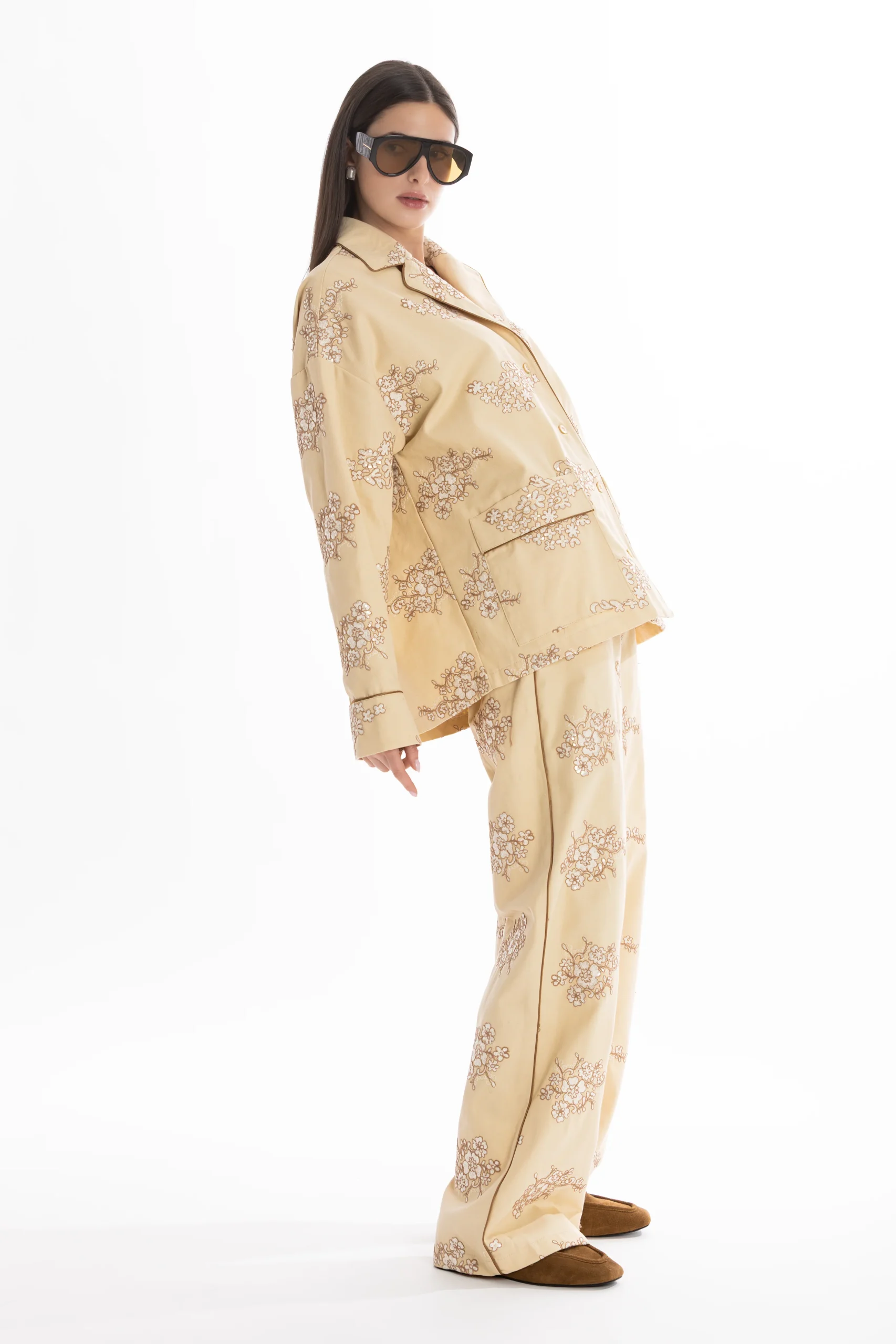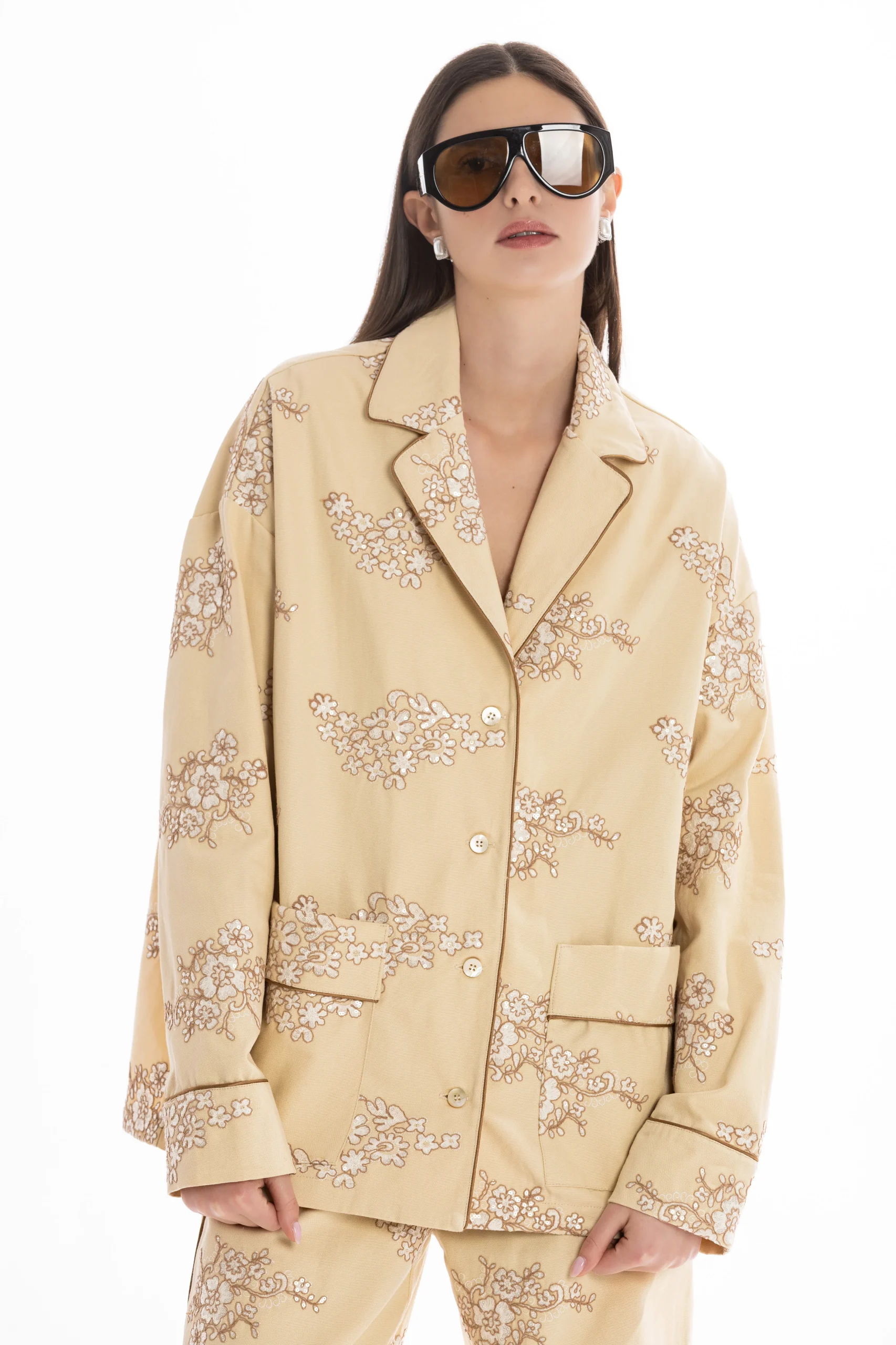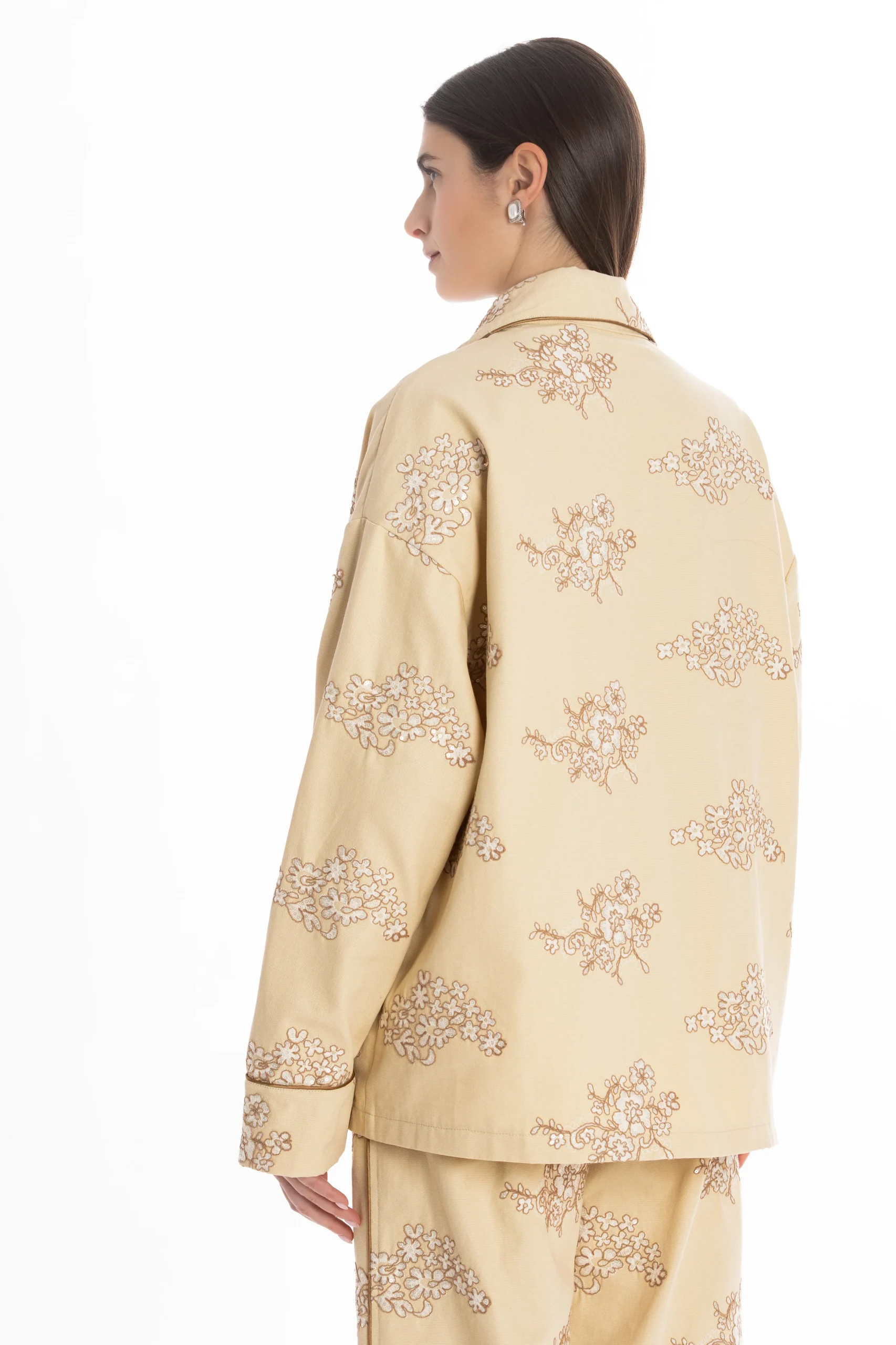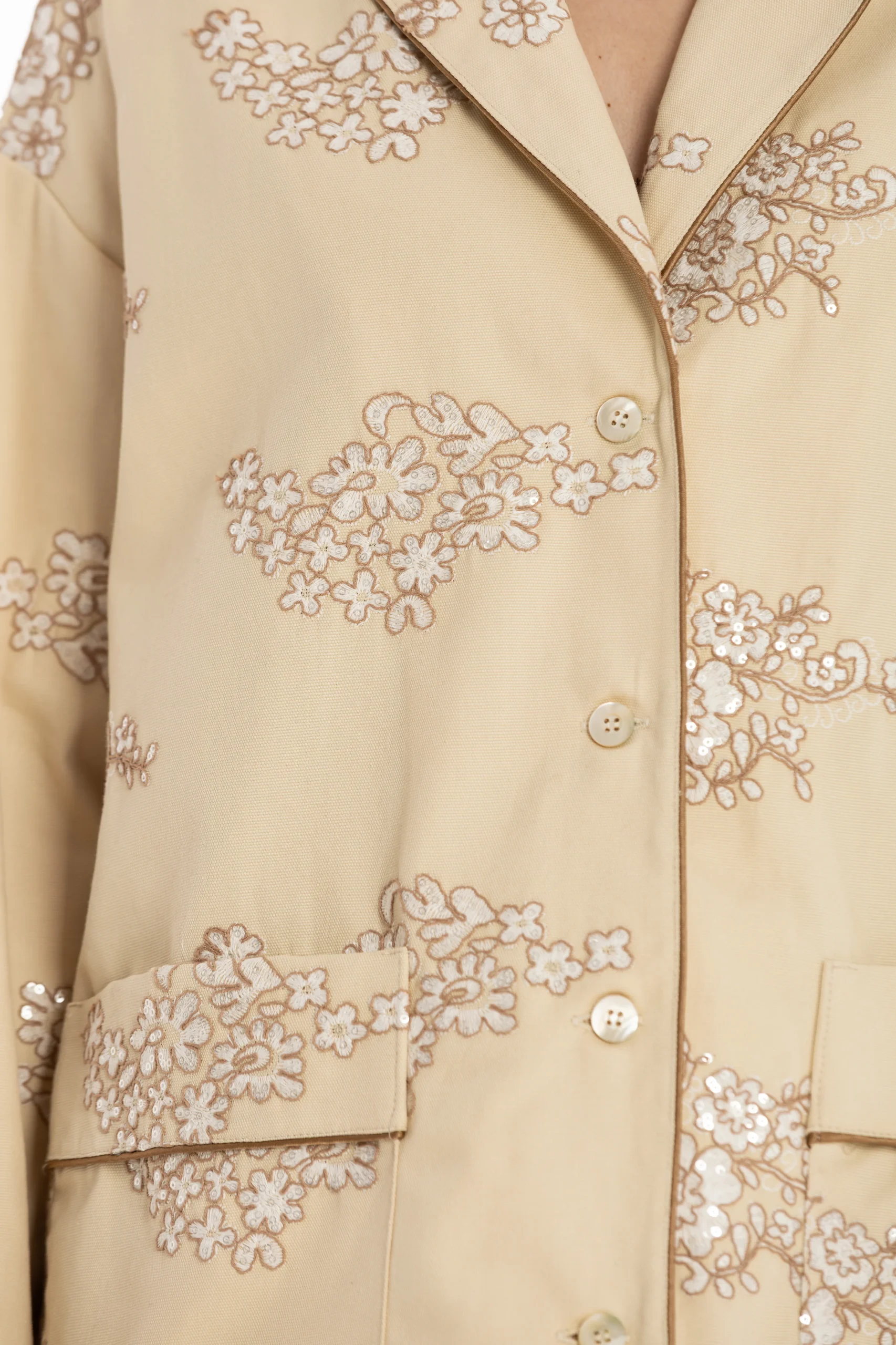 Il set è composto da una camicia stile pigiama, bordata a contrasto lungo i profili per seguire il disegno del ricamo e creare un raffinato gioco di linee. I bottoni in madreperla aggiungono un dettaglio prezioso e naturale, mentre le tasche applicate mantengono l’equilibrio tra eleganza e funzionalità.