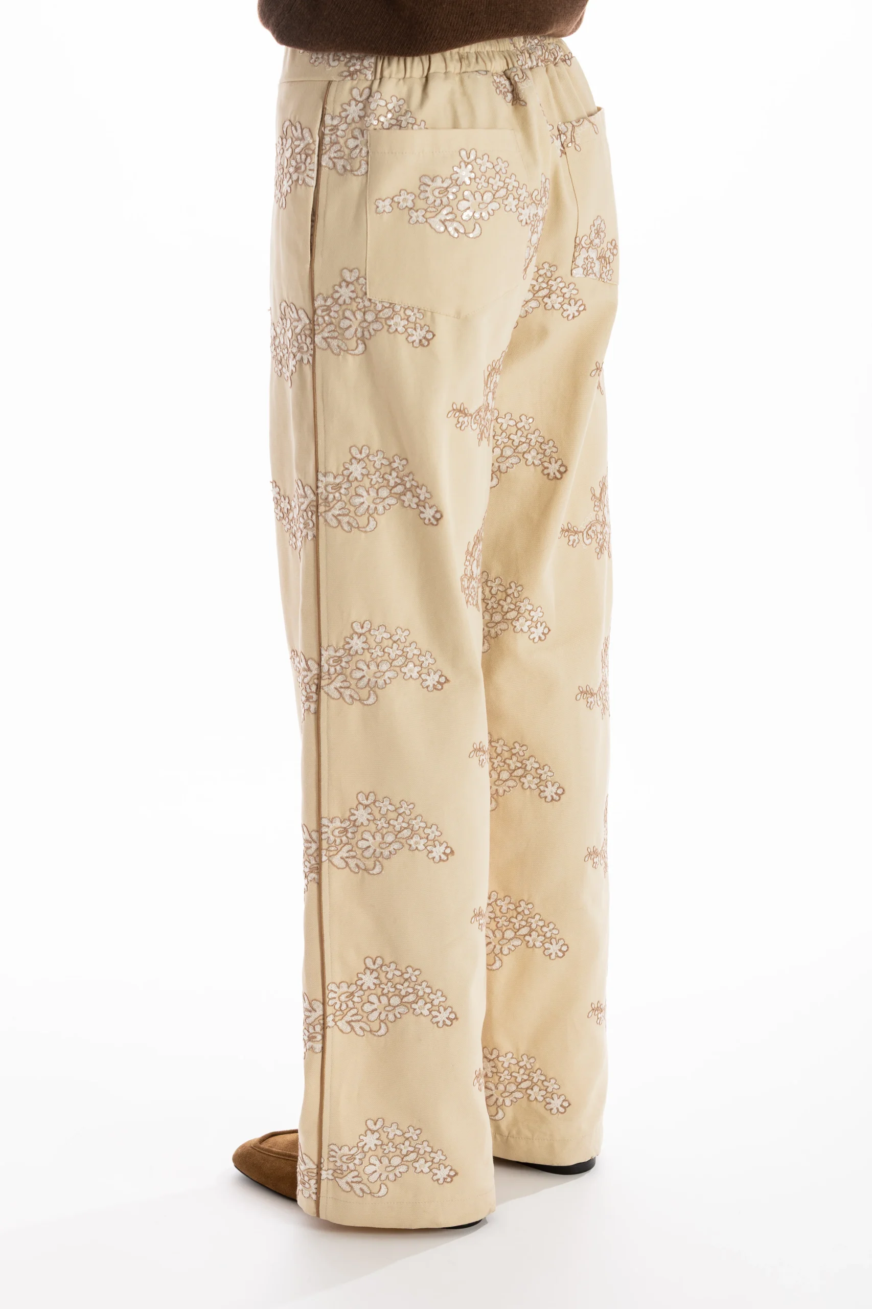 Il pantalone coordinato presenta elastico sul retro per una vestibilità confortevole, lasciando il davanti pulito e lineare. Il profilo a contrasto lungo la gamba riprende quello della camicia, creando continuità e armonia tra i capi.