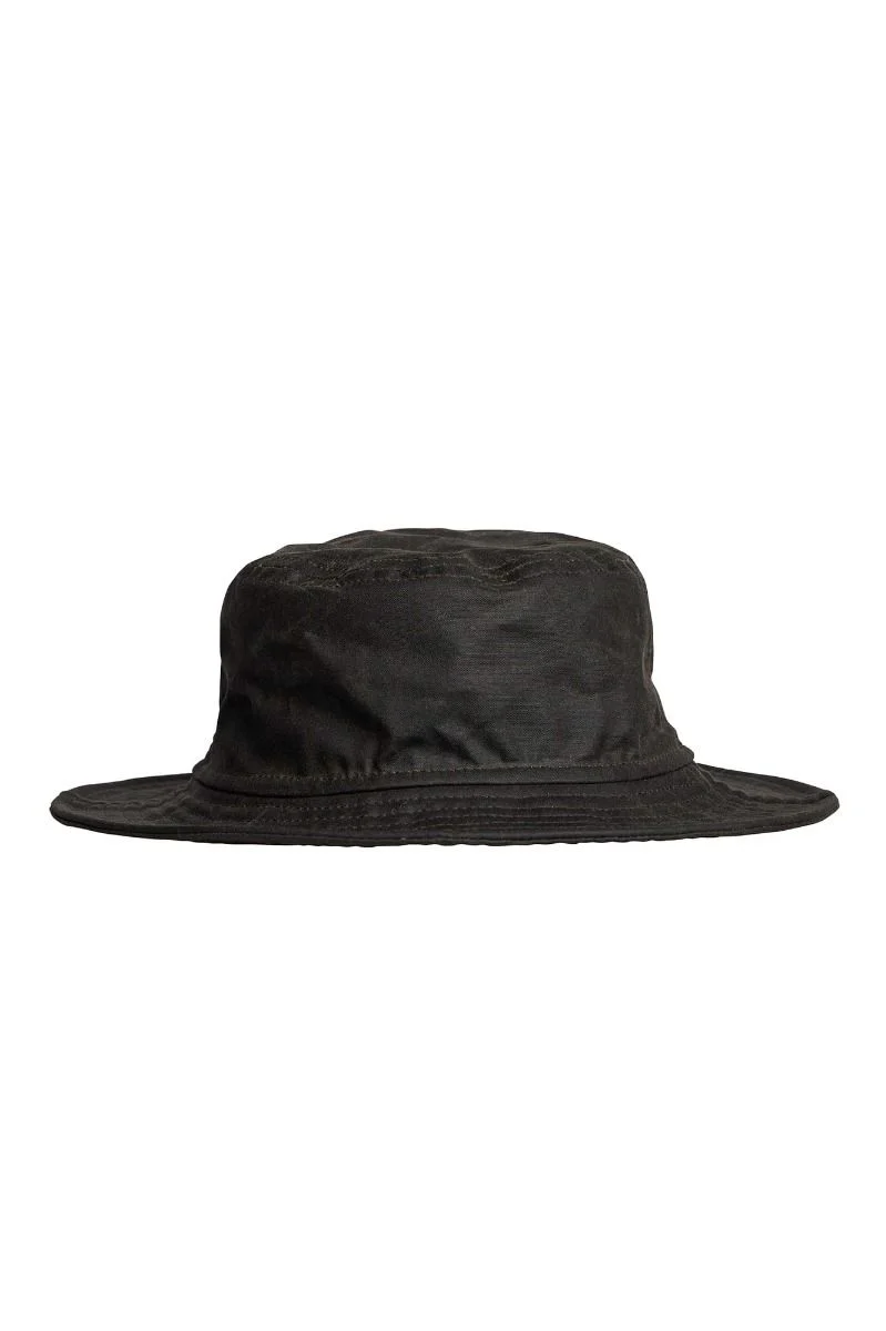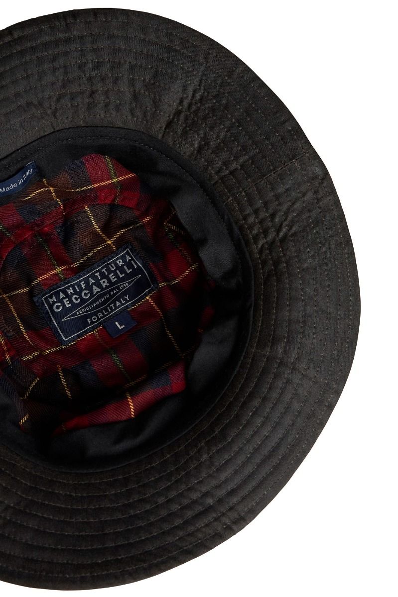 Cappello da pioggia realizzato in cotone paraffinato idrorepellente, foderato del classico tartan in 100% cotone: ha la tesa fatta di un doppio strato di cotone paraffinato ed uno strato interno di lana, uniti con cuciture che la rendono compatta ma morbida.