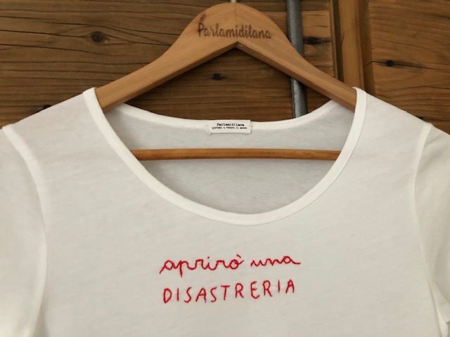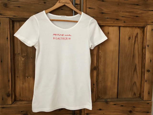 T-shirt “APRIRO’ UNA DISASTRERIA” ricamata a mano. La foto è puramente illustrativa, il modello utilizzato ora è quello in cotone BIO (vedi tabella TAGLIE in galleria foto)