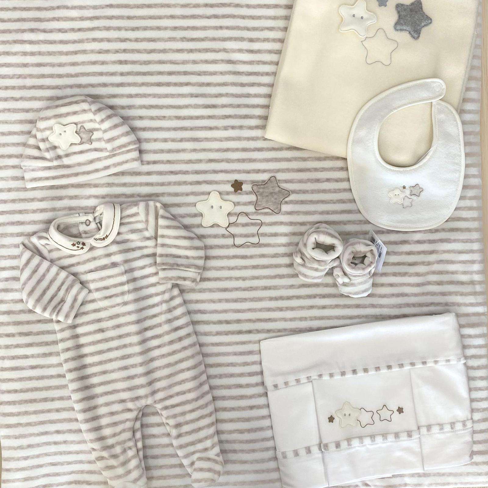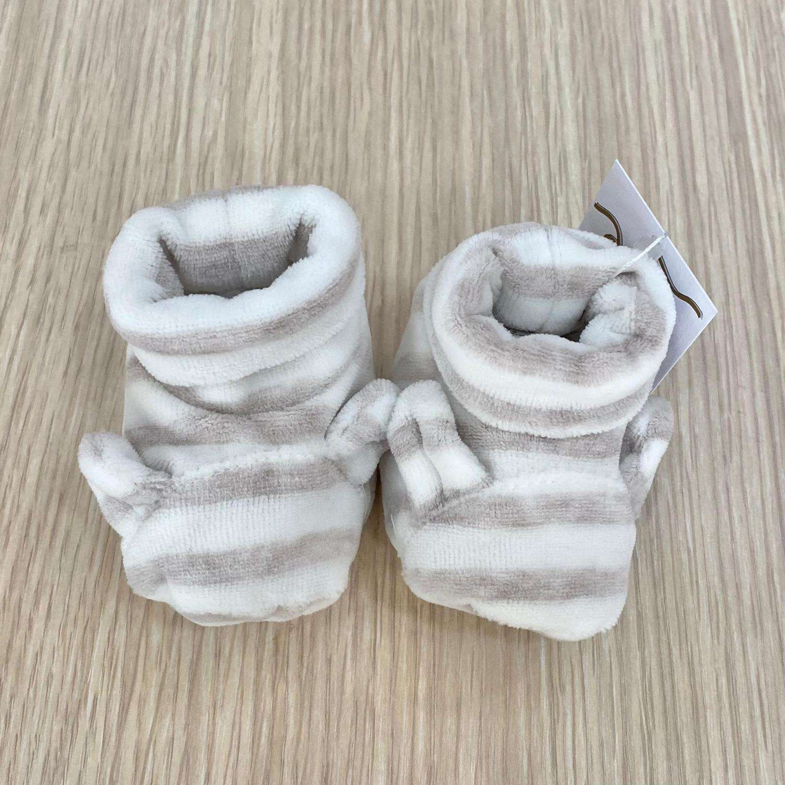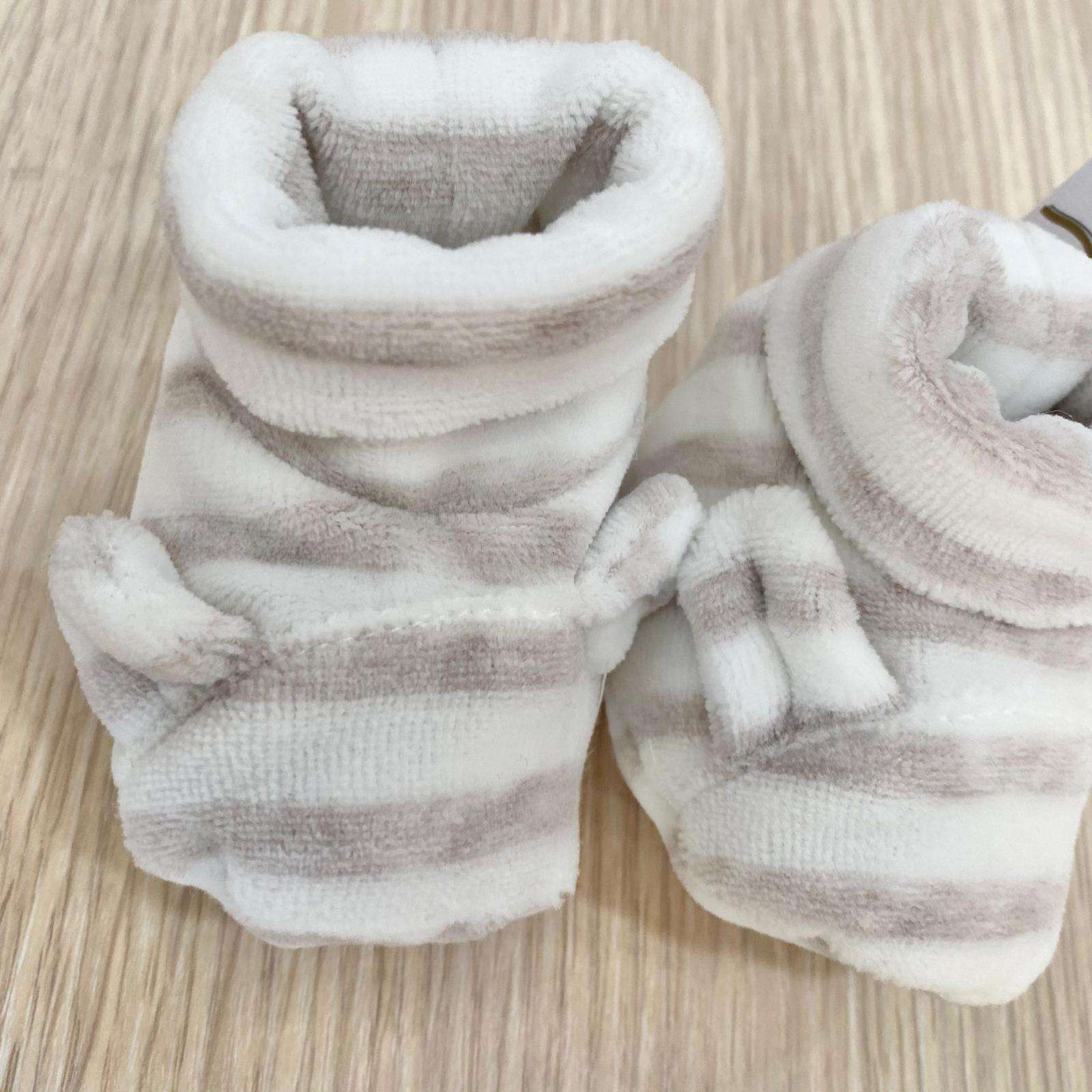 Babbucce neonato/a in ciniglia, di colore panna e biscotto. Taglia Unica: 0/3 Mesi. Made in Italy.