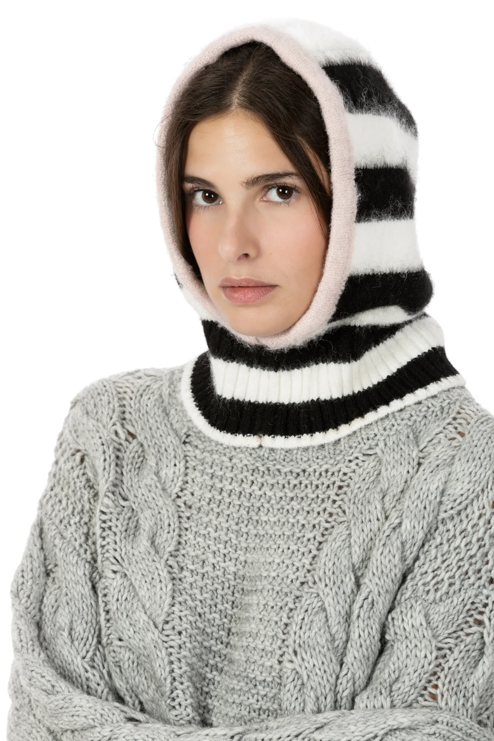 Balaclava in maglia rasata a righe bianche e nere, realizzato con filato morbido e confortevole. Il fondo a coste assicura una perfetta aderenza, mentre il contorno a contrasto in rosa baby dona un tocco femminile e originale. Un accessorio caldo e di tendenza, ideale per completare look urbani e sportivi nelle giornate più fredde.