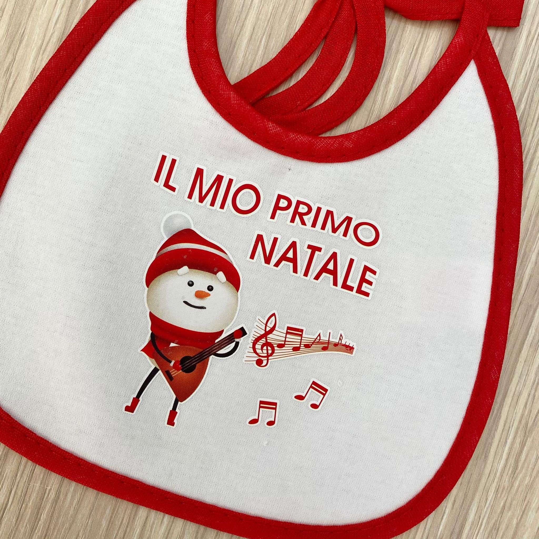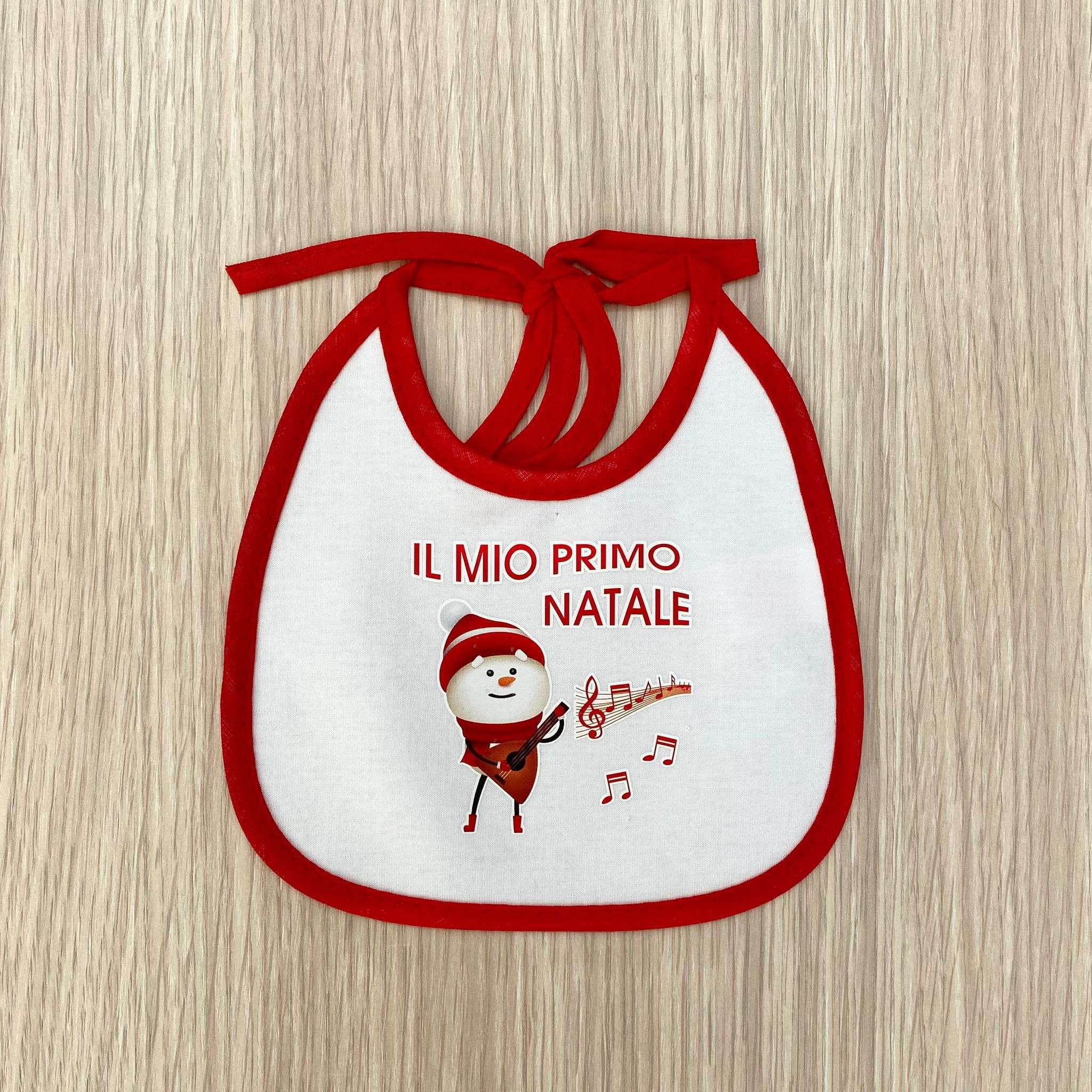 Bavetta neonato/a in cotone, di colore bianco e rosso con disegno e scritta “Il mio primo Natale” di vari colori. Misura: 16×17 cm. 100% cotone.
