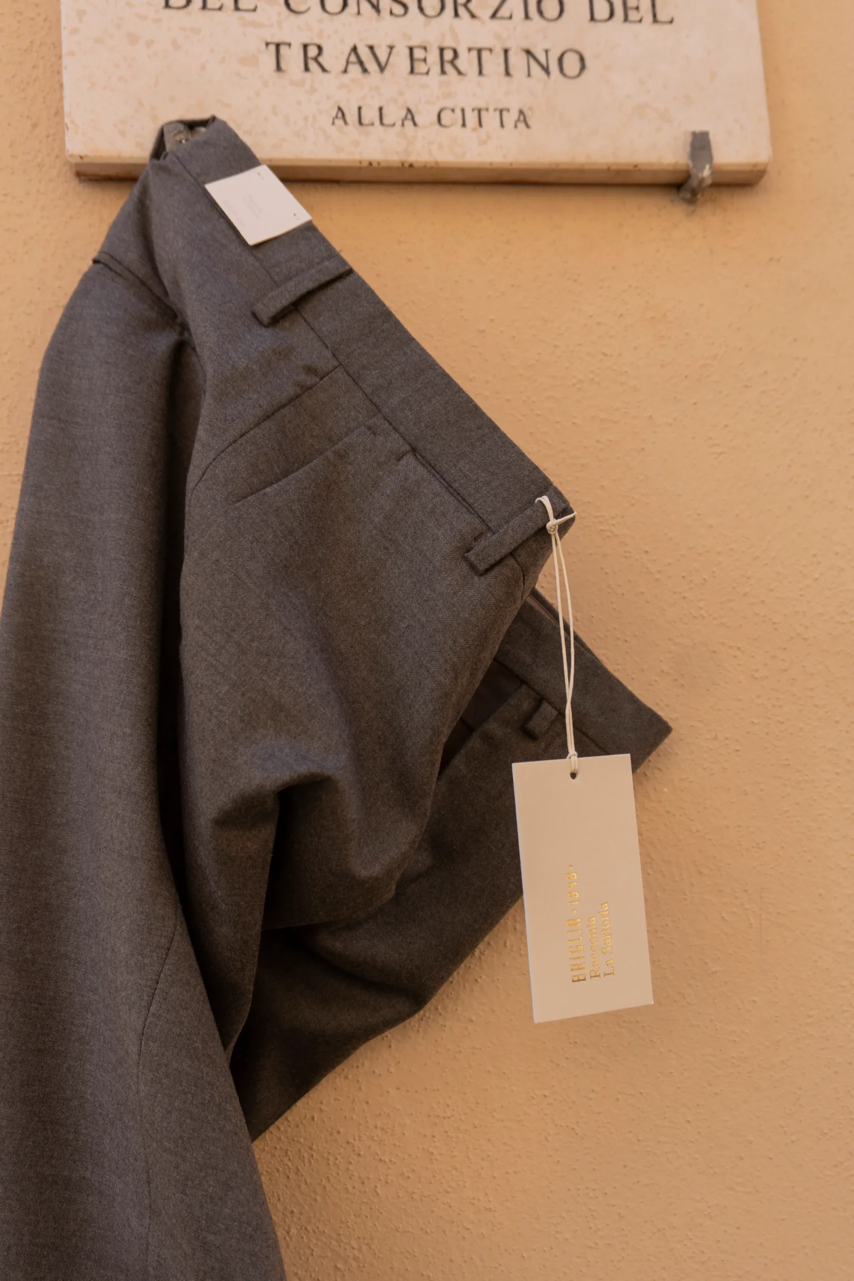 Pantalone Tasca America in Pura Lana Questo capo fa parte della Linea “Racconta la storia” Dettagli: Chiusura con Zip. Tessuto :Pura lana. Vestibilità: Slim fit. Gamba: 81cm con risvolto. Fondo: 17,5 cm.