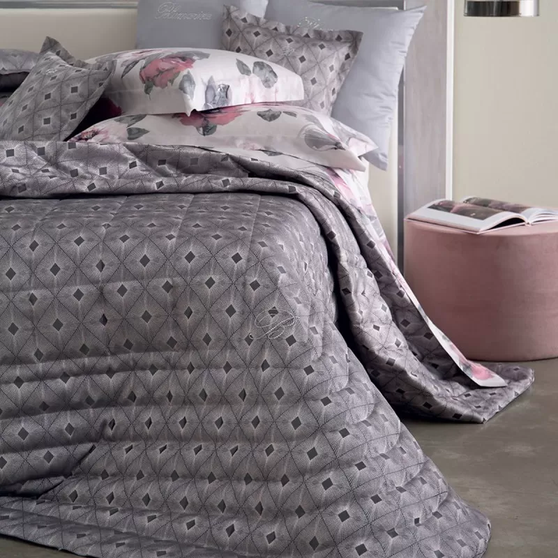 Calda trapunta matrimoniale con moderno disegno jacquard e logo Blumarine in cristalli.