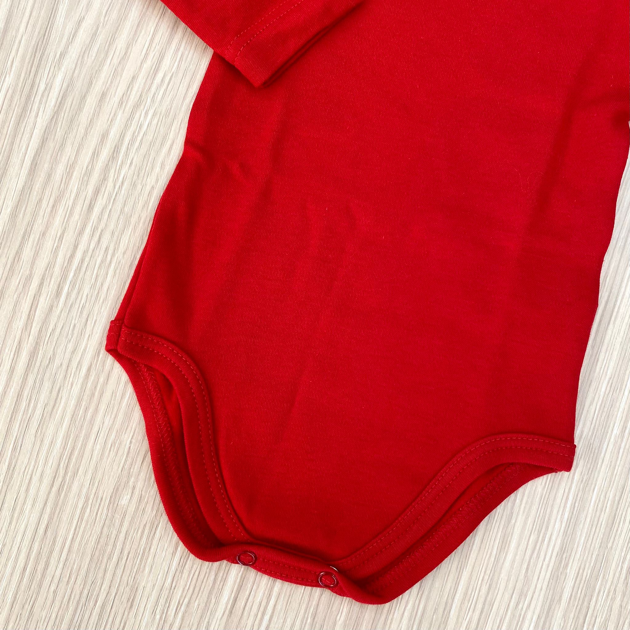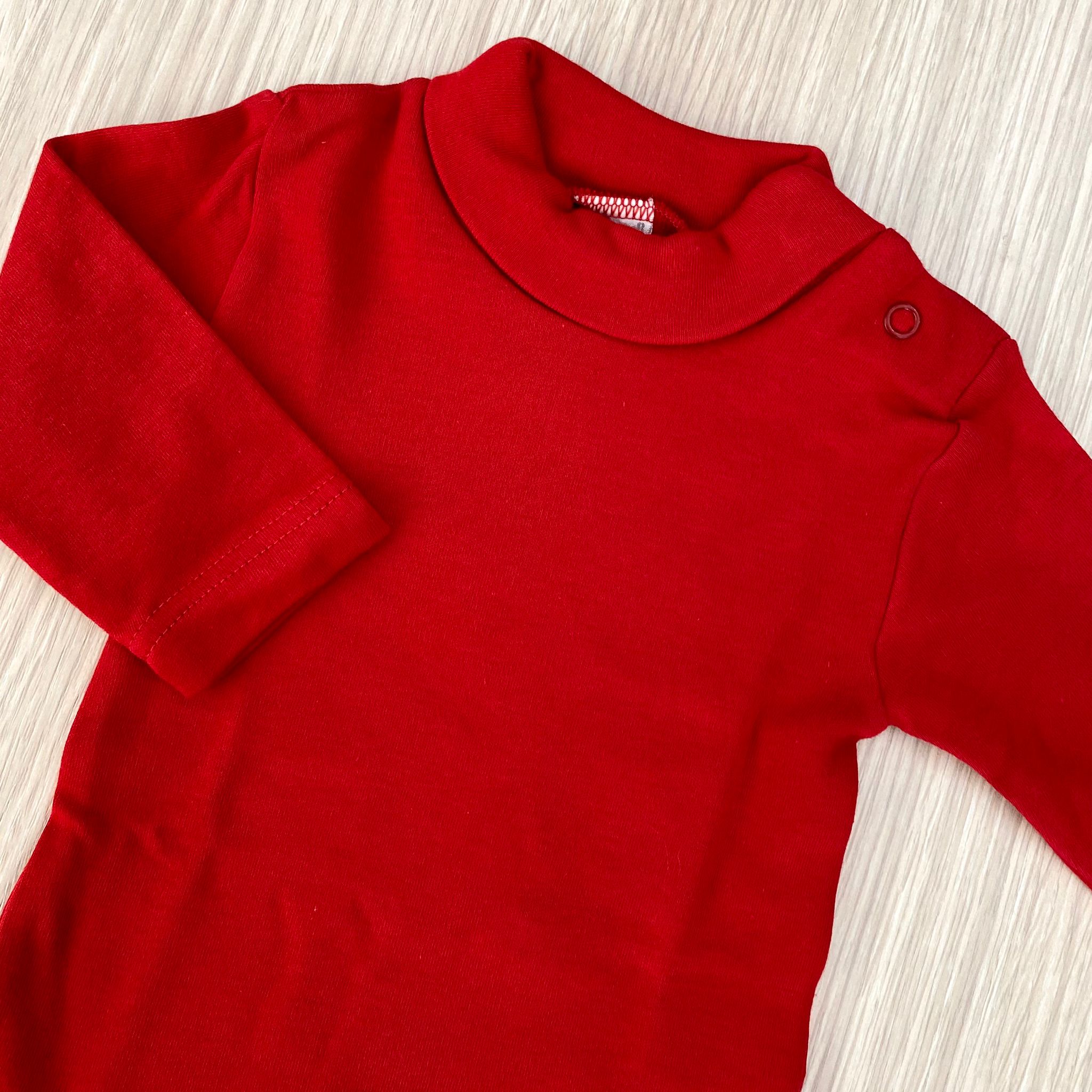 Body lupetto neonato/a, in caldo cotone leggermente felpato, di colore rosso. 3 Mesi: 62 cm. 6 Mesi: 68 cm. 9 Mesi: 74 cm. 18 Mesi: 86 cm. 24 Mesi: 92 cm. 3 Anni: 98 cm. 100% Cotone.