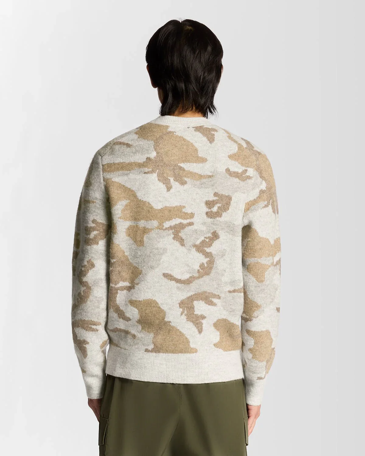 Questo maglione girocollo mimetico spazzolato offre una vestibilità rilassata con una finitura strutturata e un audace motivo mimetico, perfetto per uno stile rilassato con atteggiamento.