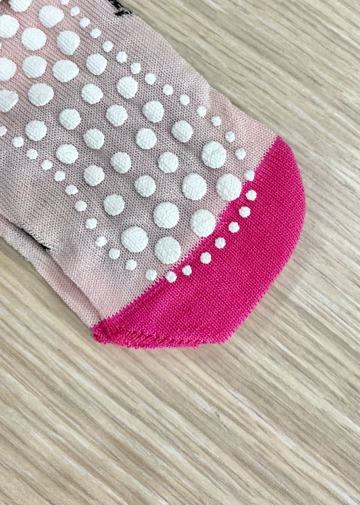 Calzino antiscivolo bambina, in morbido cotone, di colore rosa e fucsia con dettaglio antiscivolo di colore bianco. 80% Cotone. 15% Polyamide. 5% Elastane.