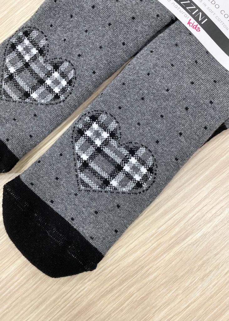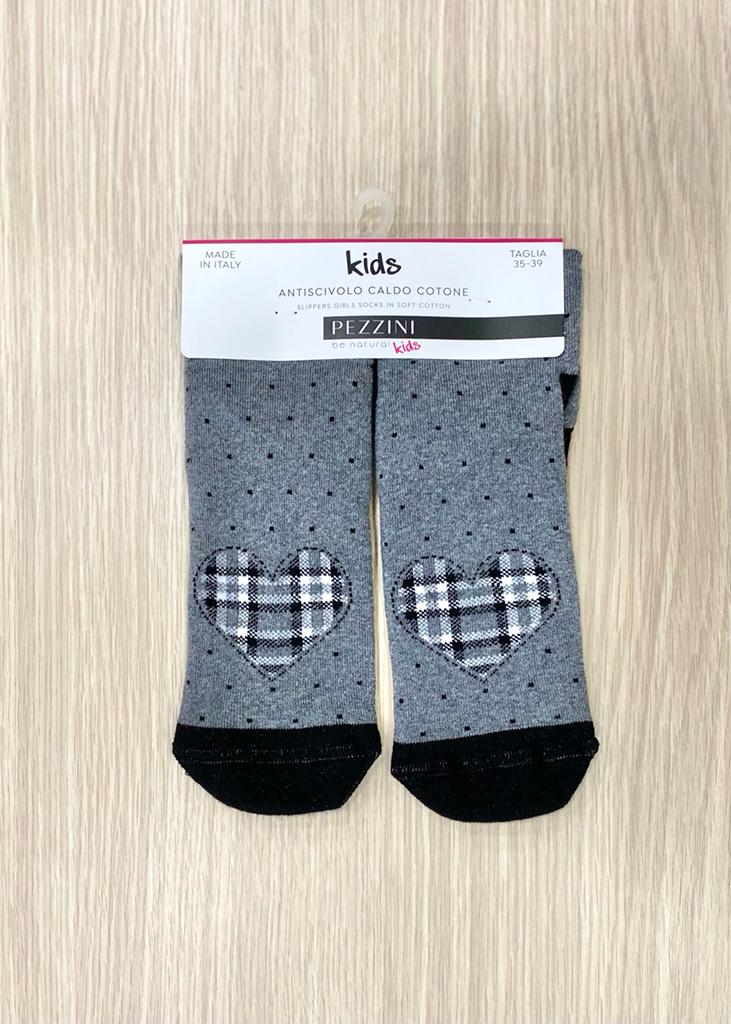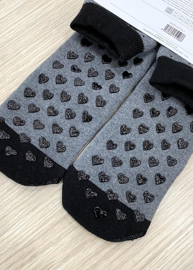 Calzino antiscivolo bambina/ragazza, in caldo cotone, di colore grigio e nero con antiscivolo a forma di cuore. 80% Cotone. 17% Poliammide. 3% Elastan.