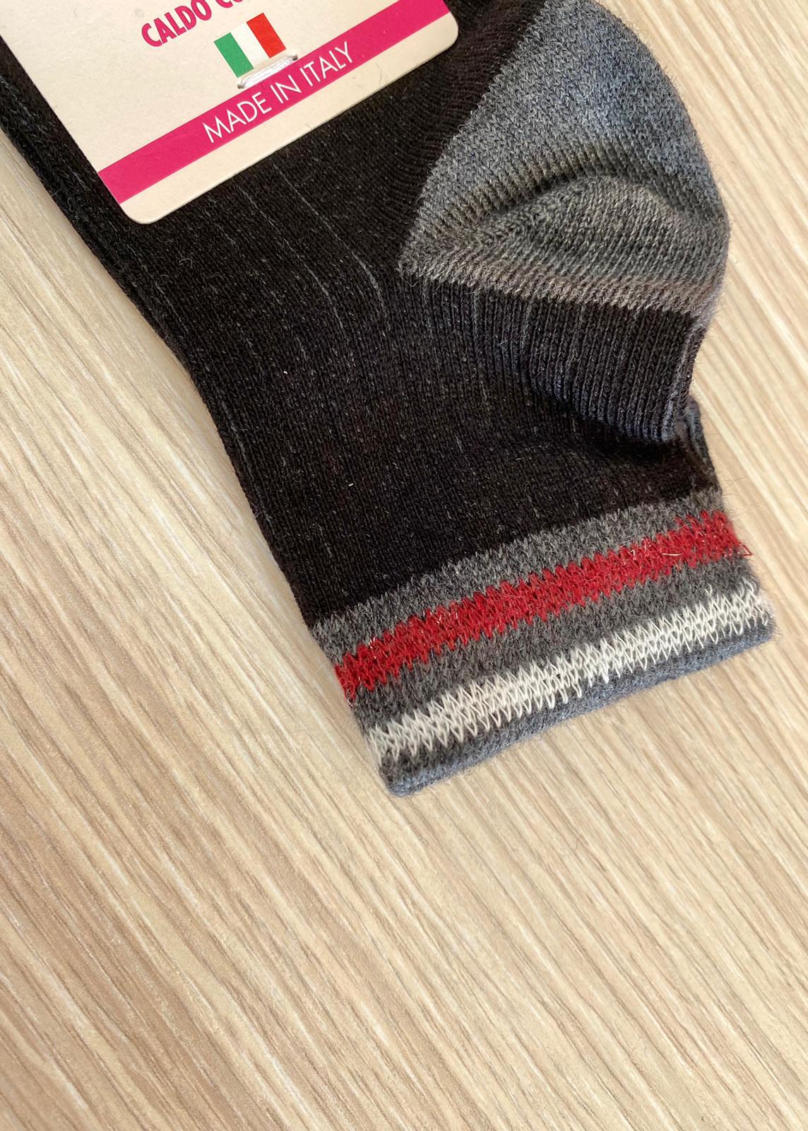 Calzino bambina in caldo cotone, di colore nero e bordeaux, con dettaglio di colore bianco. 90% Cotone. 7% Poliammide. 3% Elastan.