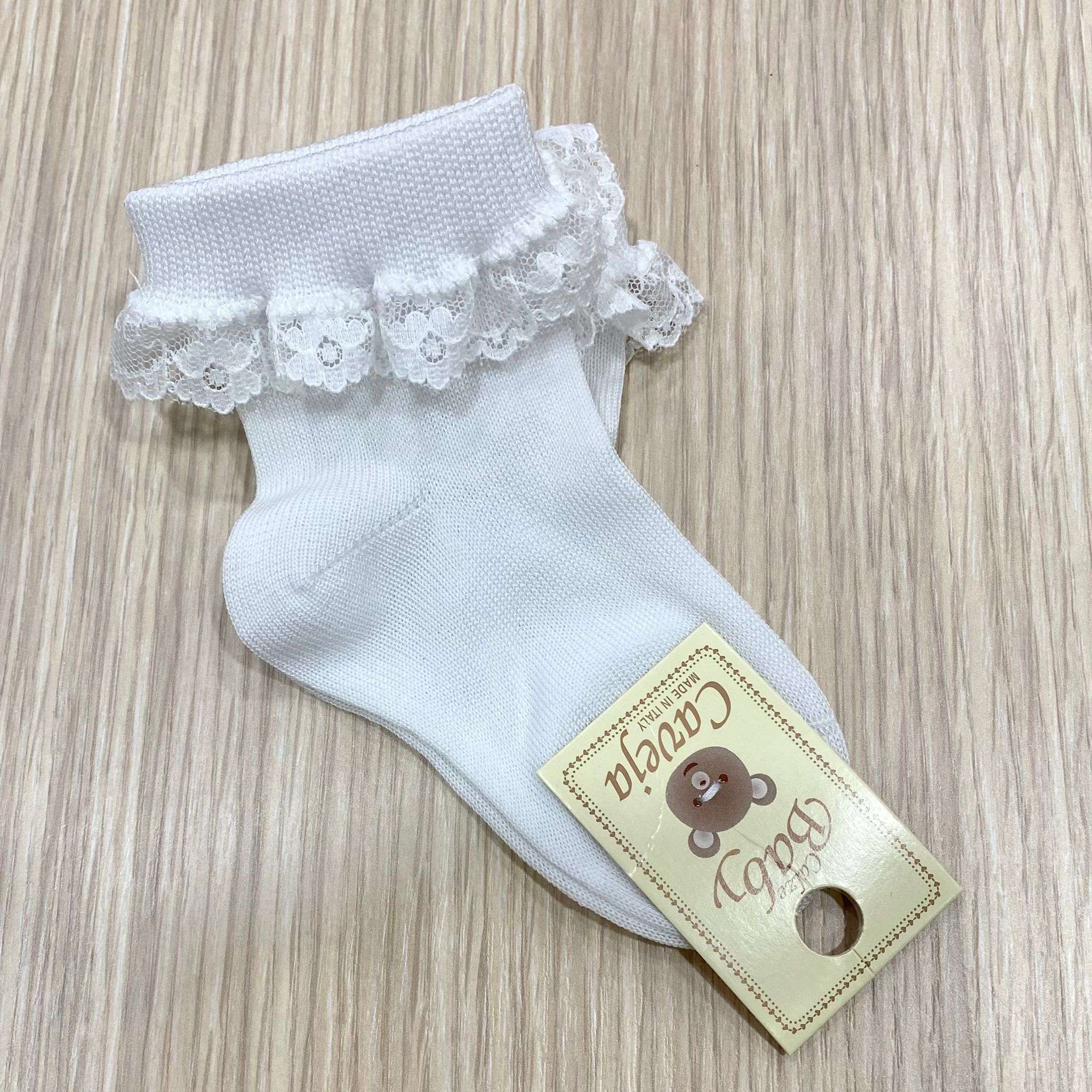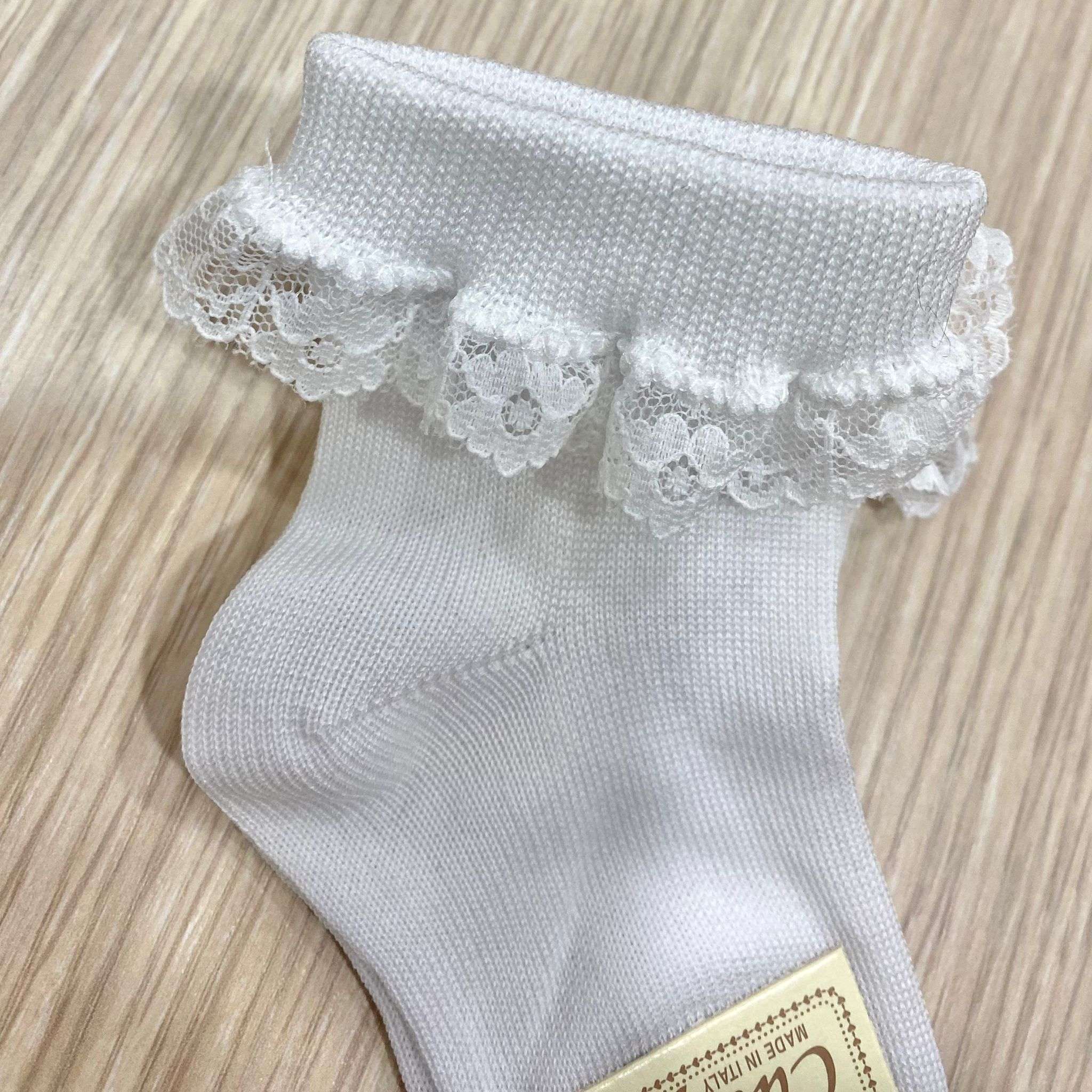 Calzino da cerimonia bambina in cotone, di colore bianco, con dettaglio di riccetto in macramè. 75% Cotone. 25% Poliammide.