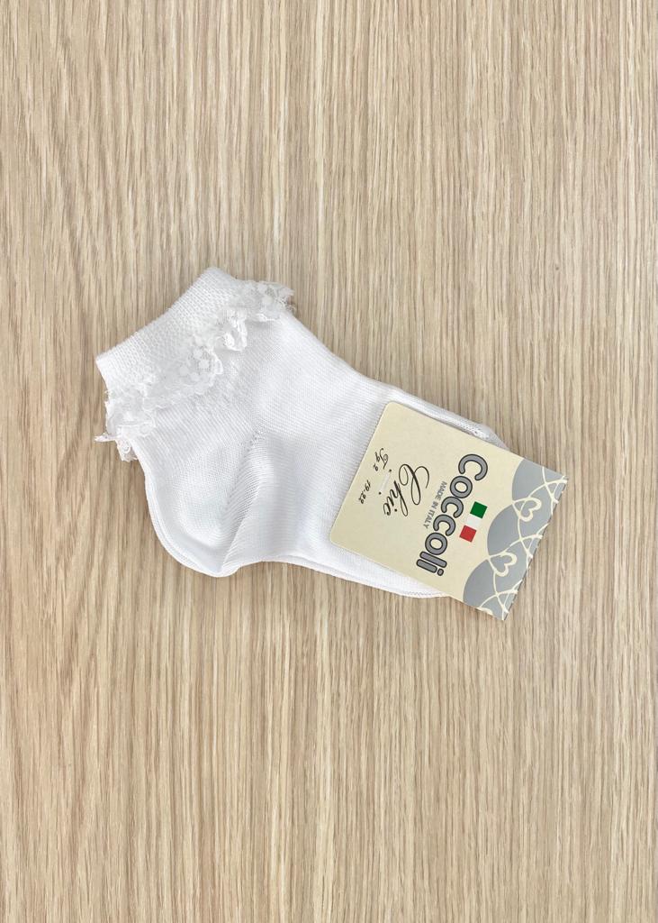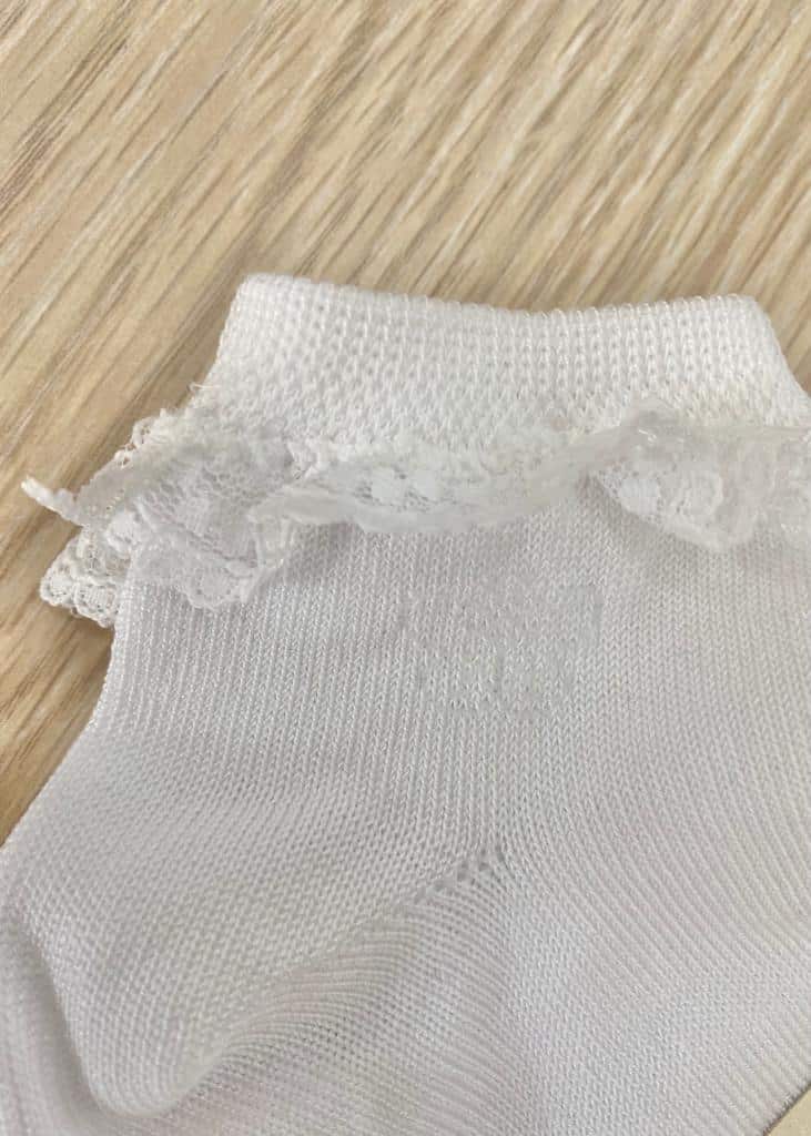 Calzino da cerimonia bambina in cotone, di colore bianco, con dettaglio di riccetto in macramè. 87% Cotone. 10% Poliammide. 3% Elastan.