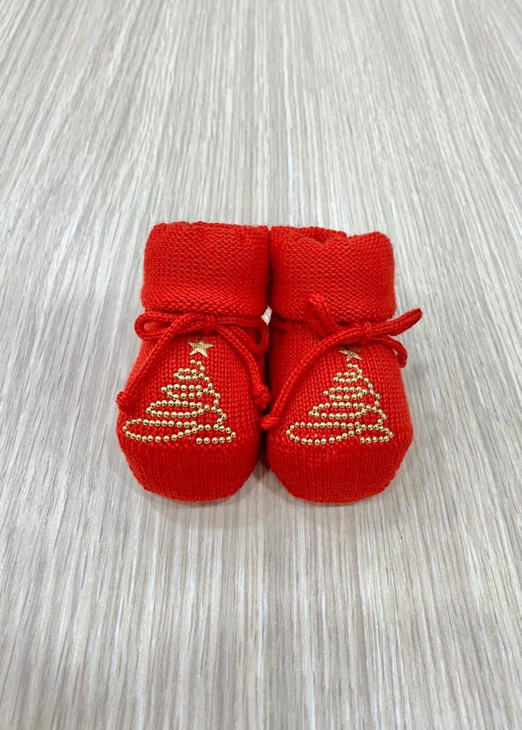 Calzino natalizio in morbida lana, di colore rosso, con dettagli di colore oro. Taglia Unica: 0/3 Mesi. 100% Lana.
