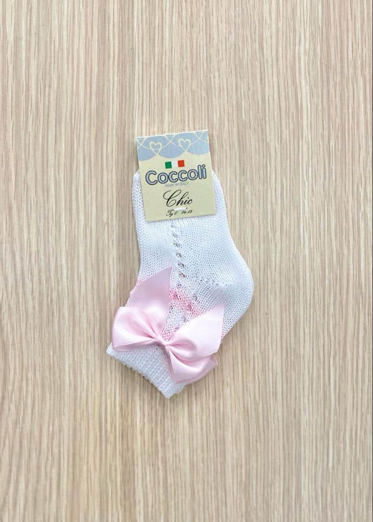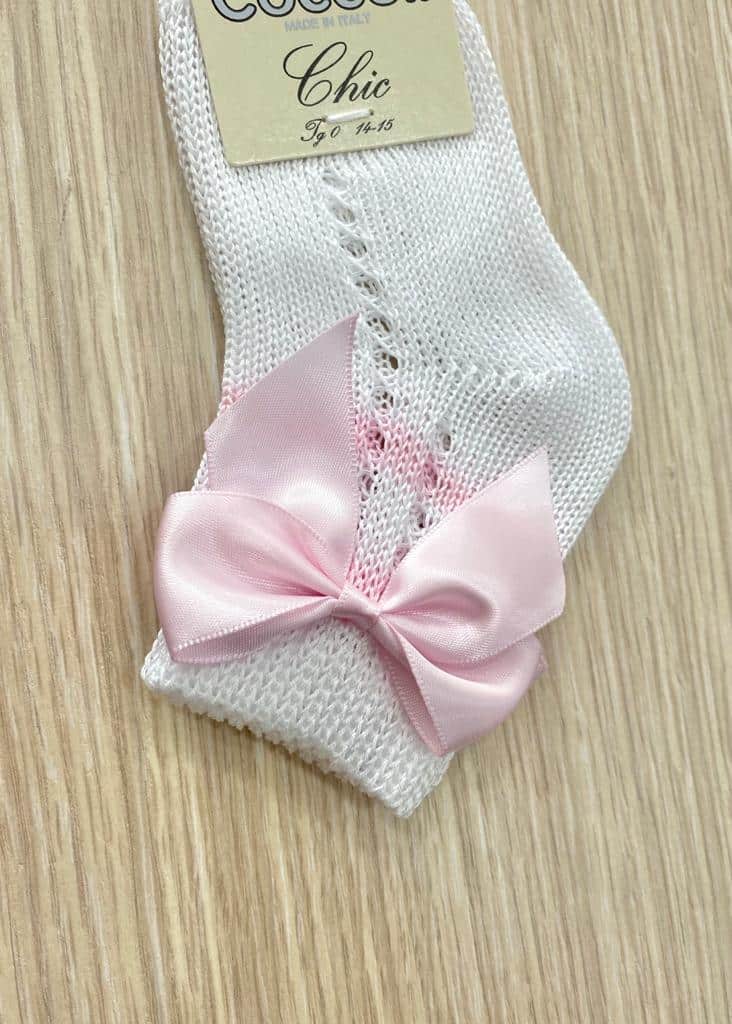 Calzino neonata/bambina in morbido filo makò di cotone, di colore bianco, con fiocco laterale in raso di colore rosa. 100% Cotone.