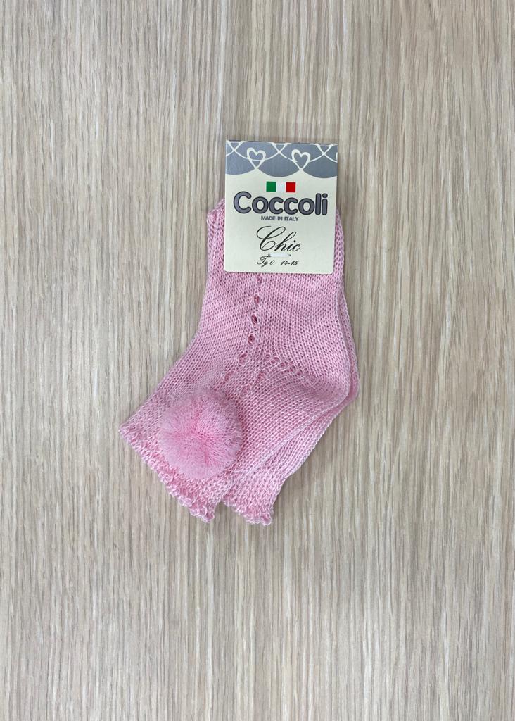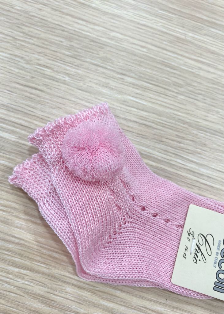 Calzino neonata/bambina in morbido filo makò di cotone, di colore rosa, con pom pon laterali. 100% Cotone.
