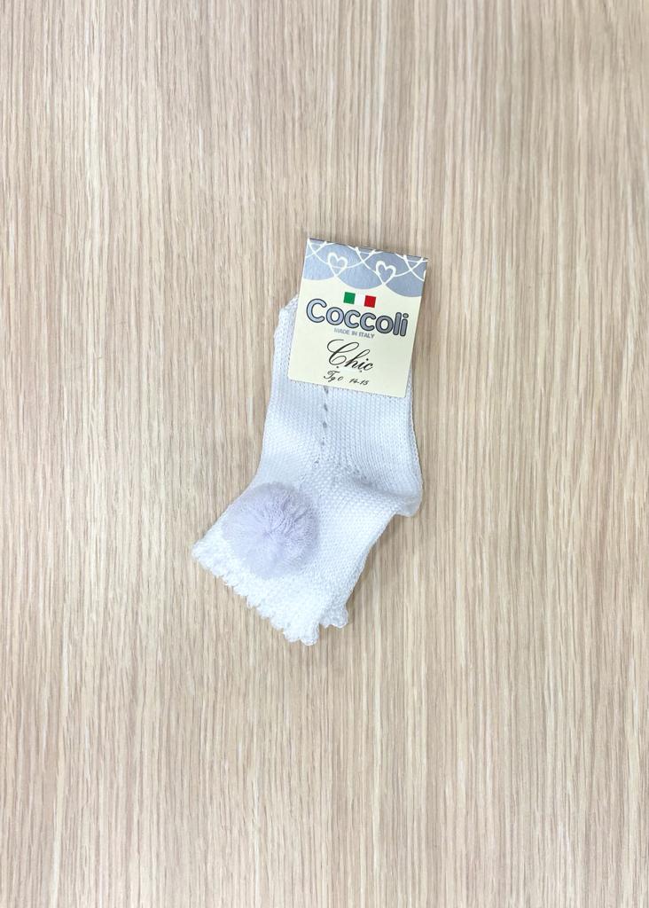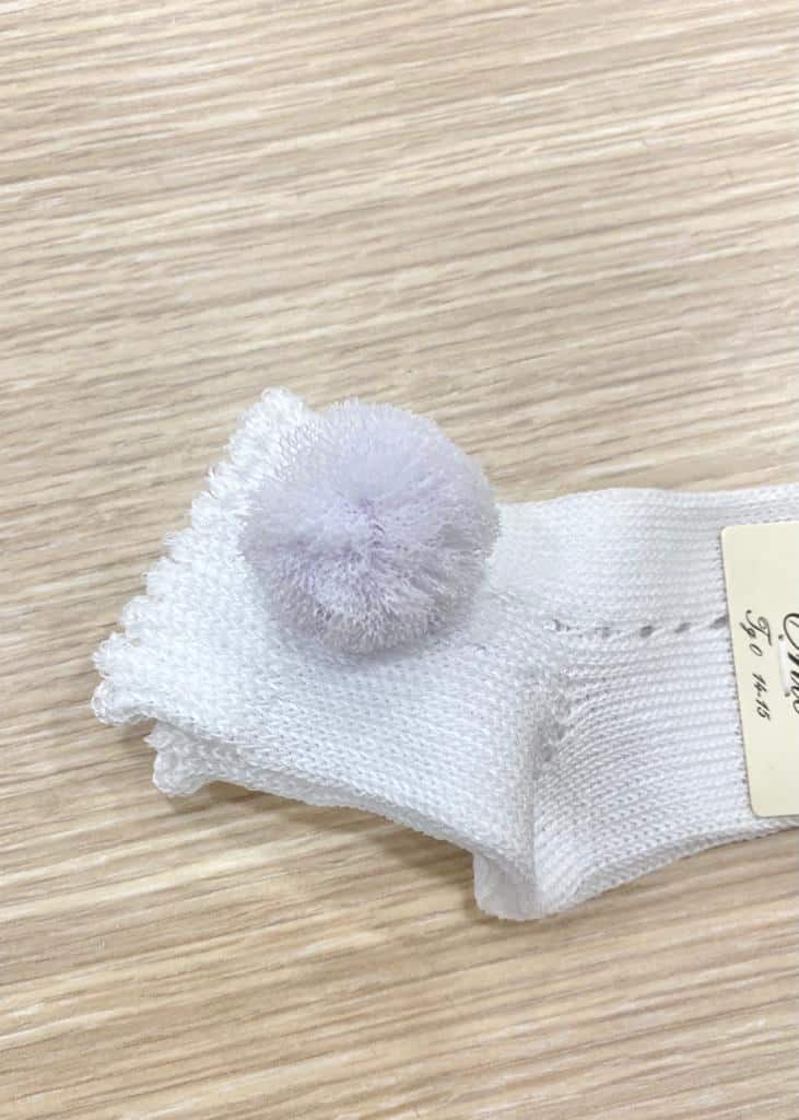 Calzino neonata/bambina in morbido filo makò di cotone, di colore bianco, con pom pon laterali. 100% Cotone.