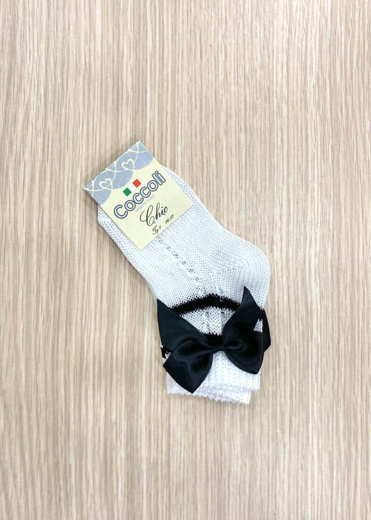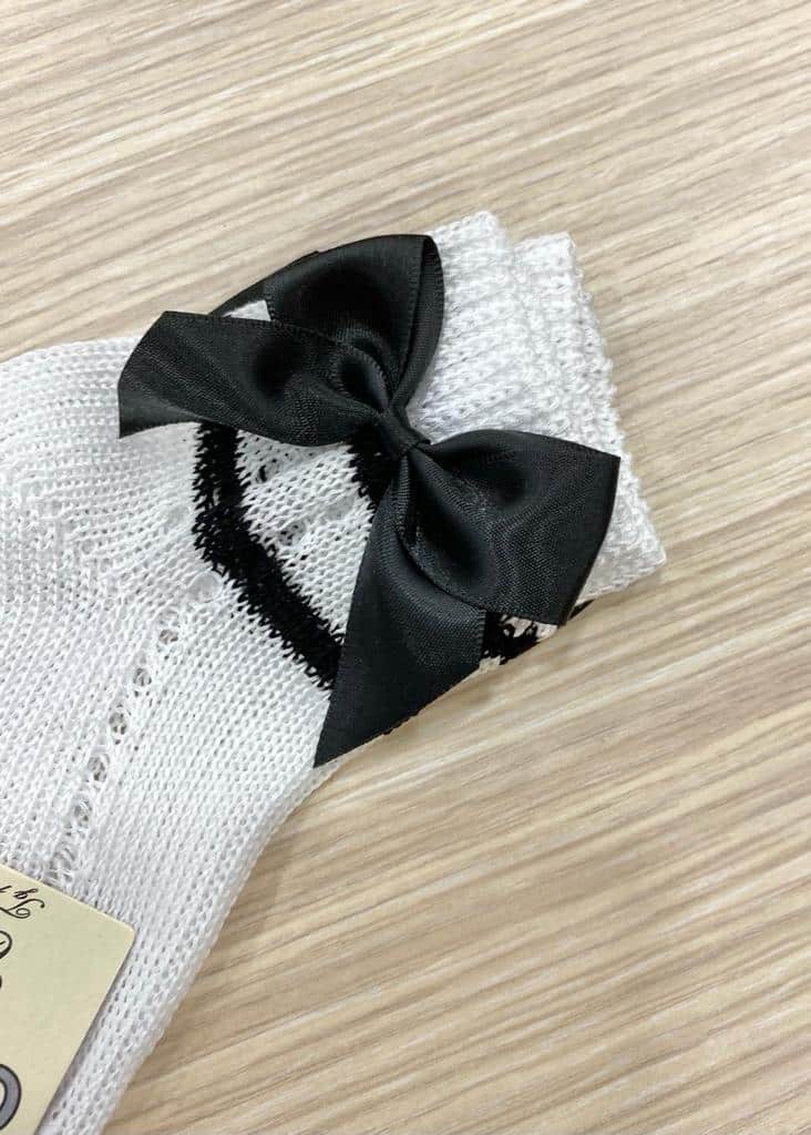 Calzino neonata/bambina in morbido filo makò di cotone, di colore bianco, con fiocco laterale in raso di colore nero. 100% Cotone.