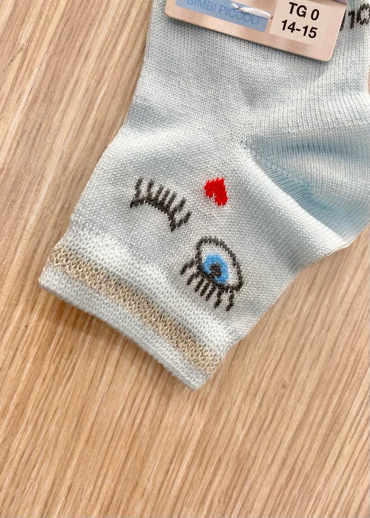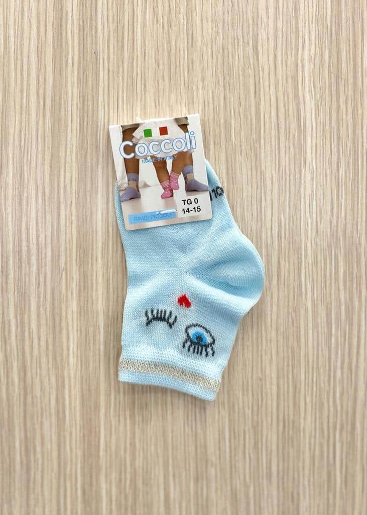 Calzino neonata in morbido cotone, di colore azzurro con dettagli di vari colori e filo argentato. 95% Cotone. 3% Poliammide. 2% Elastan.
