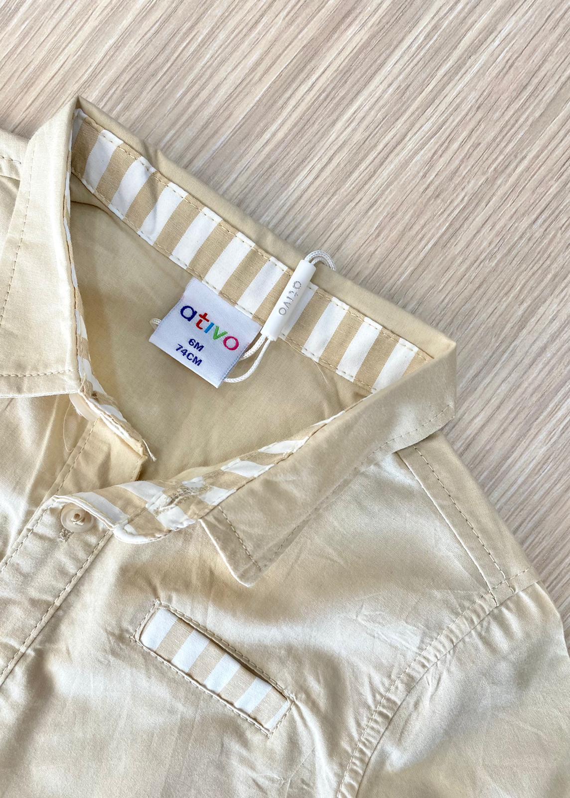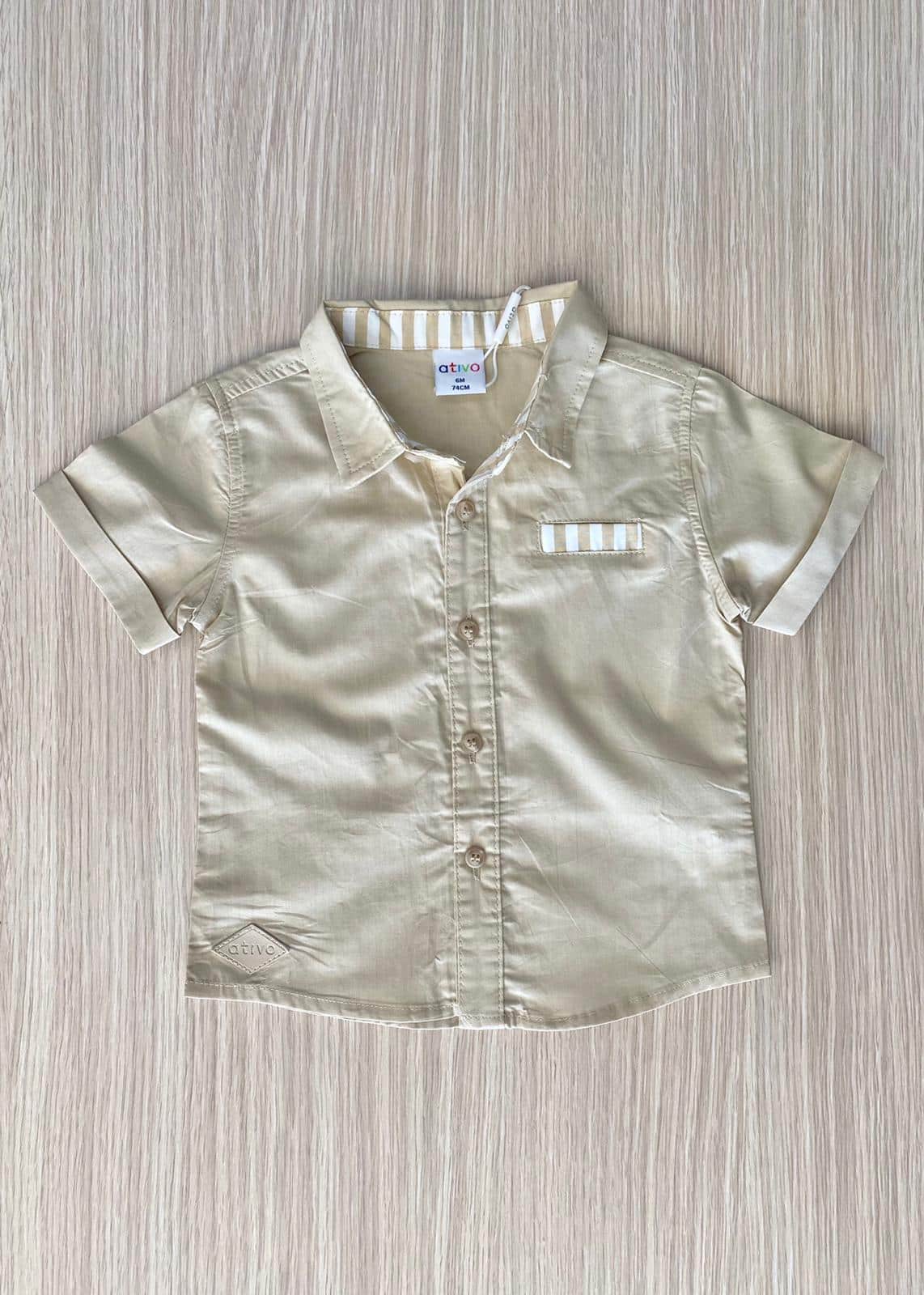Camicia bambino in cotone, di colore beige e bianco, con finto taschino. 100% Cotone.