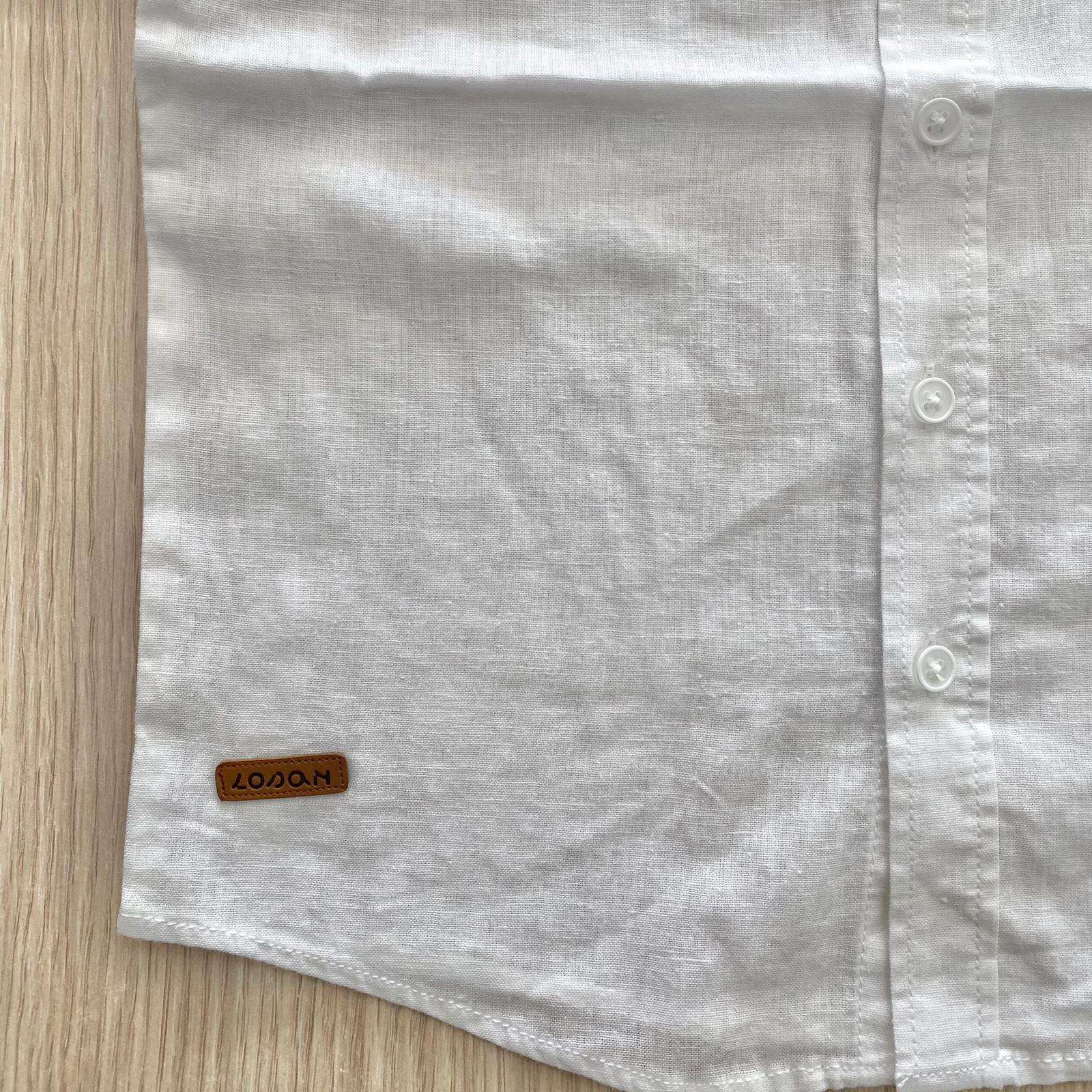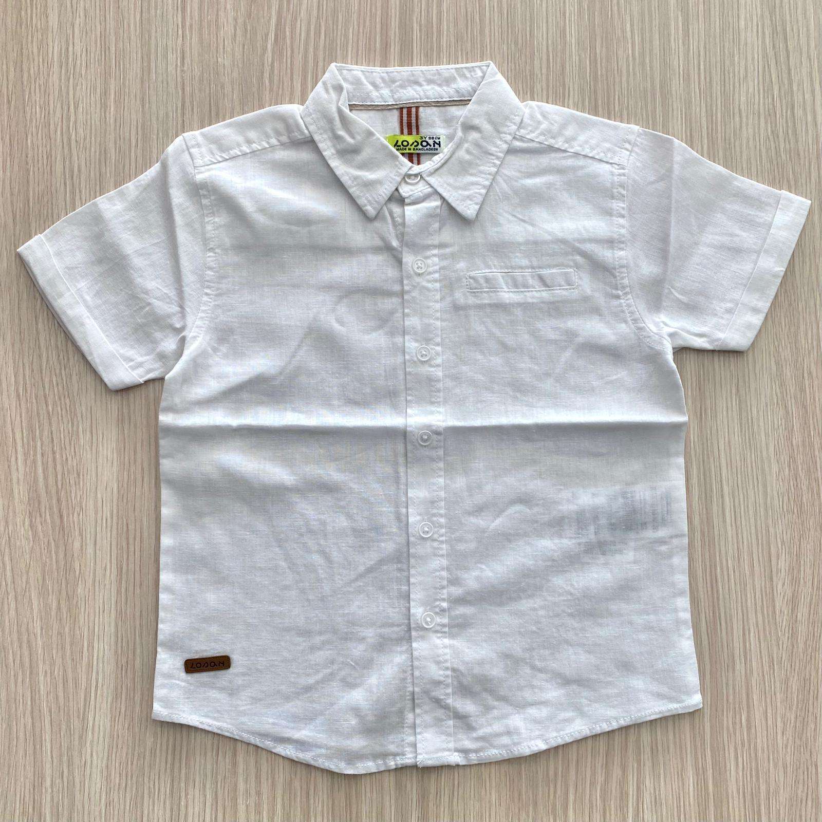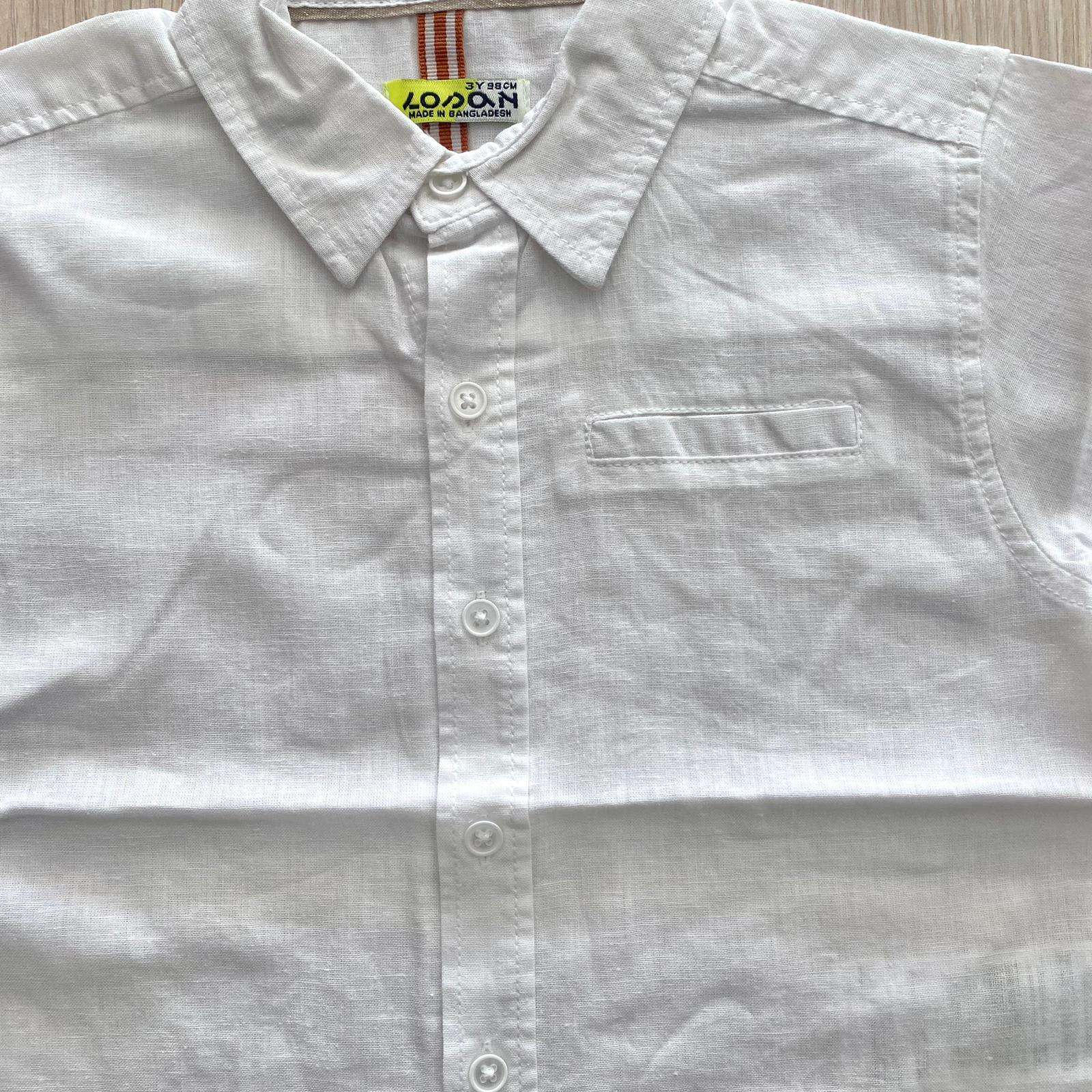 Camicia bambino in cotone misto lino, di colore bianco, con bottoncini e dettaglio di finto taschino. 70% Cotone. 30% Lino.