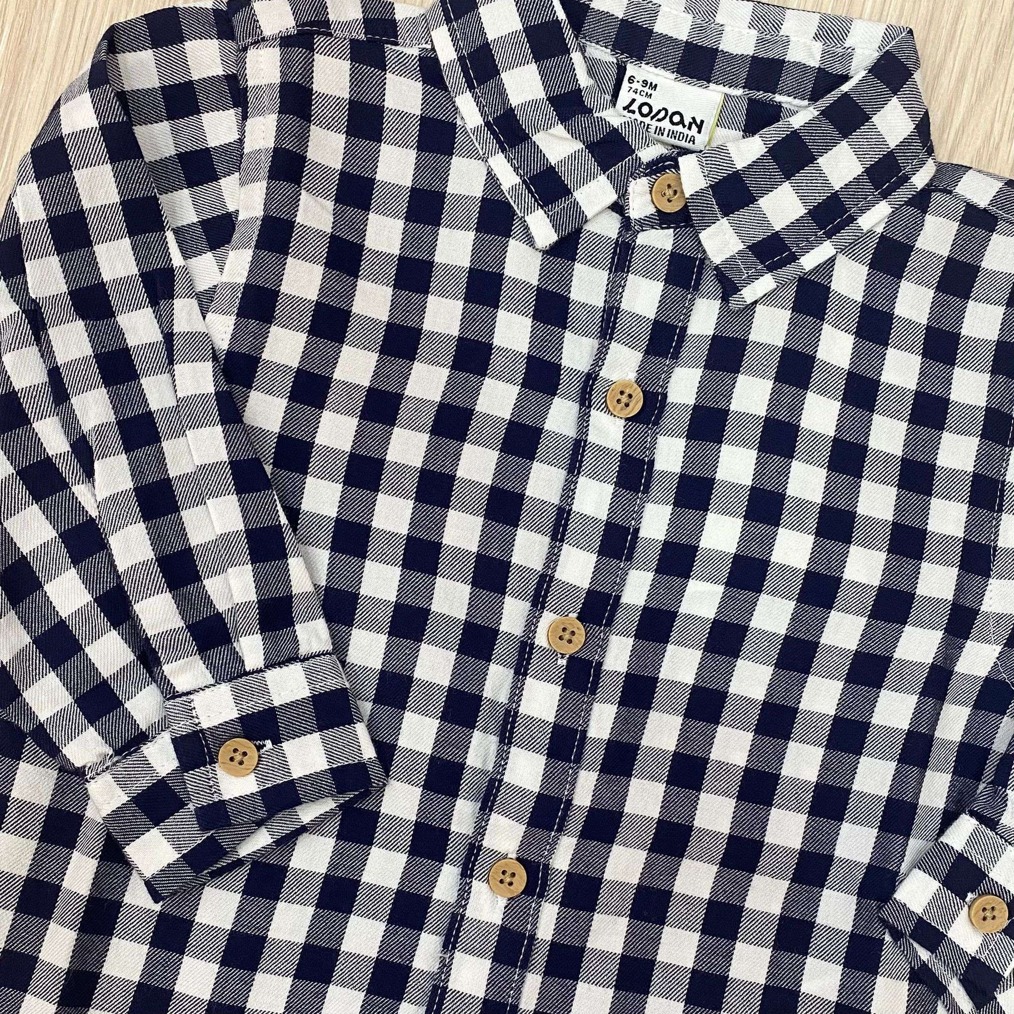 Camicia neonato/bambino in cotone, di colore blu e bianco. 100% Cotone.