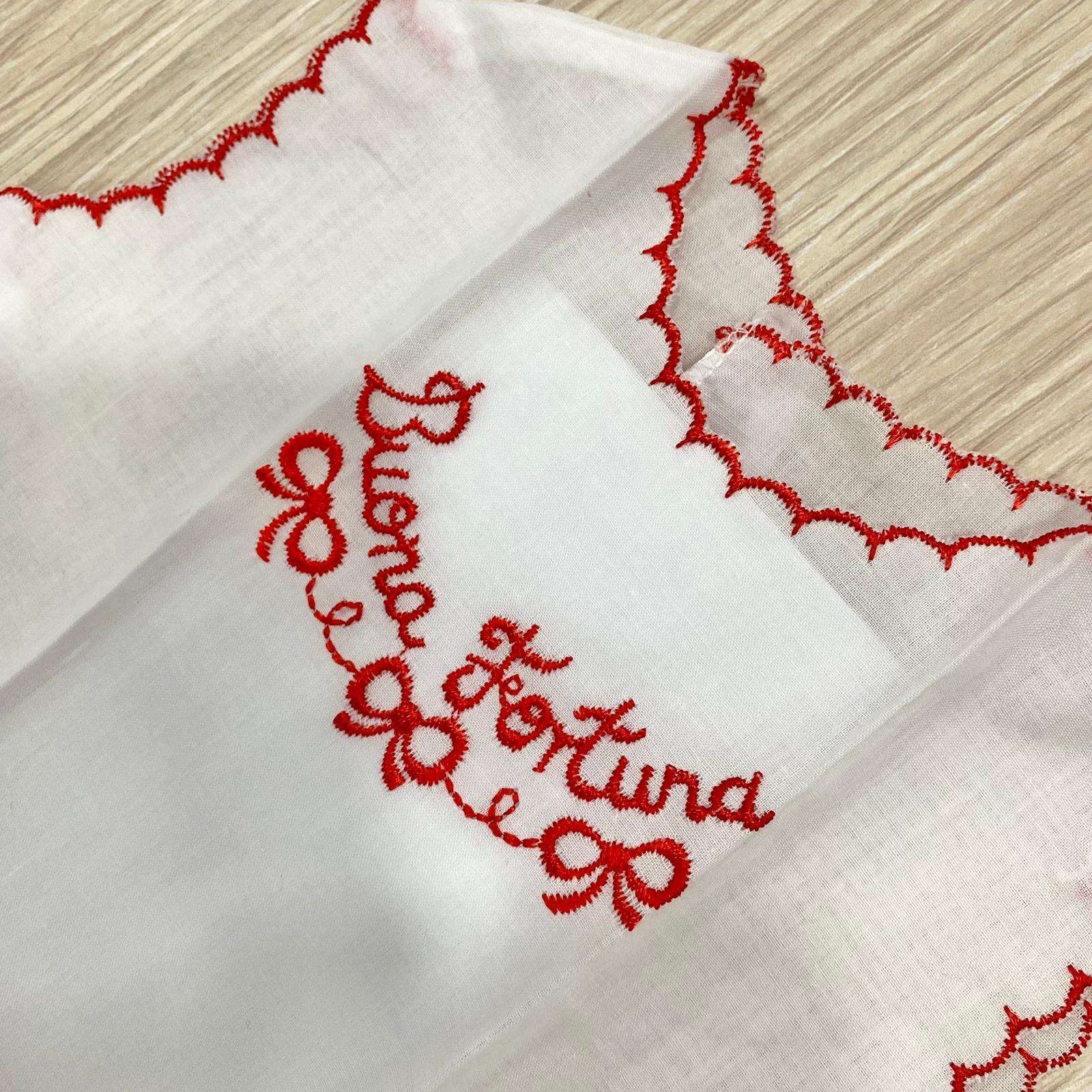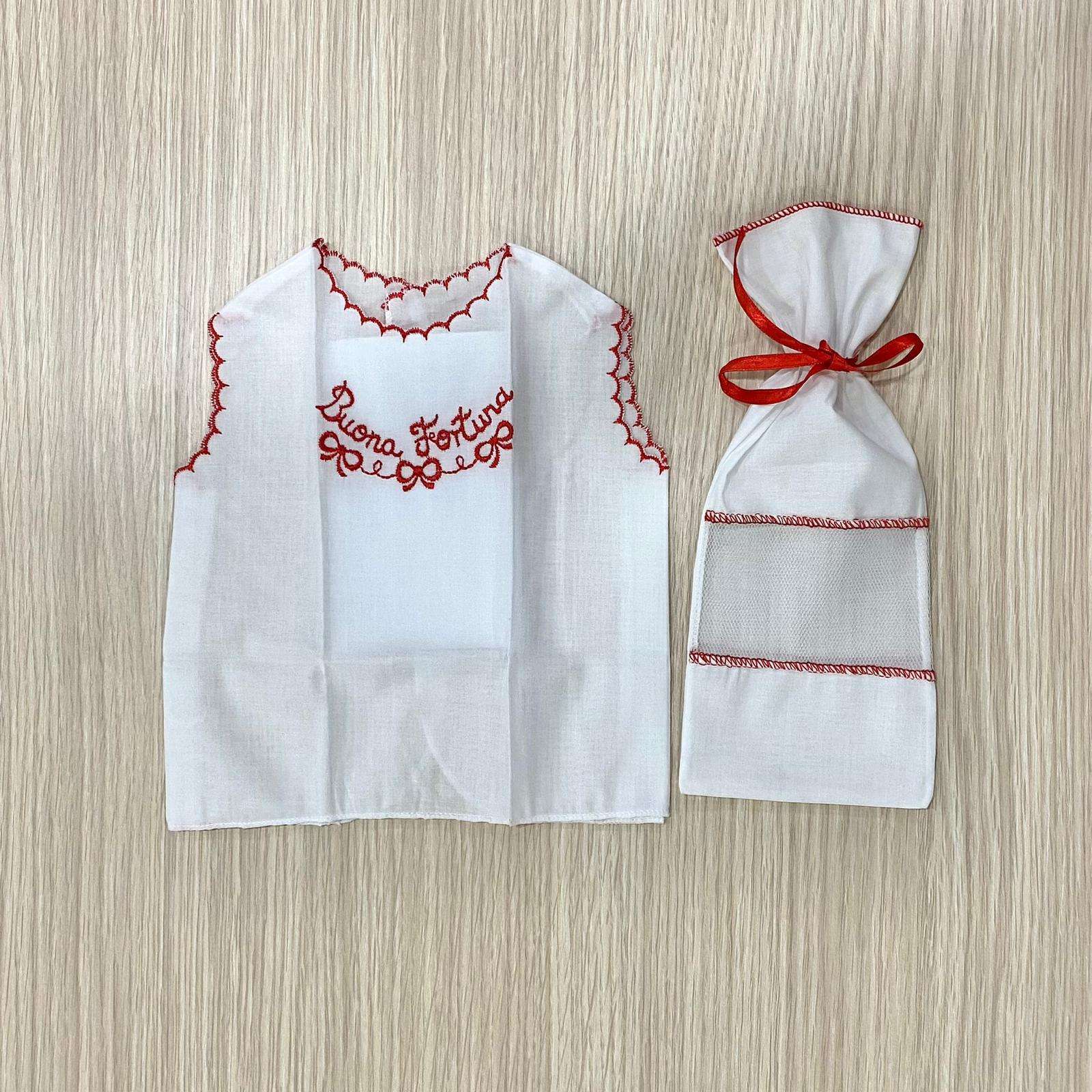 Camicina della fortuna con custodia sacchetto neonato/a di colore bianco e rosso. 100% Cotone.