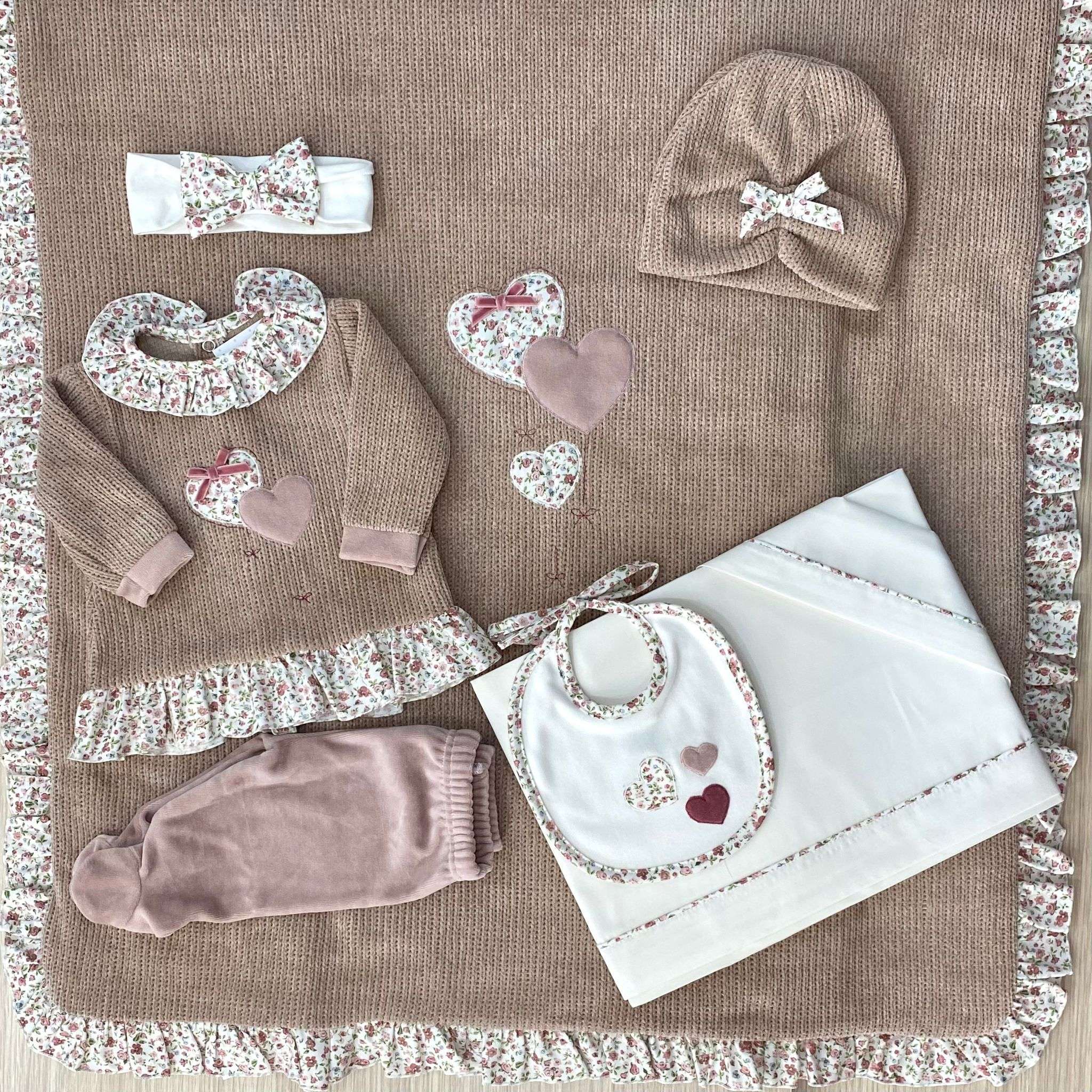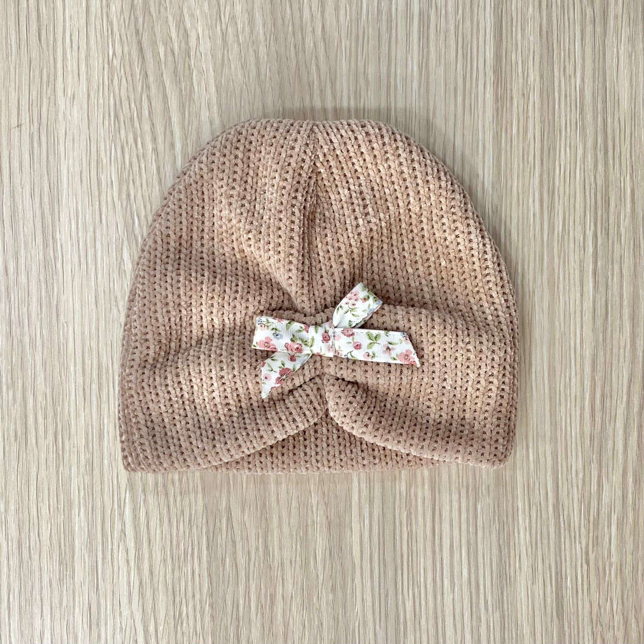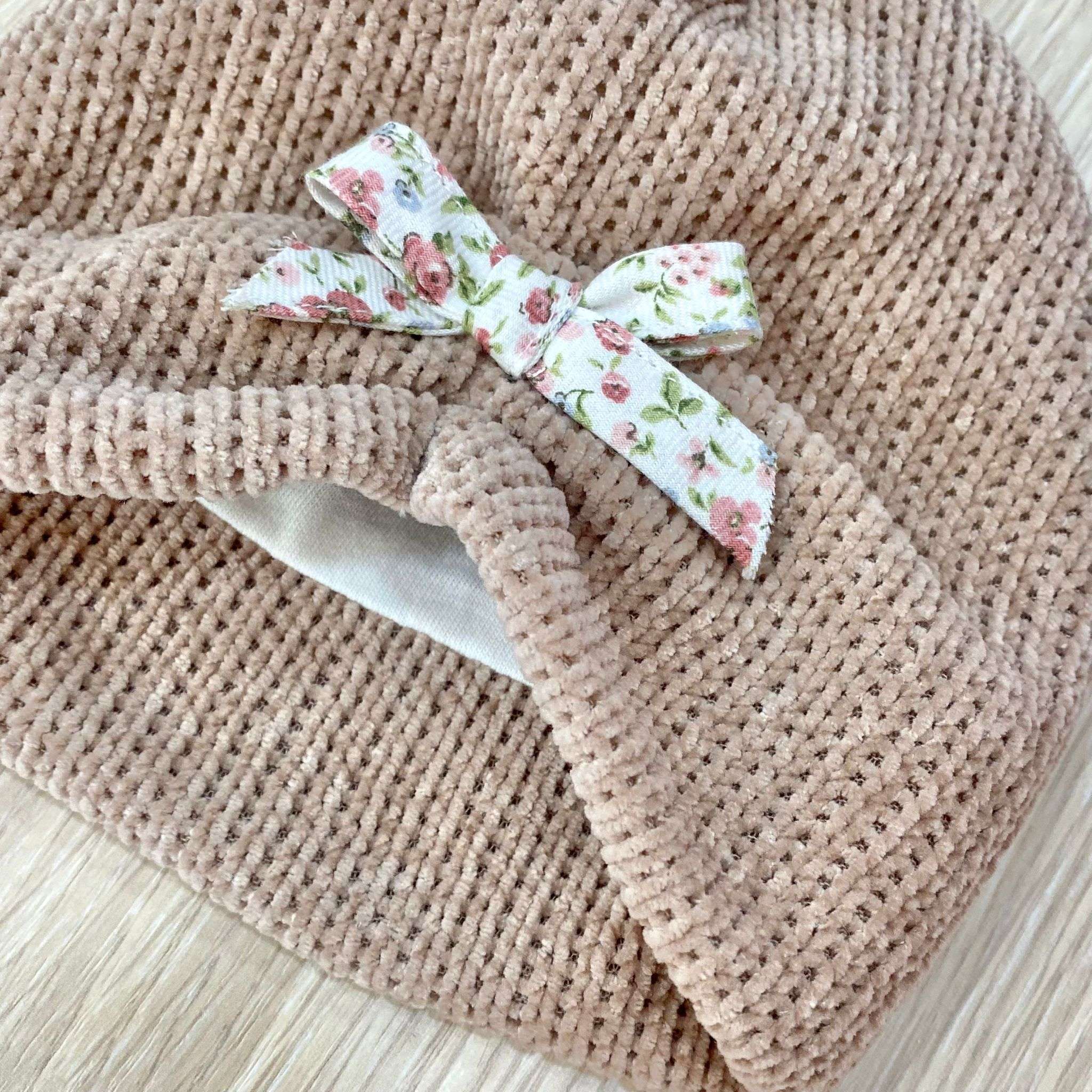 Cappellino neonata in ciniglia, di colore cipria con applicazione di fiocchetto in tessuto con disegni floreali di vari colori. Made in Italy.