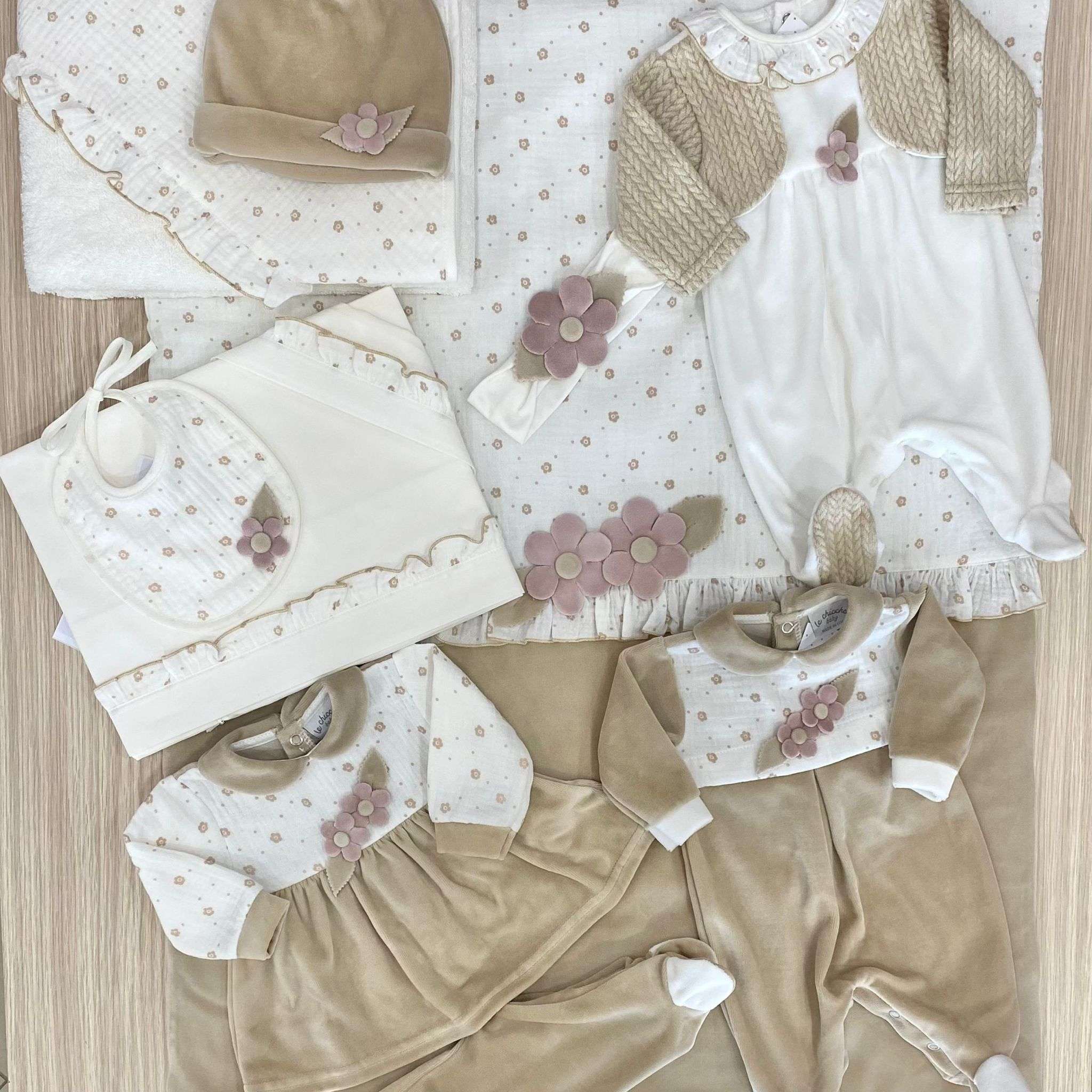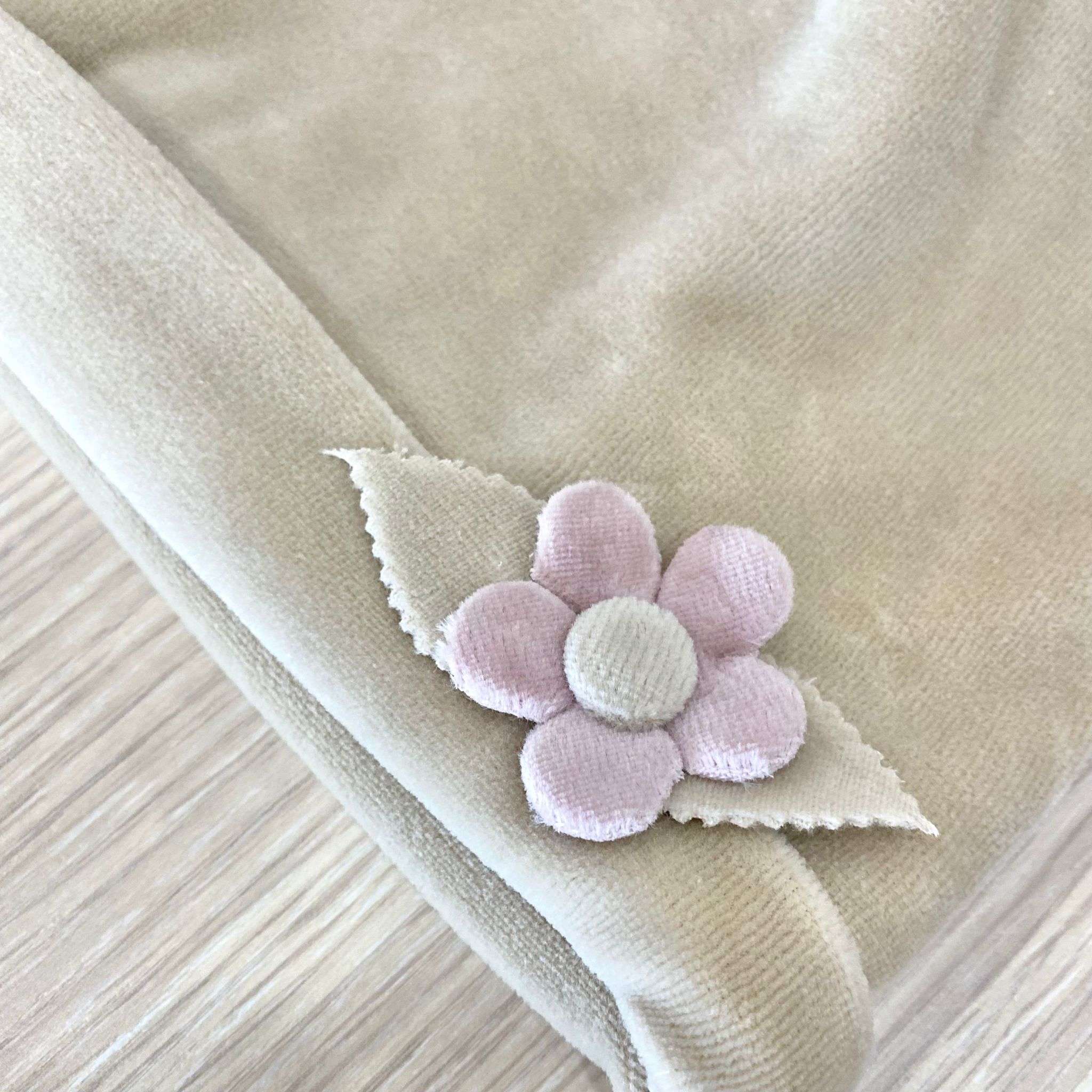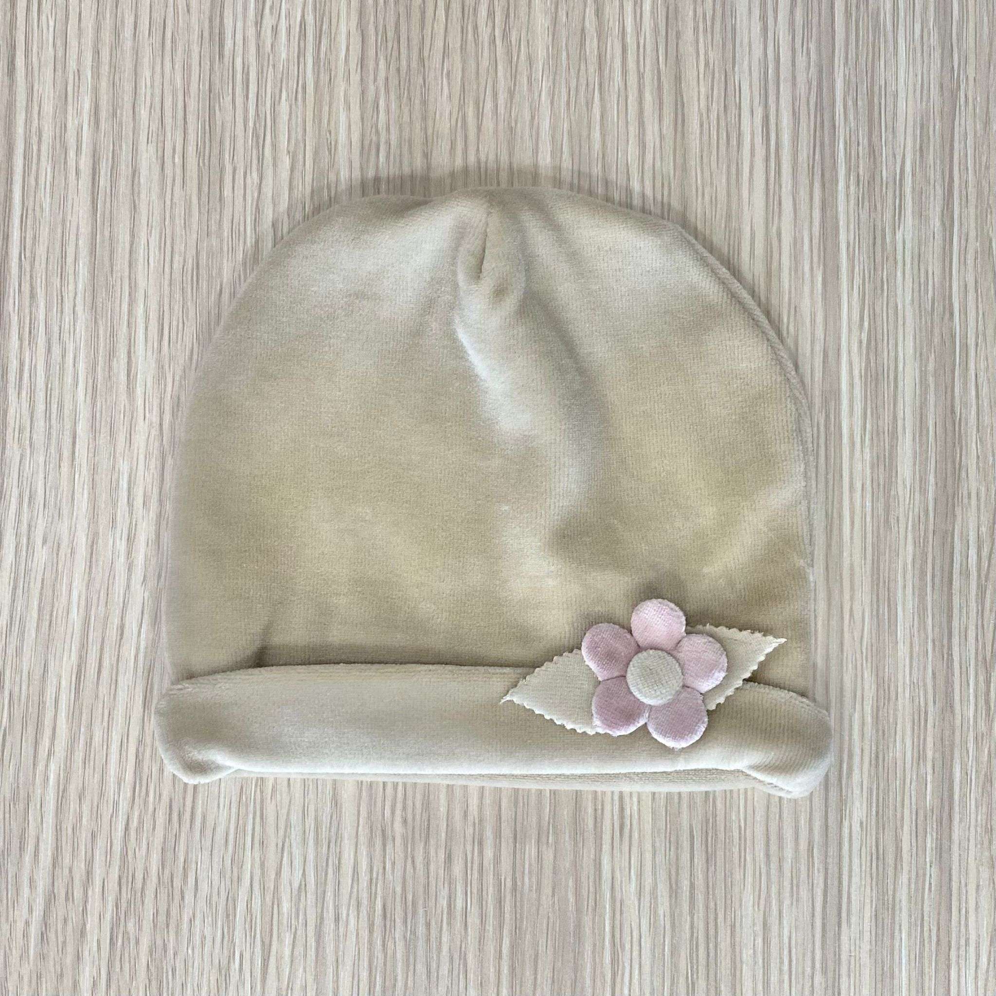 Cappellino neonata in ciniglia, di colore beige con applicazione di fiorellino in tessuto. Made in Italy.